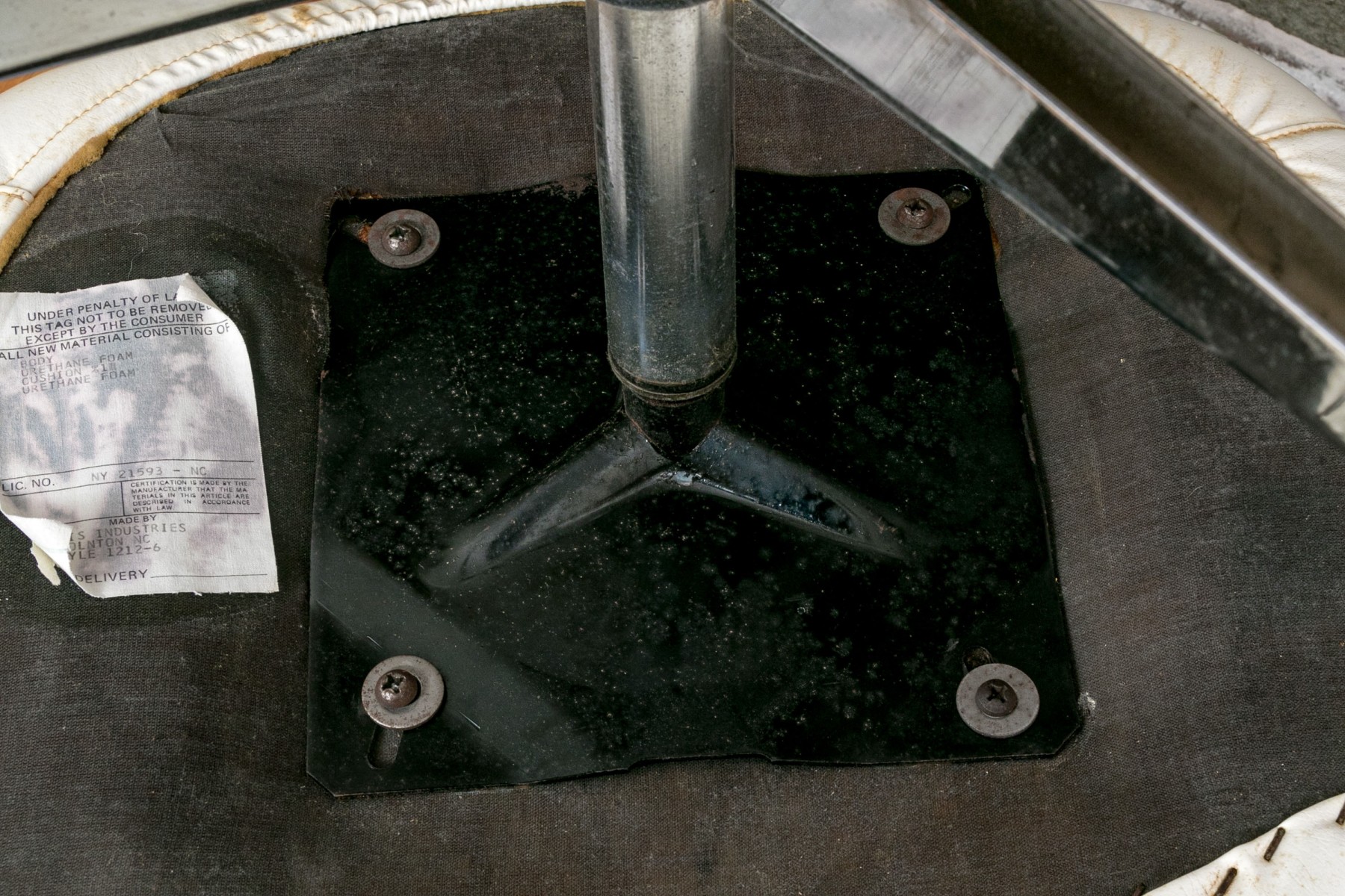 Condition: This chair displays some paint splatter on the back, wear to the cushion, and a few rust spots on the legs.