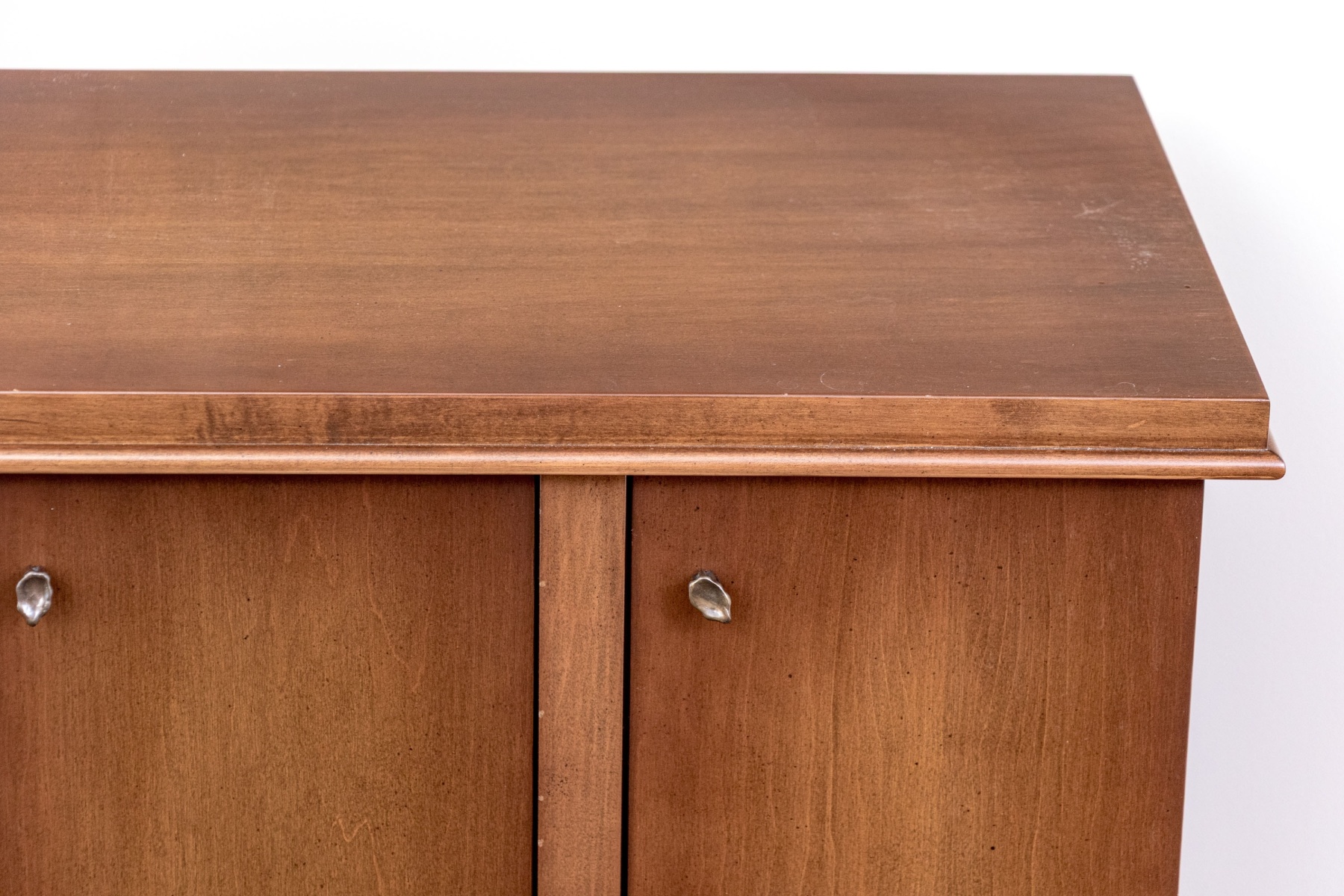 A stylish mid-century modern console sporting a sleek, rectangular form in an appealing walnut brown finish, showcasing a rectangular top with a short flared edge overhanging four cabinet doors adorned with striking naturalistic meal knobs. Raised on two plank legs.