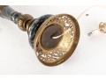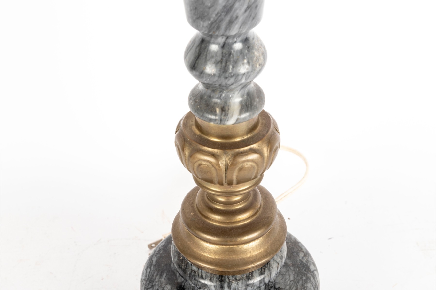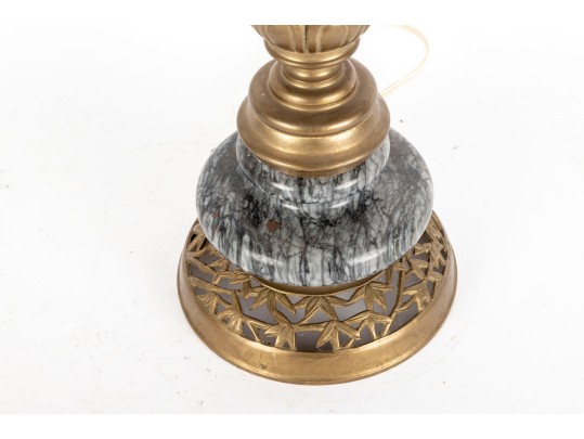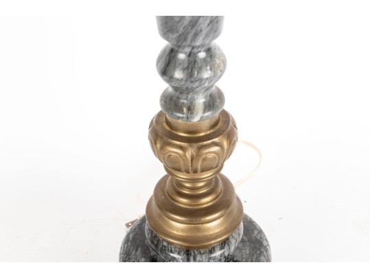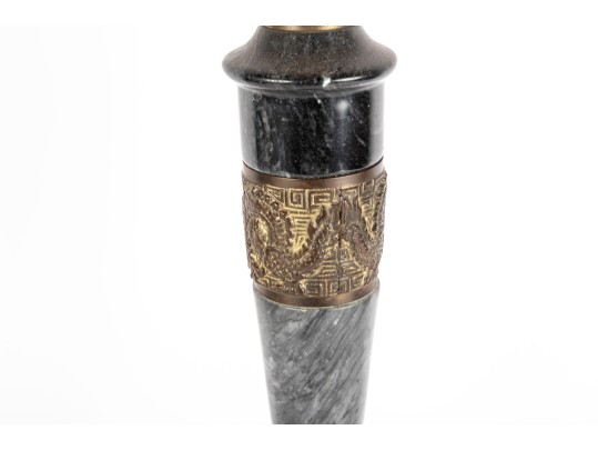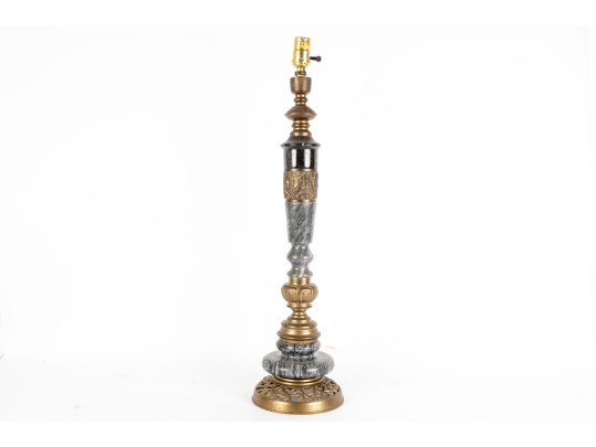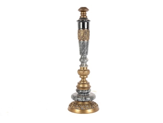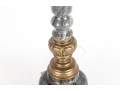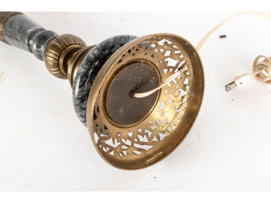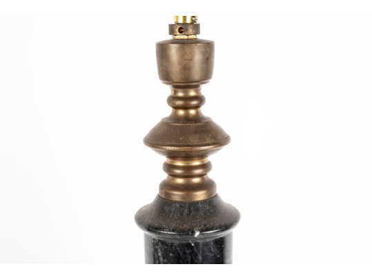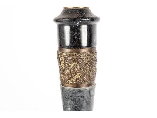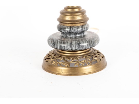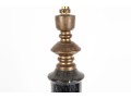 This Mid-Century Modern table lamp, attributed to the iconic designer James Mont, showcases his signature blend of Eastern influence and Hollywood Regency glam -- pairing embossed brass with marble columns. No harp, shade or finial included.