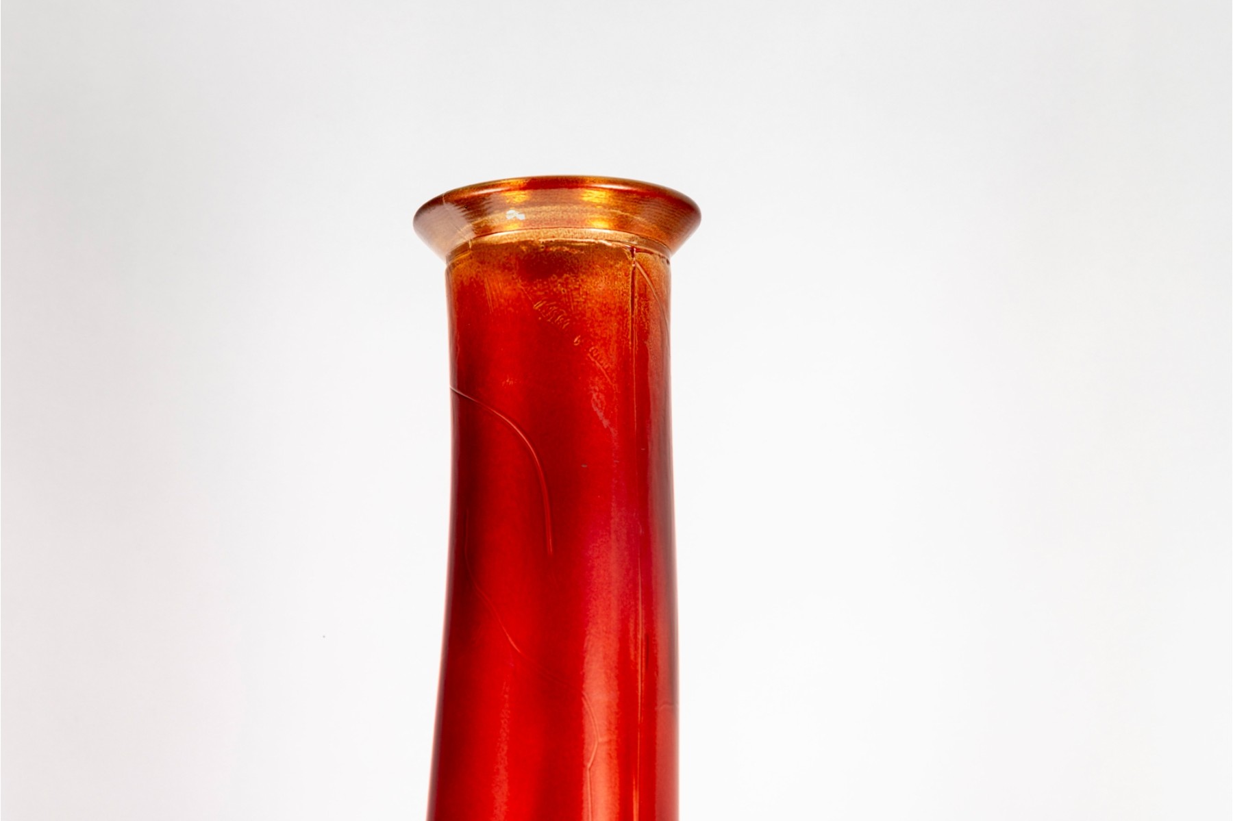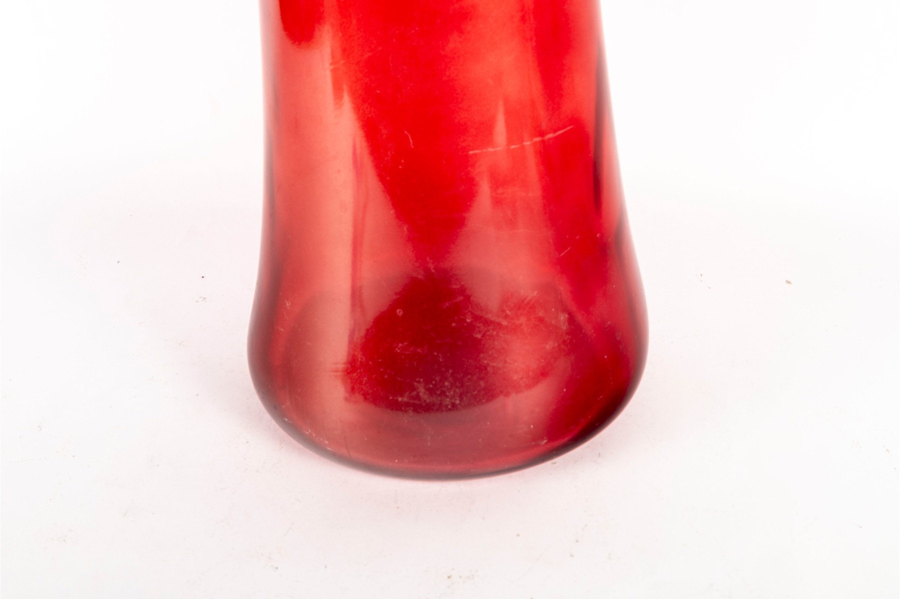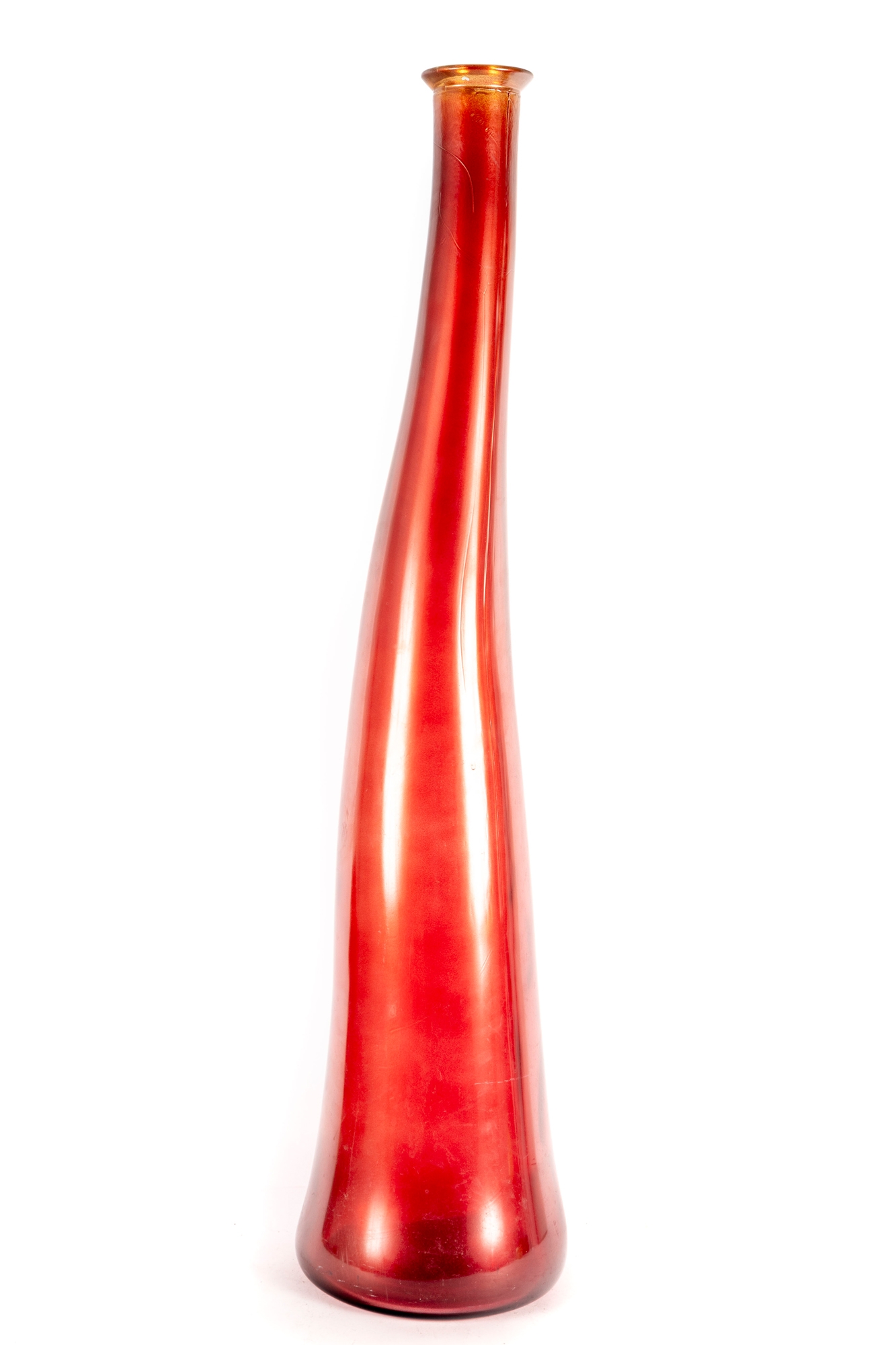 An unusual asymmetrical glass vase in red with an elongated neck — mid-century, hand-made.