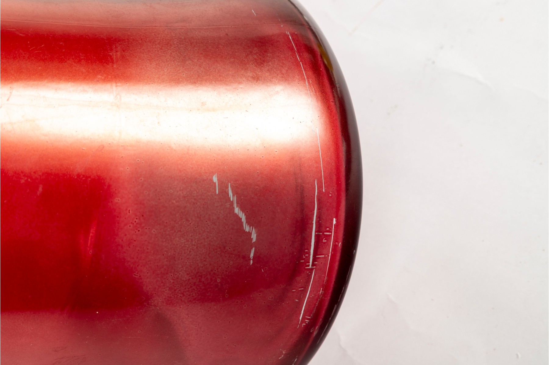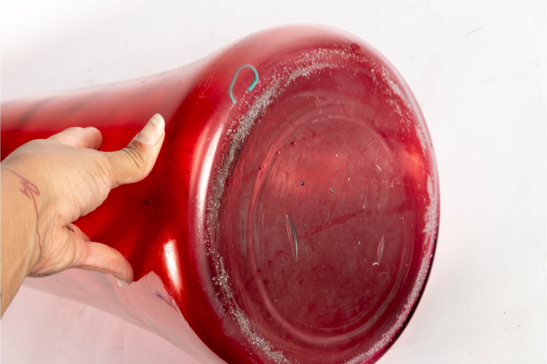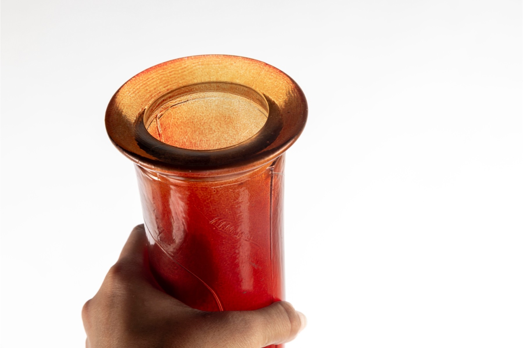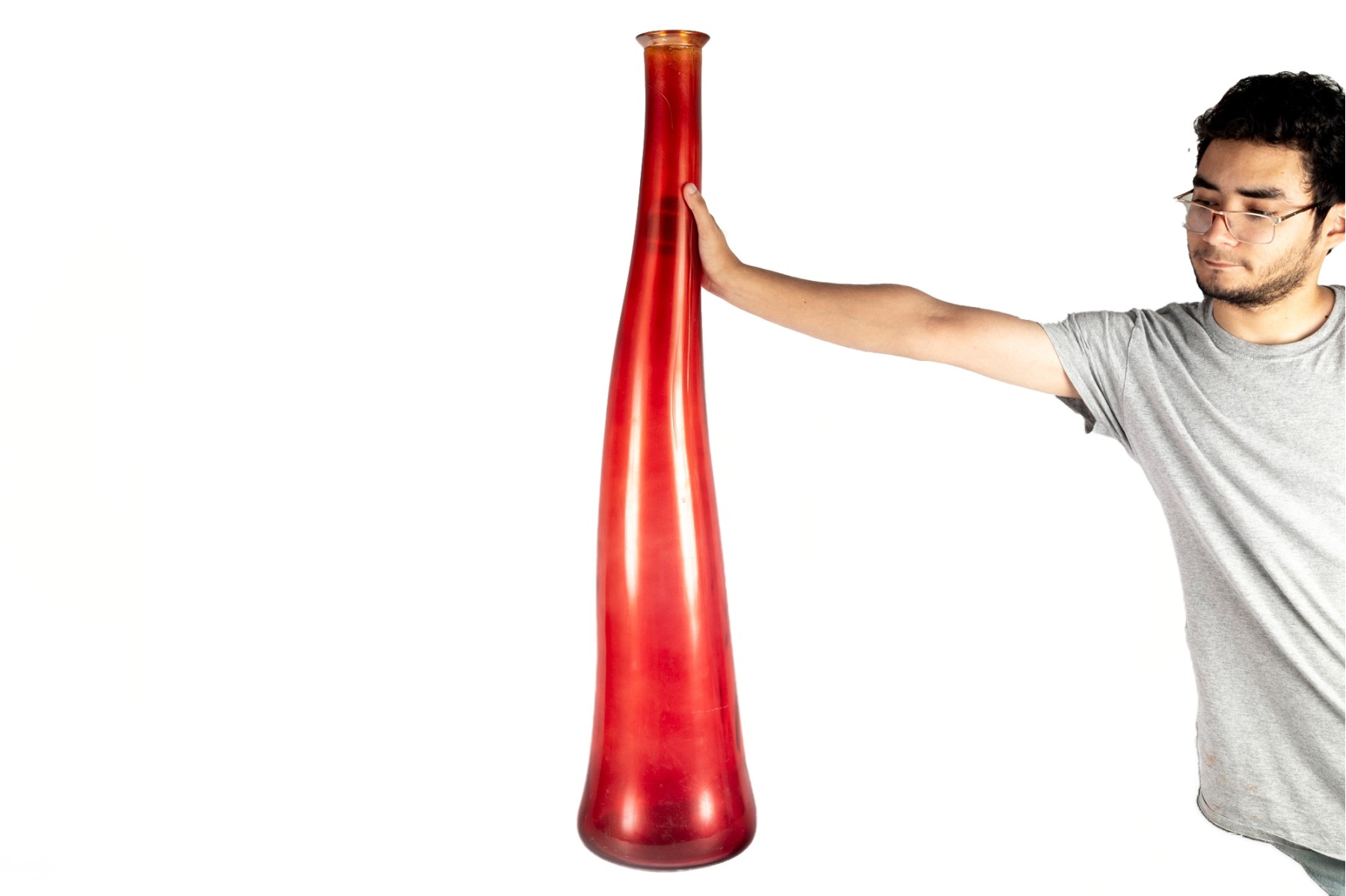 An unusual asymmetrical glass vase in red with an elongated neck — mid-century, hand-made.