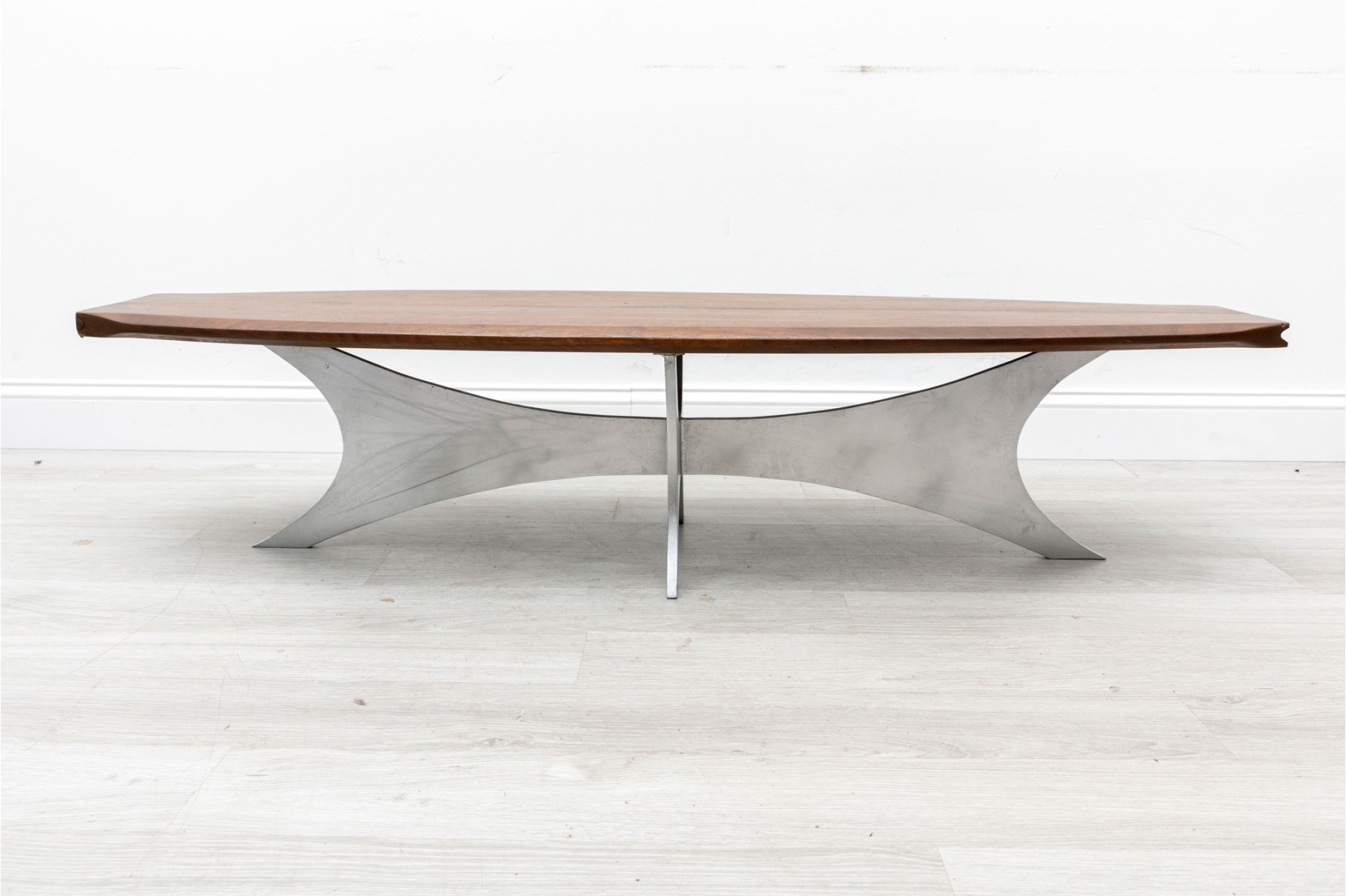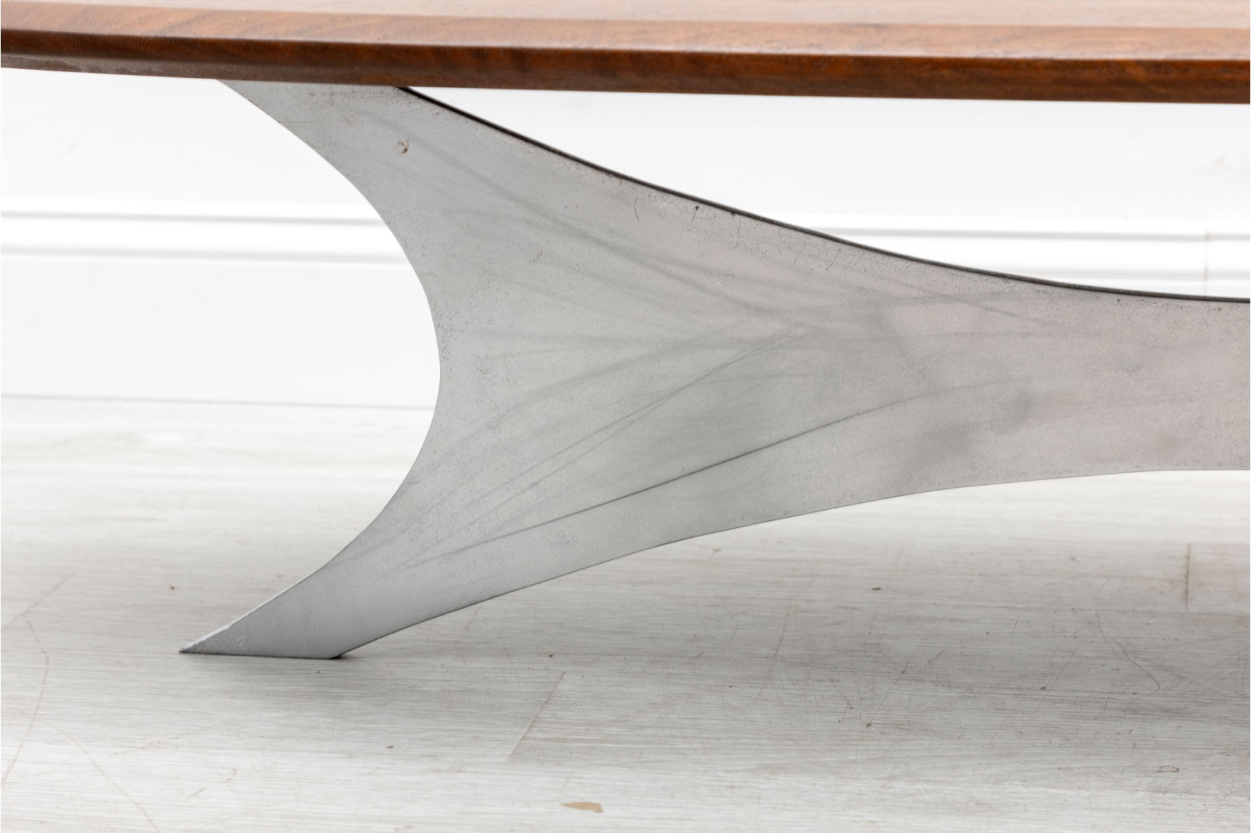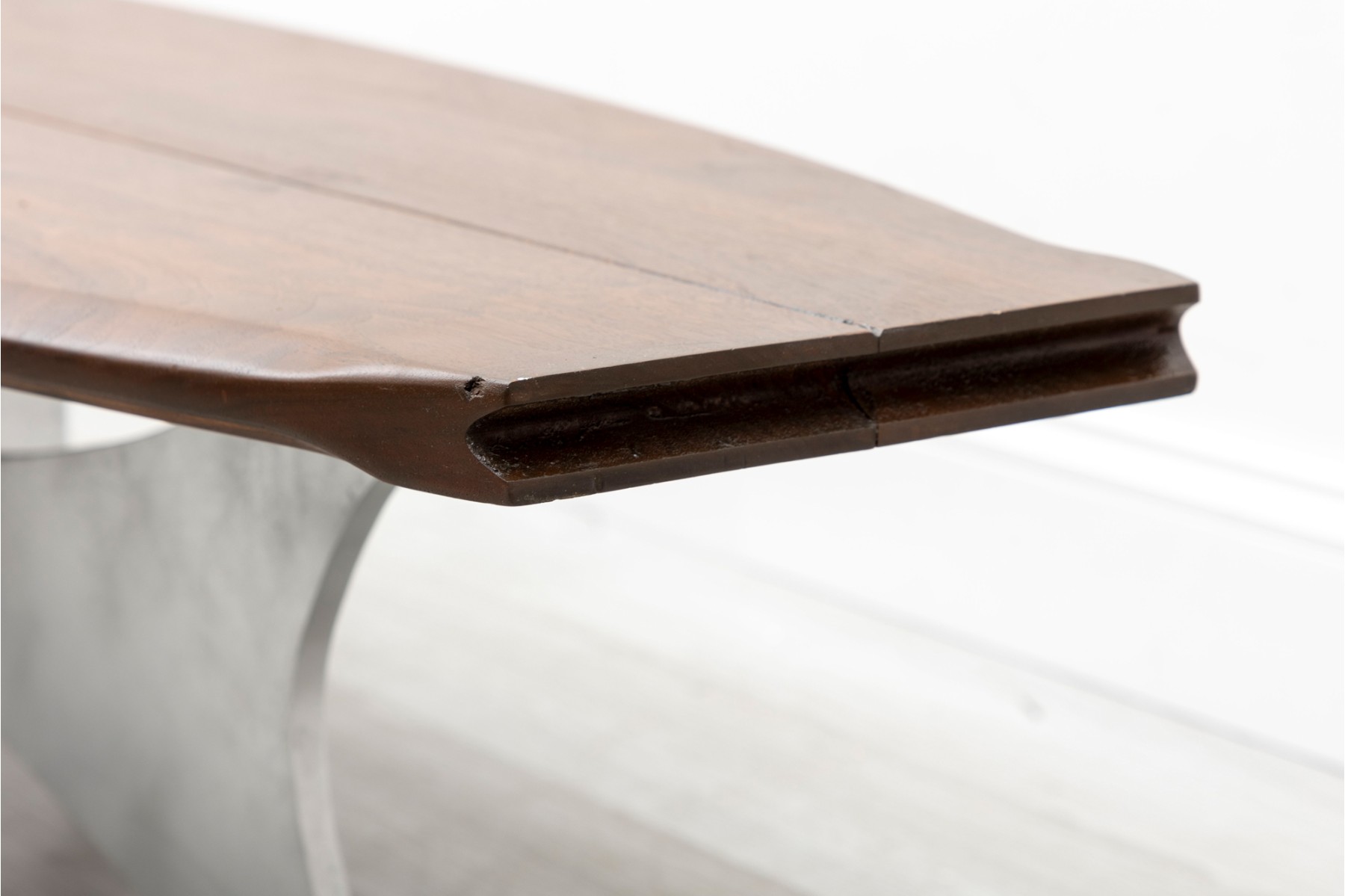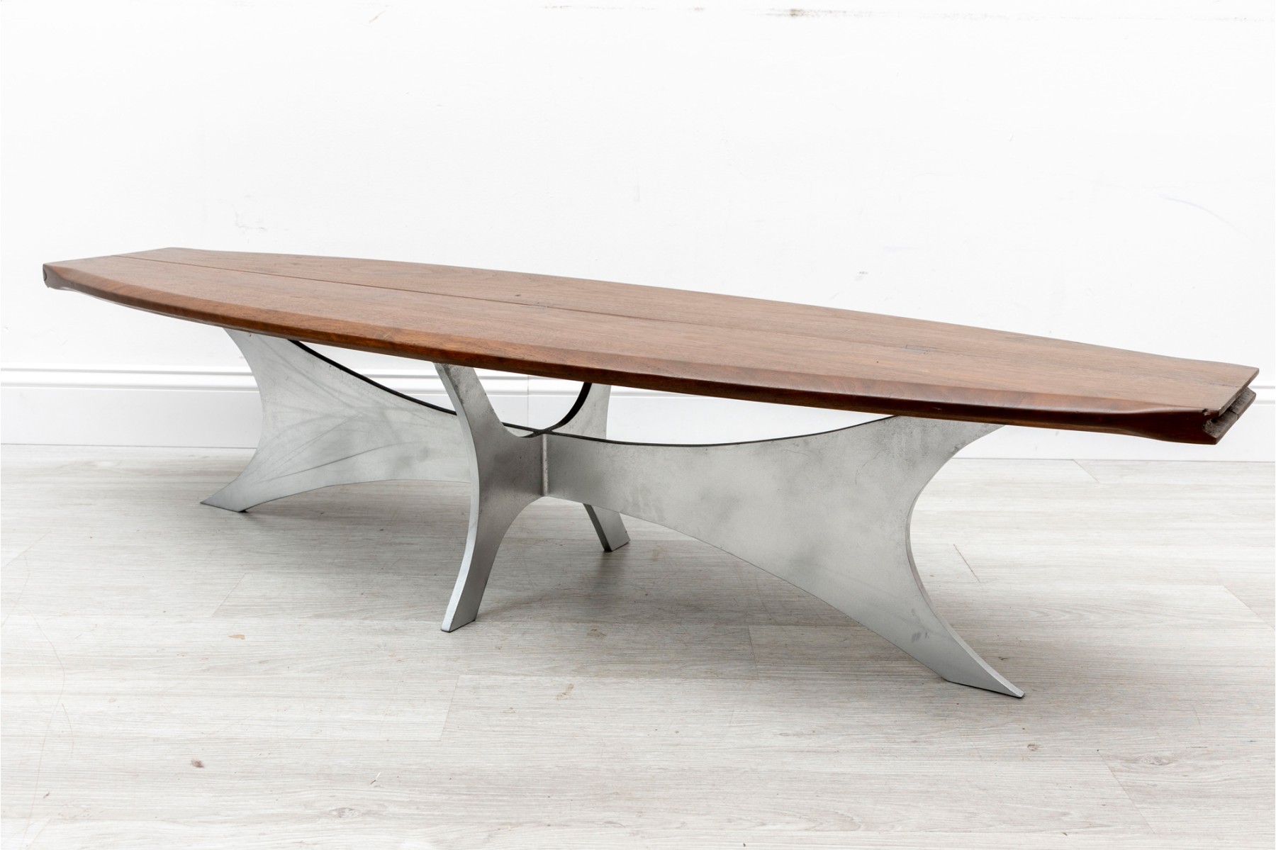 Mid-century modern in design, this 60" longboard/surfboard style coffee table features a figured aluminum base inspired by sculptor Philippe Hiquily's works. The hardwood top is bolstered by bowtie inlays, denoting skilled craftsmanship.