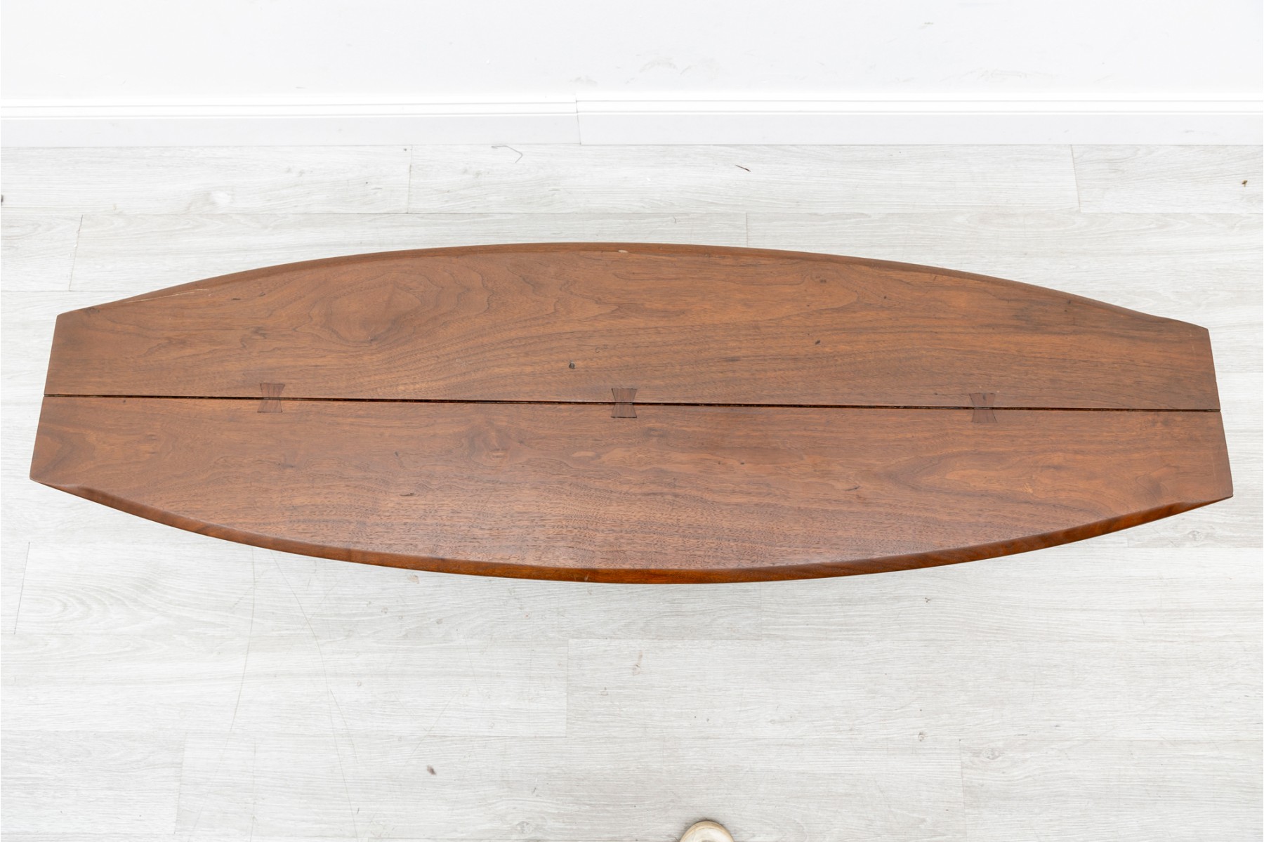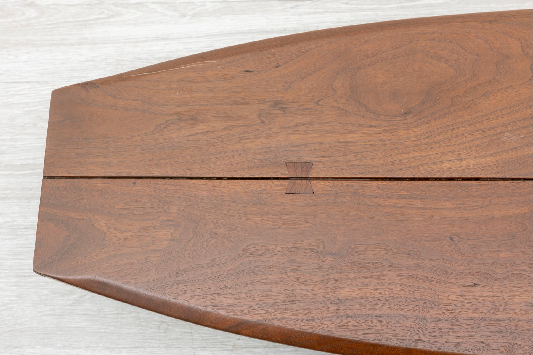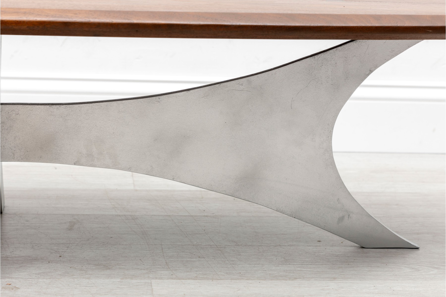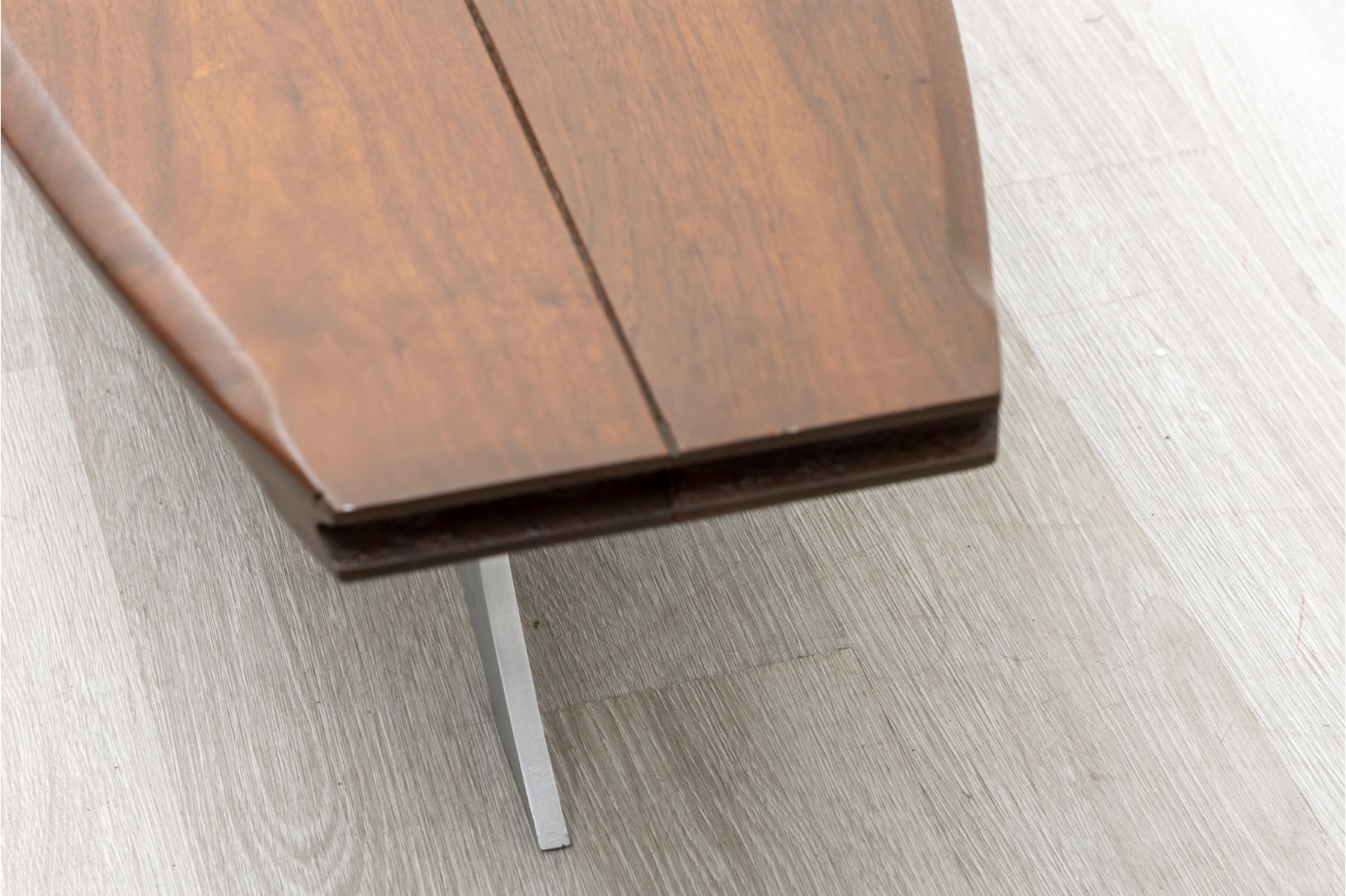 Mid-century modern in design, this 60" longboard/surfboard style coffee table features a figured aluminum base inspired by sculptor Philippe Hiquily's works. The hardwood top is bolstered by bowtie inlays, denoting skilled craftsmanship.