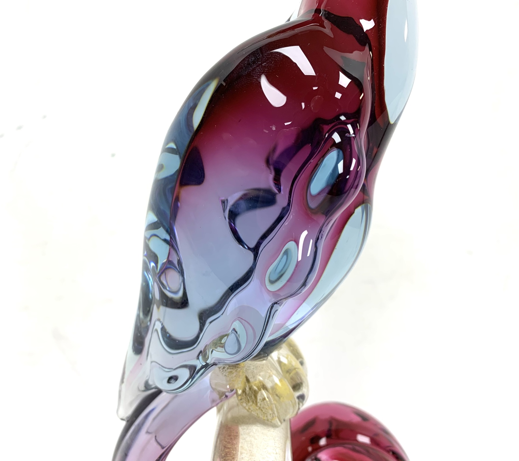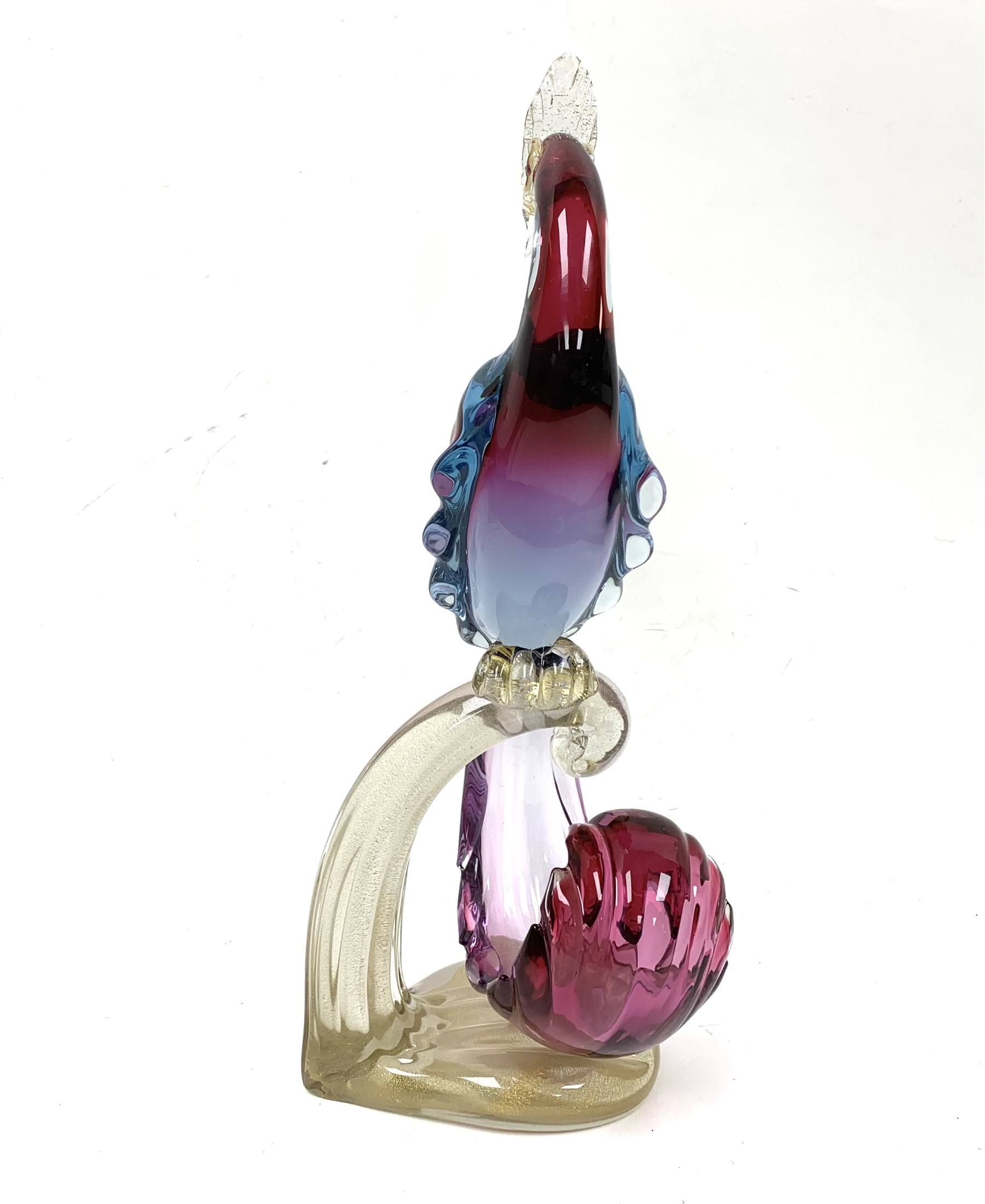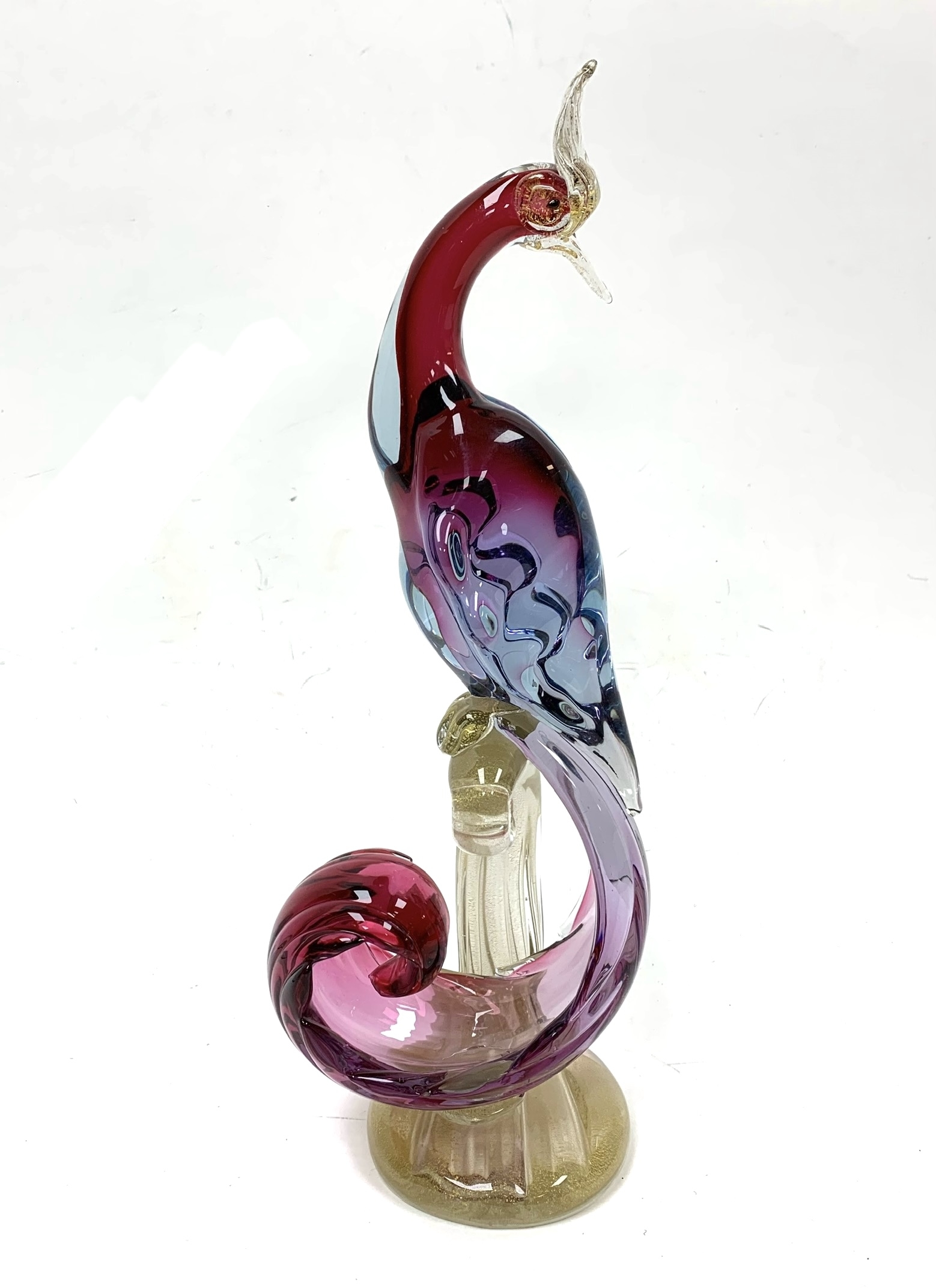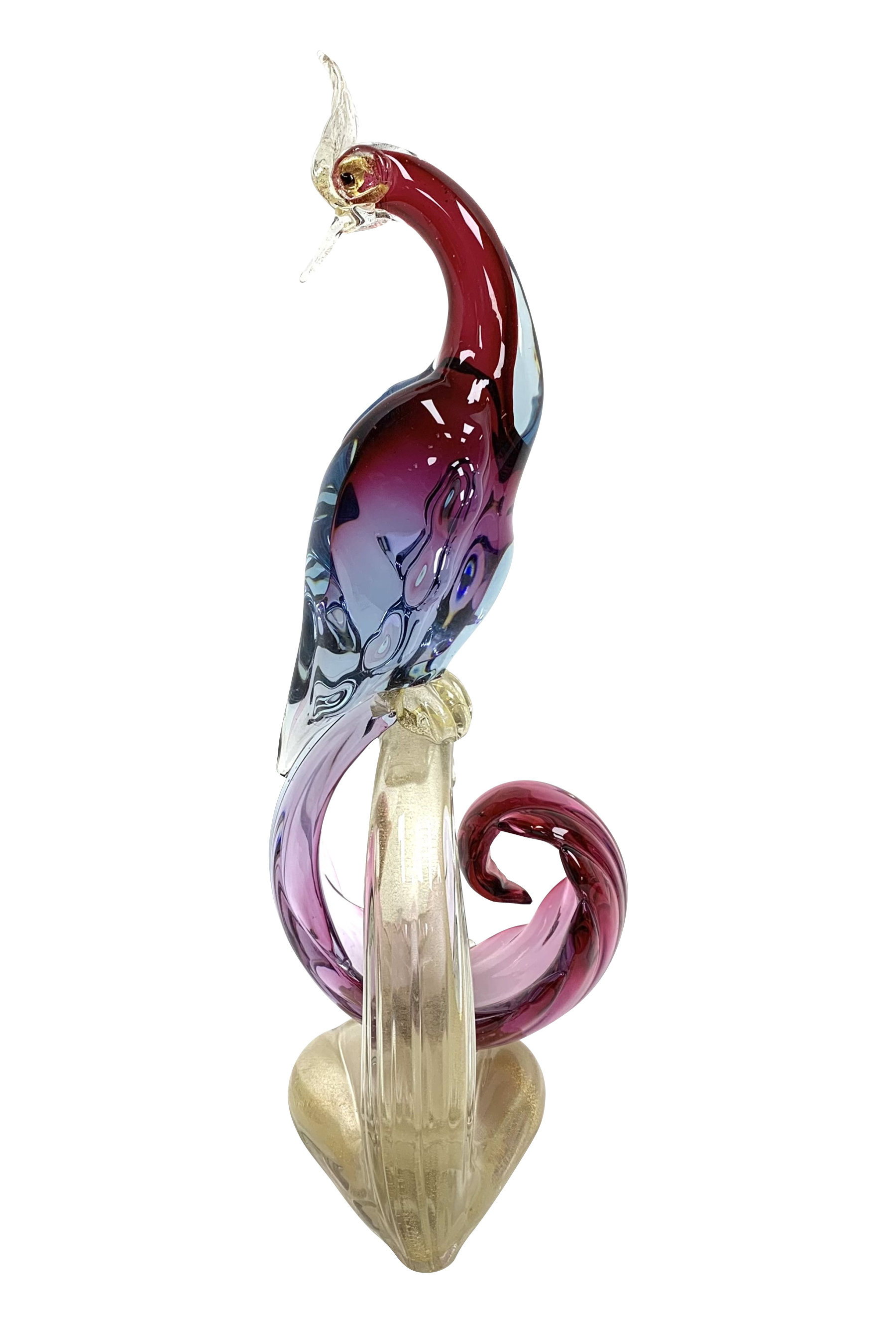 Murano mid century Bird of Paradise Italian art glass sculpture with a perched bird hand-blown using the Sommerso technique, which involves layering different colors of glass. The crest, beak, feet and perch features clear glass with gold flecks (aventurine). The bird is signed on verso and appears to be Areida but the work is attributed to Alfredo Barbini.