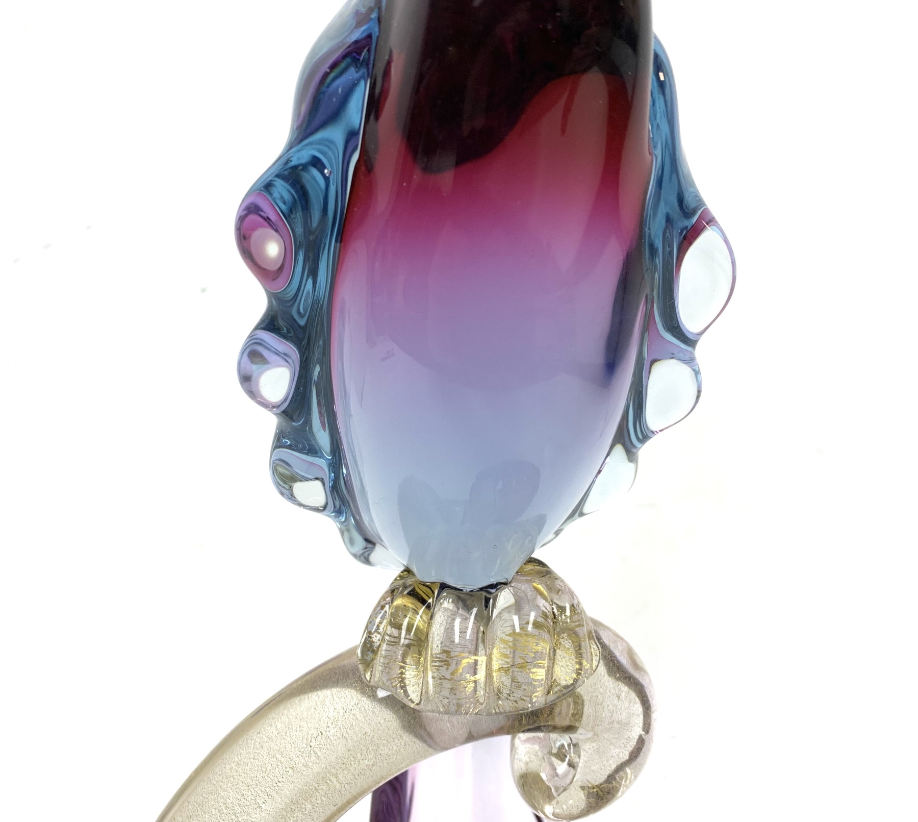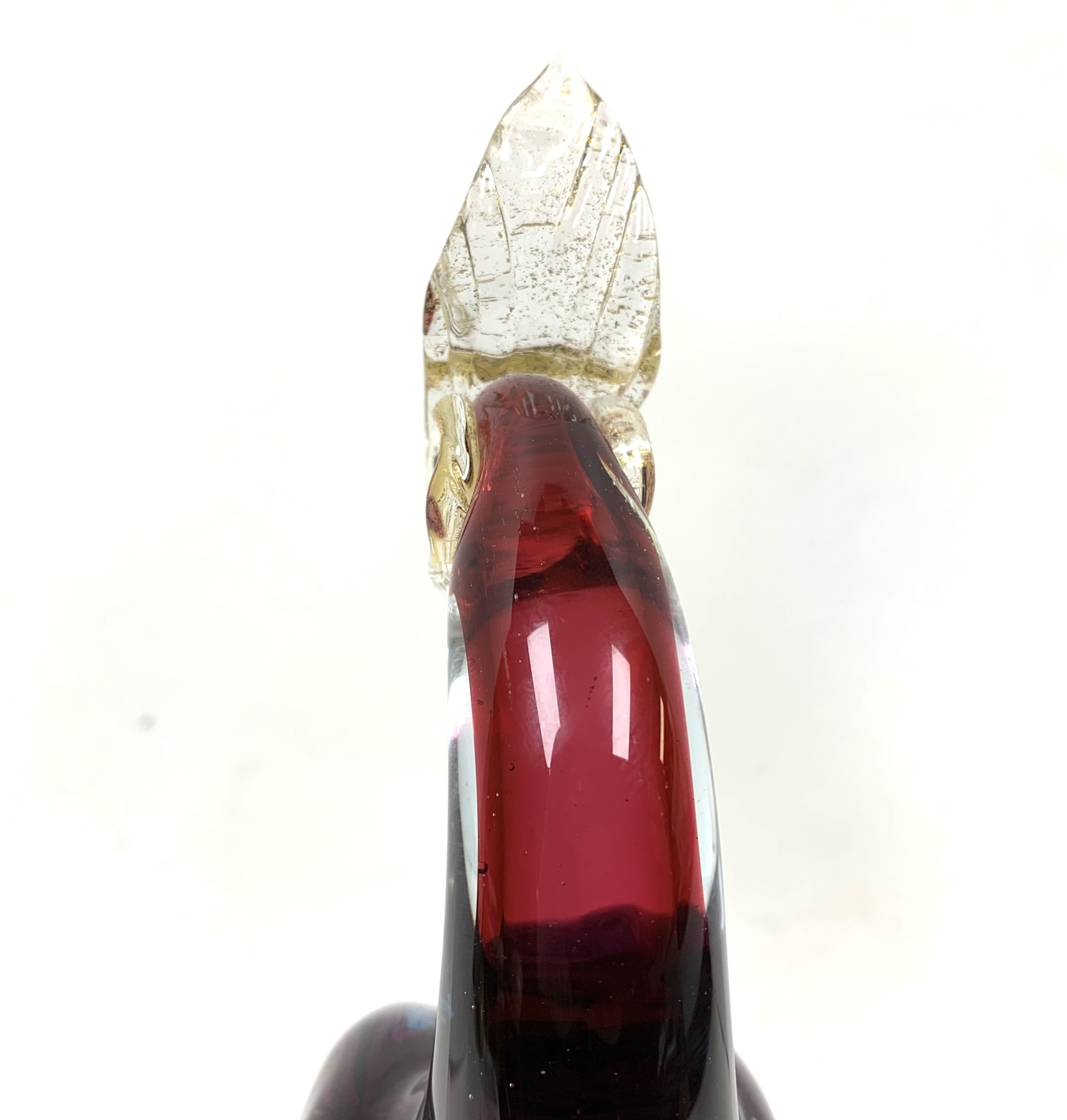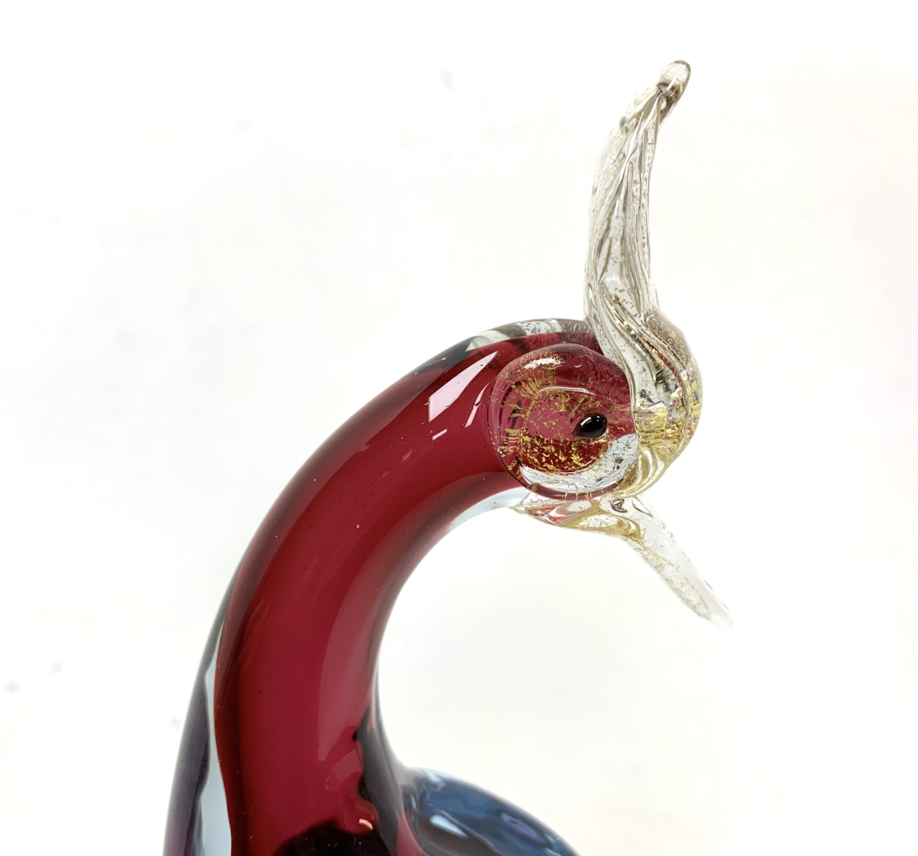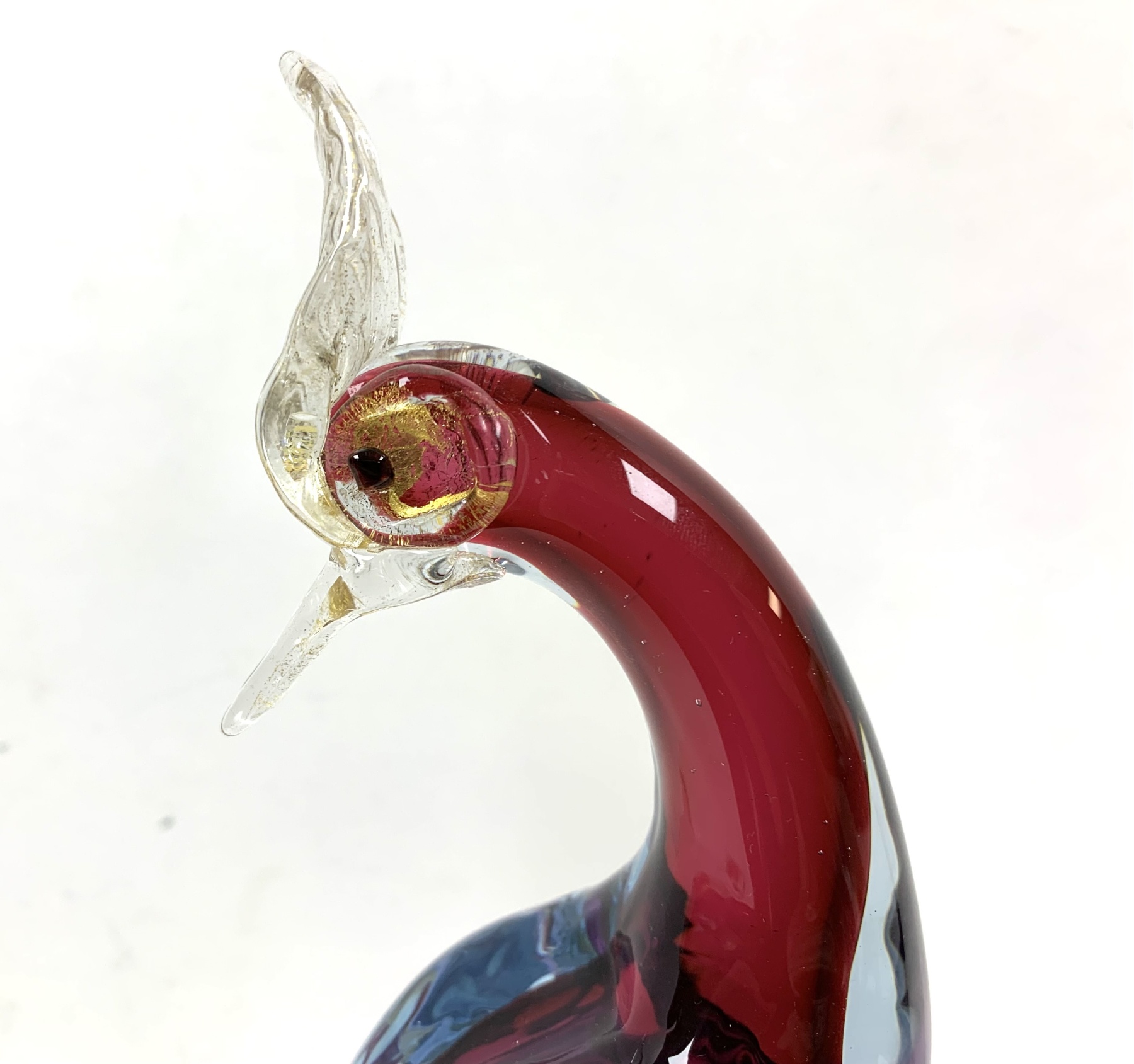 Murano mid century Bird of Paradise Italian art glass sculpture with a perched bird hand-blown using the Sommerso technique, which involves layering different colors of glass. The crest, beak, feet and perch features clear glass with gold flecks (aventurine). The bird is signed on verso and appears to be Areida but the work is attributed to Alfredo Barbini.