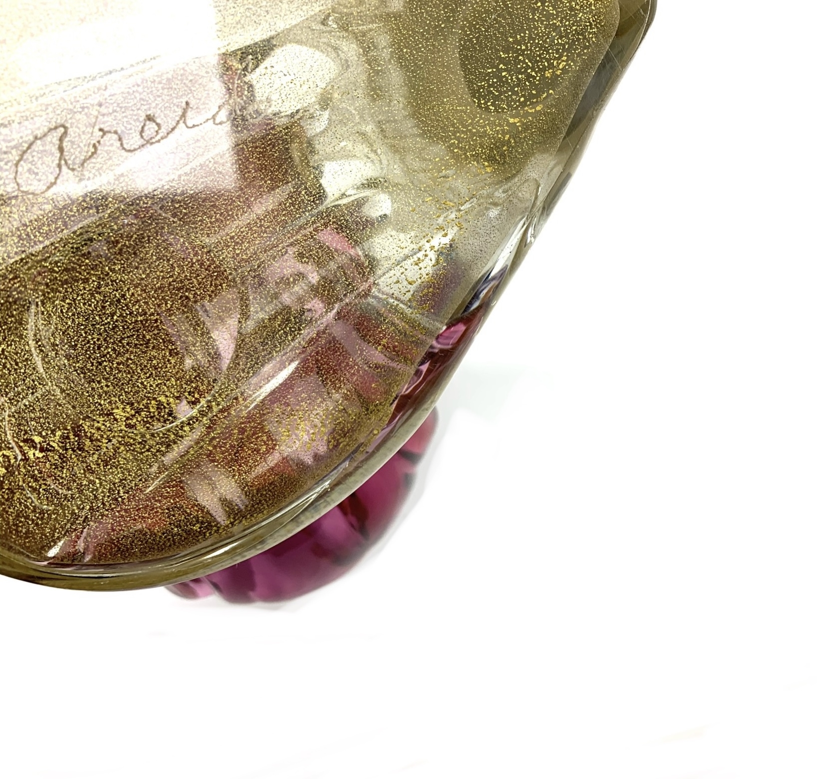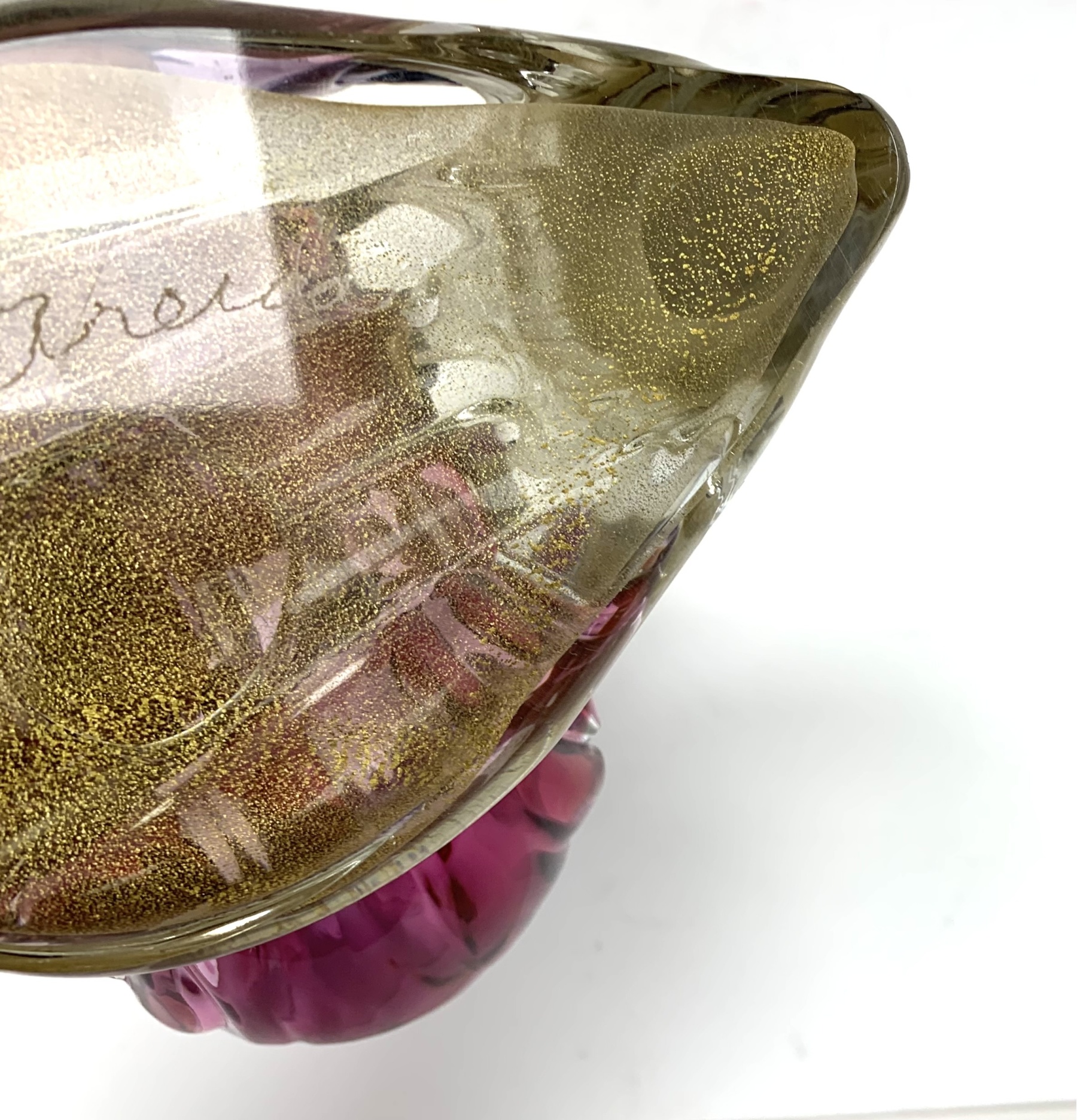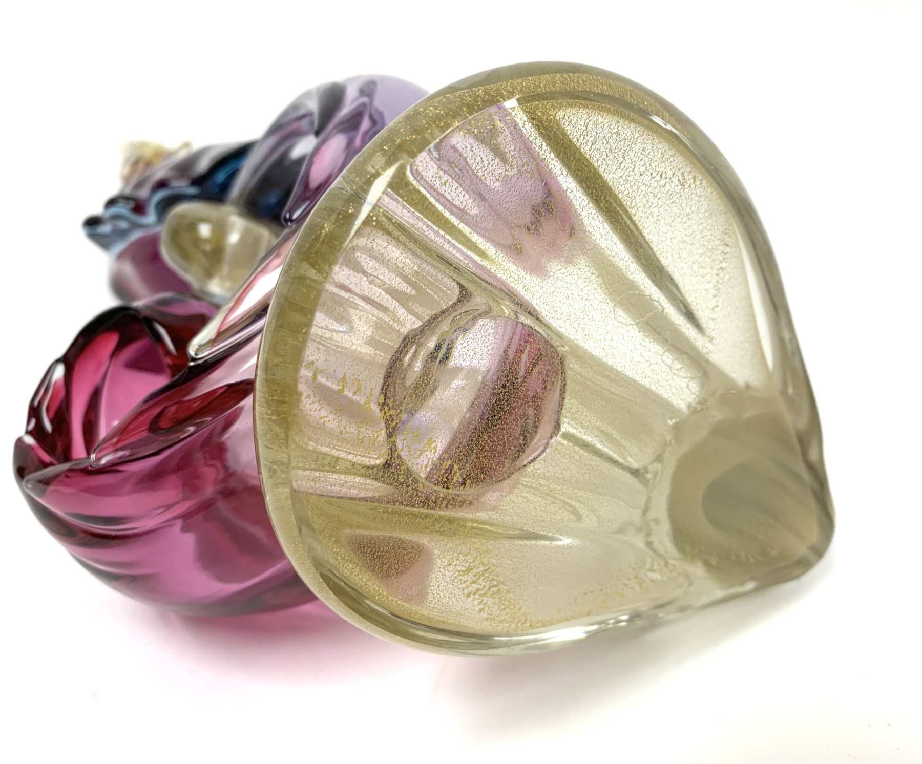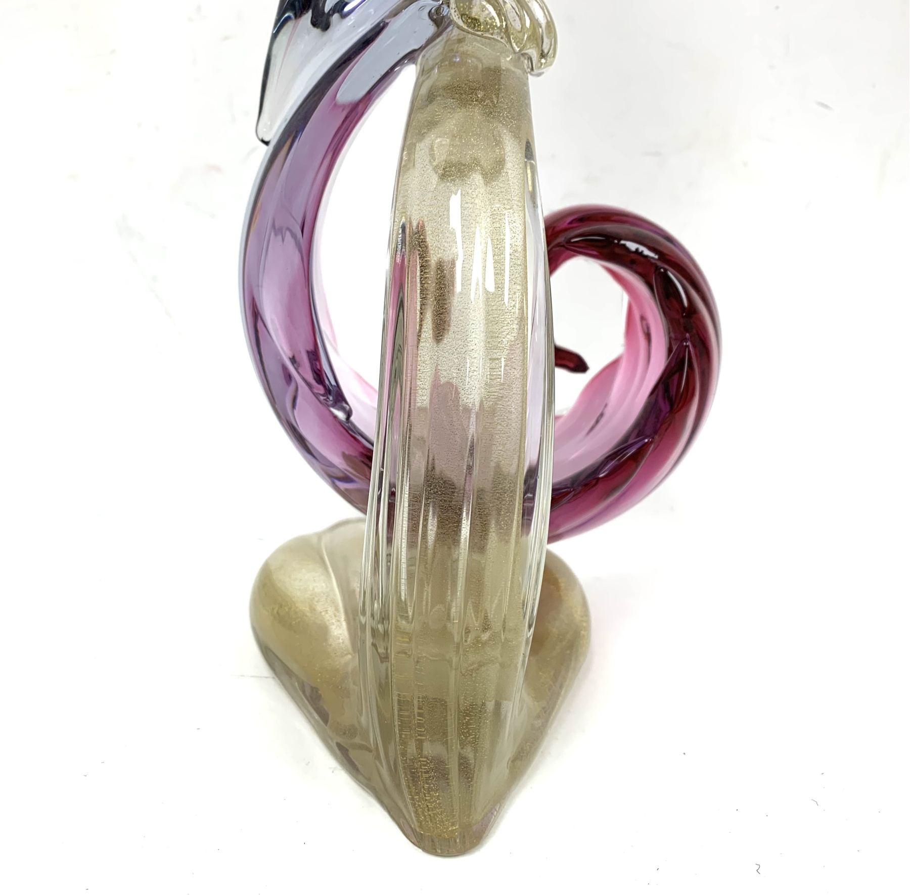 Murano mid century Bird of Paradise Italian art glass sculpture with a perched bird hand-blown using the Sommerso technique, which involves layering different colors of glass. The crest, beak, feet and perch features clear glass with gold flecks (aventurine). The bird is signed on verso and appears to be Areida but the work is attributed to Alfredo Barbini.
