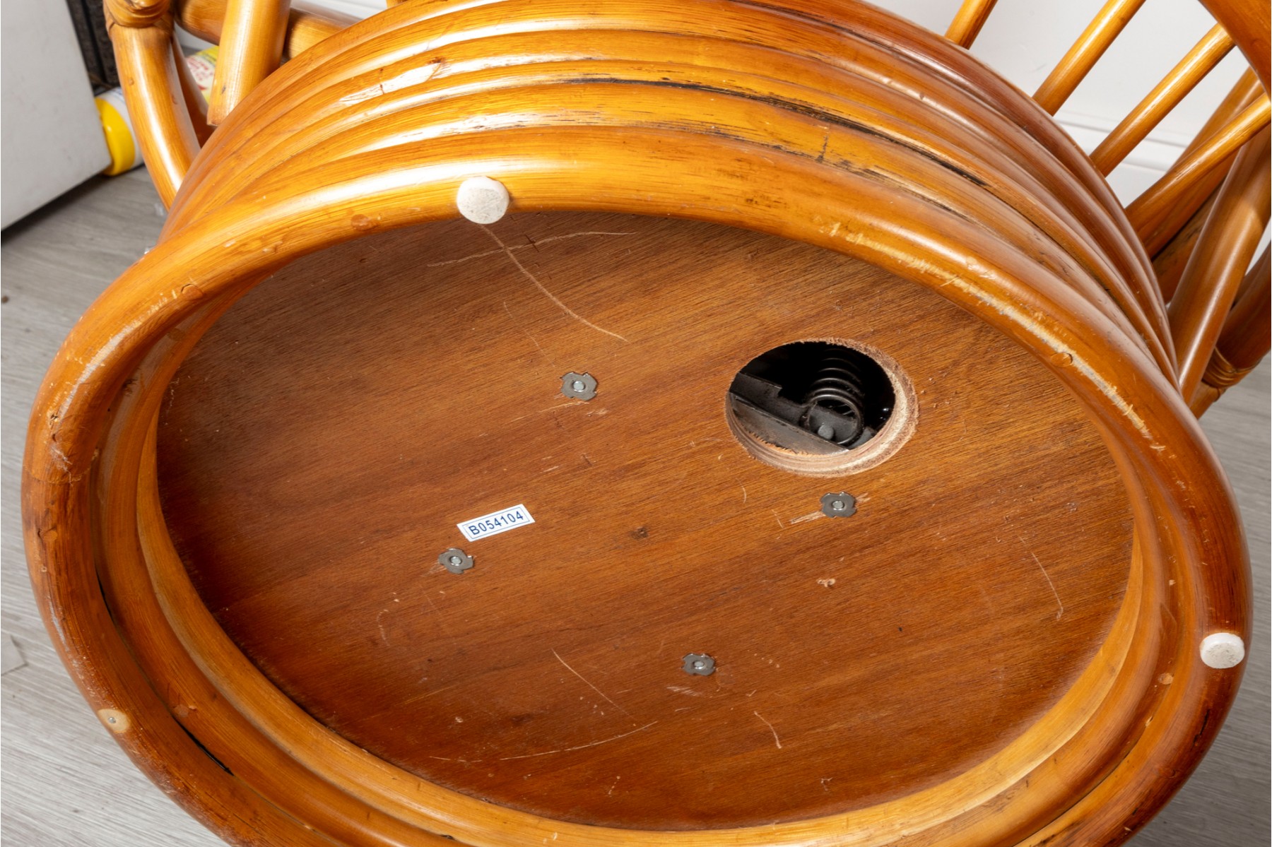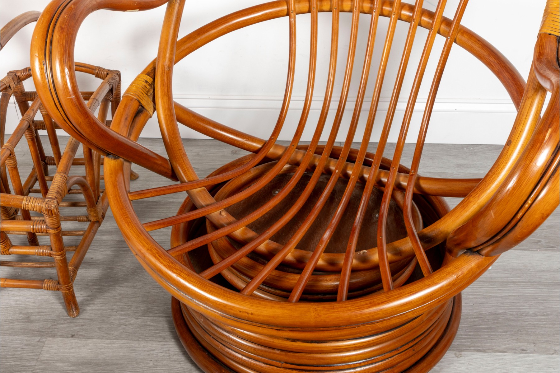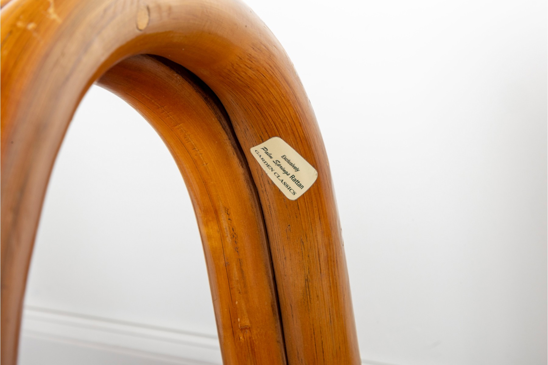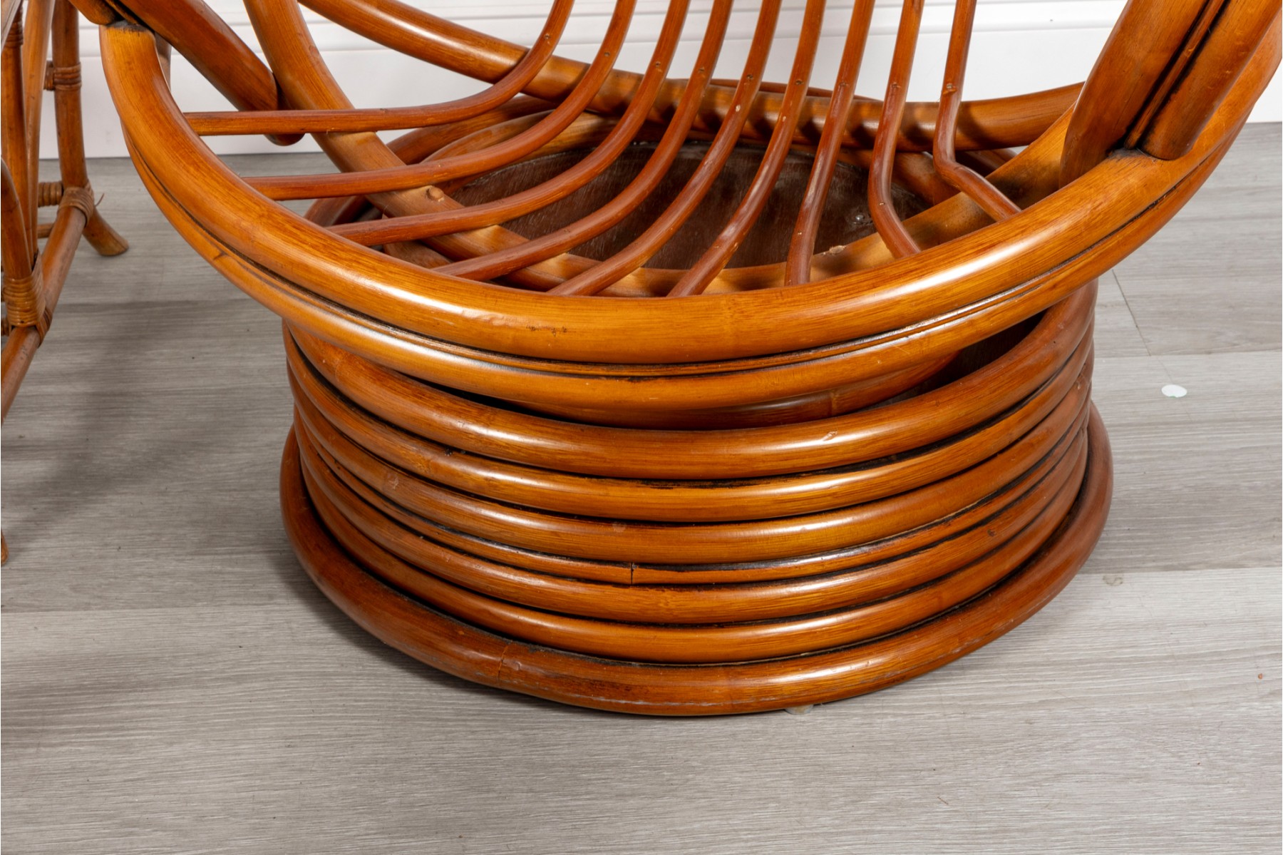 A classic Paul Frankl design. A pair of 1960's chairs (also known as "egg" chairs) by Palm Springs Rattan as a part of their "Garden Classics" collection -- formed from bamboo bound together with rattan and rest on weighted bases purpose-built to seamlessly rock and swivel. The set includes a small side table and magazine rack which share the same coastal appeal. No cushions included.
