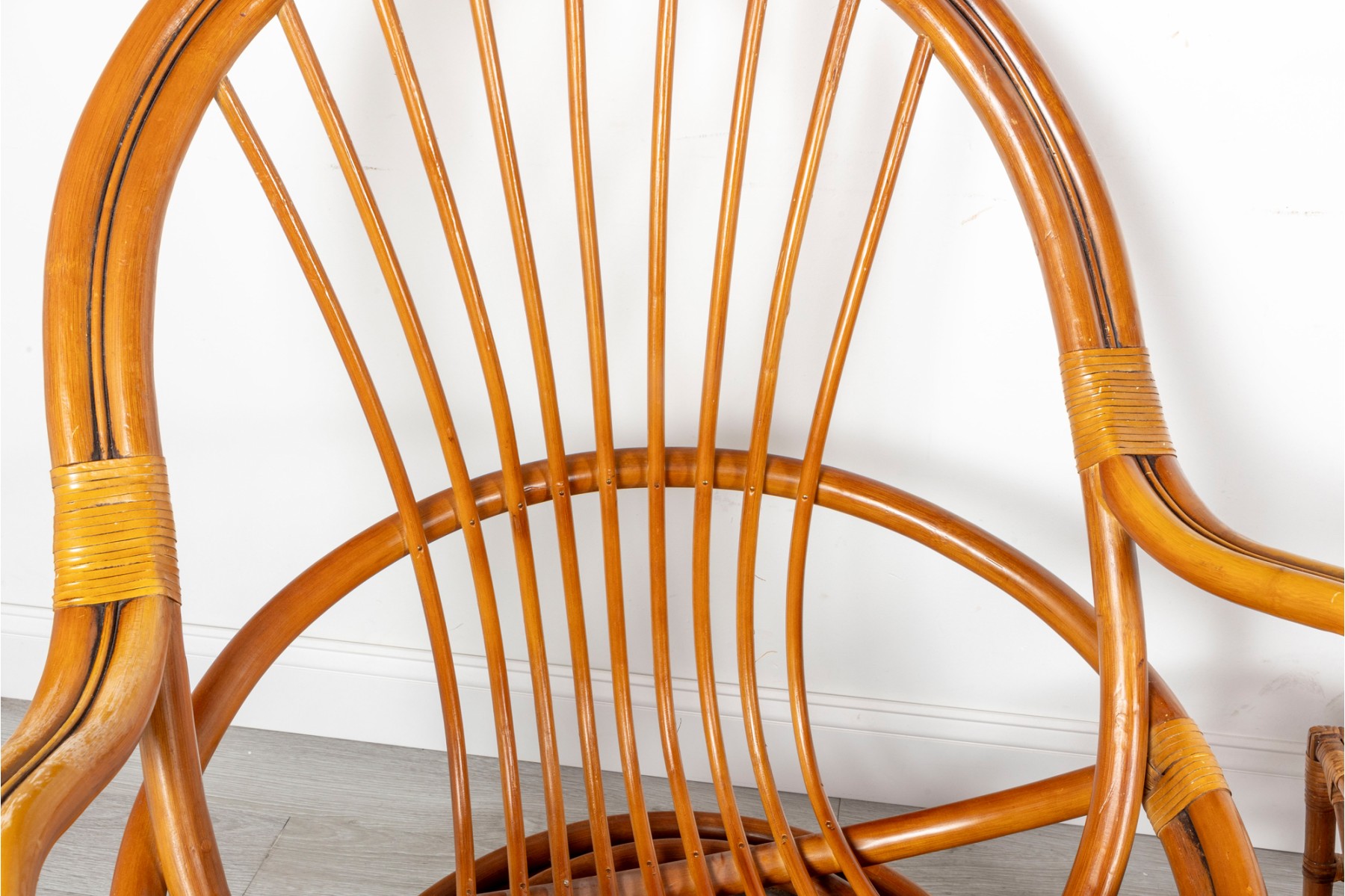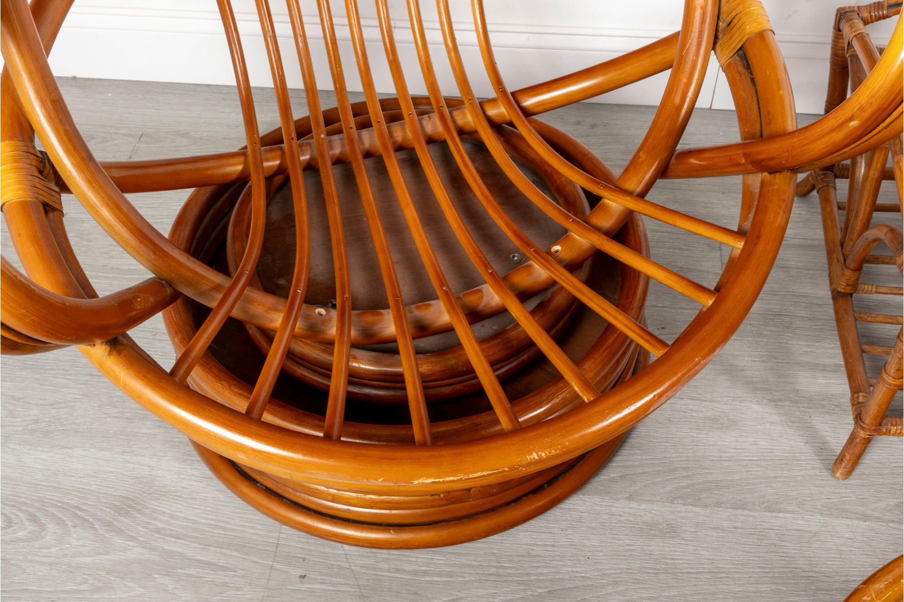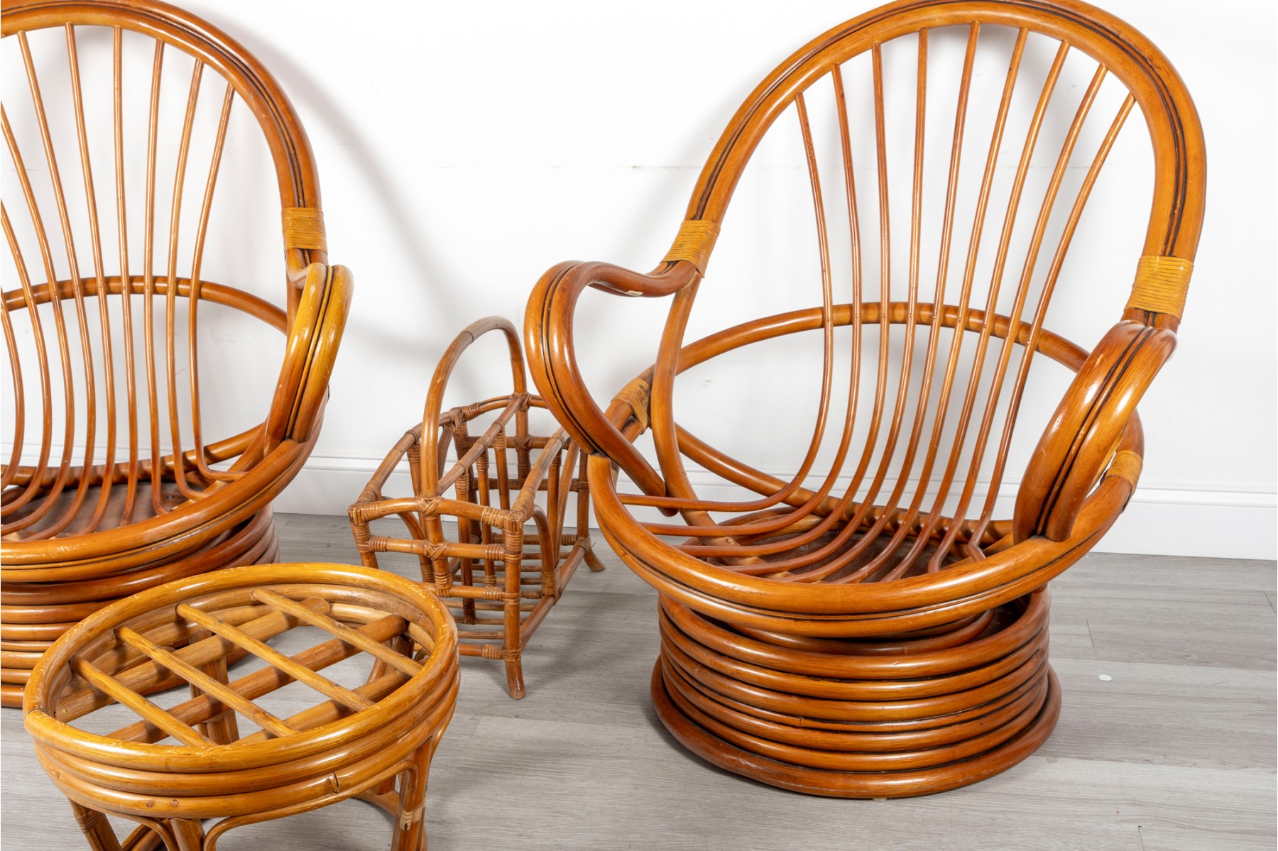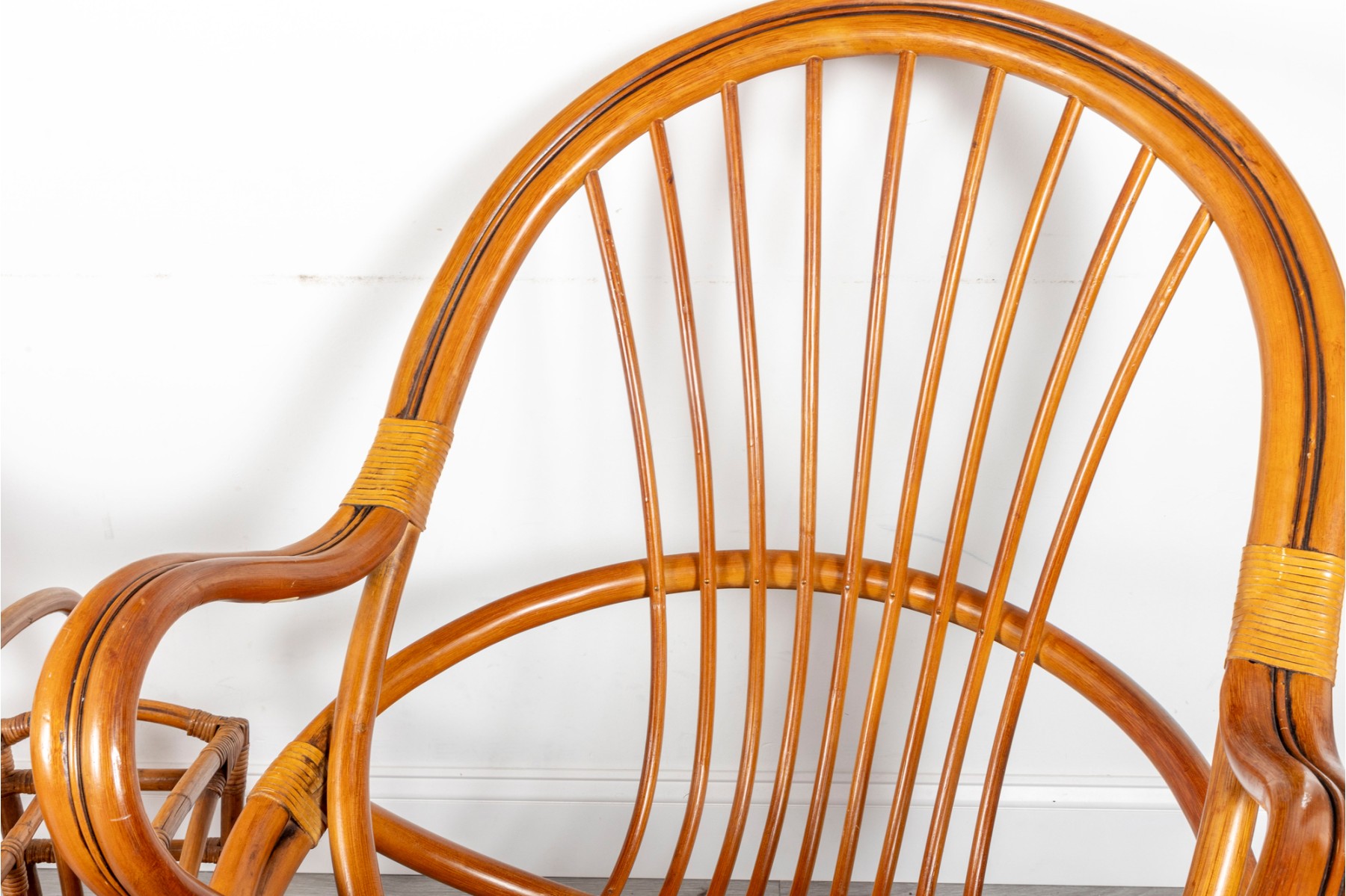 A classic Paul Frankl design. A pair of 1960's chairs (also known as "egg" chairs) by Palm Springs Rattan as a part of their "Garden Classics" collection -- formed from bamboo bound together with rattan and rest on weighted bases purpose-built to seamlessly rock and swivel. The set includes a small side table and magazine rack which share the same coastal appeal. No cushions included.