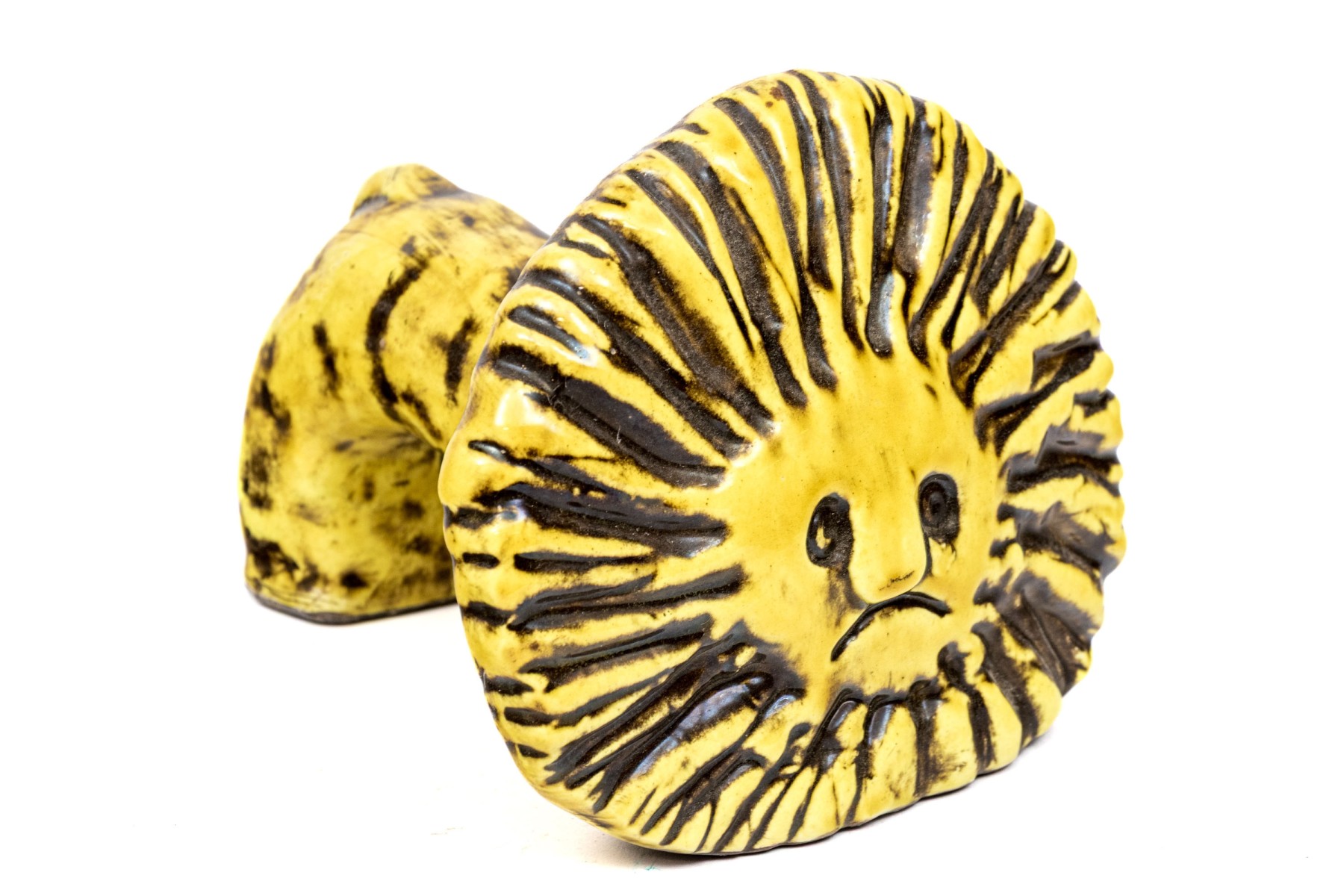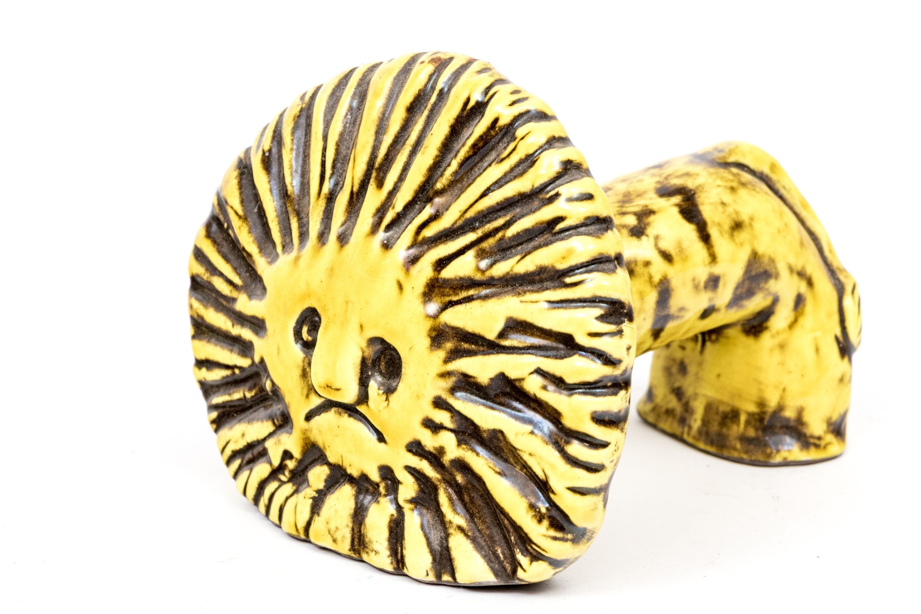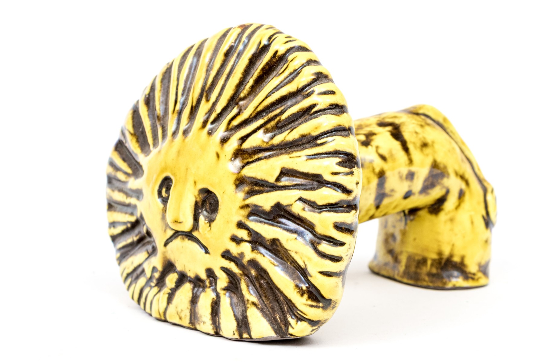 The ceramic lion has its back end with moulded tail with slender body and large circular, striated mane with facial features to the center.