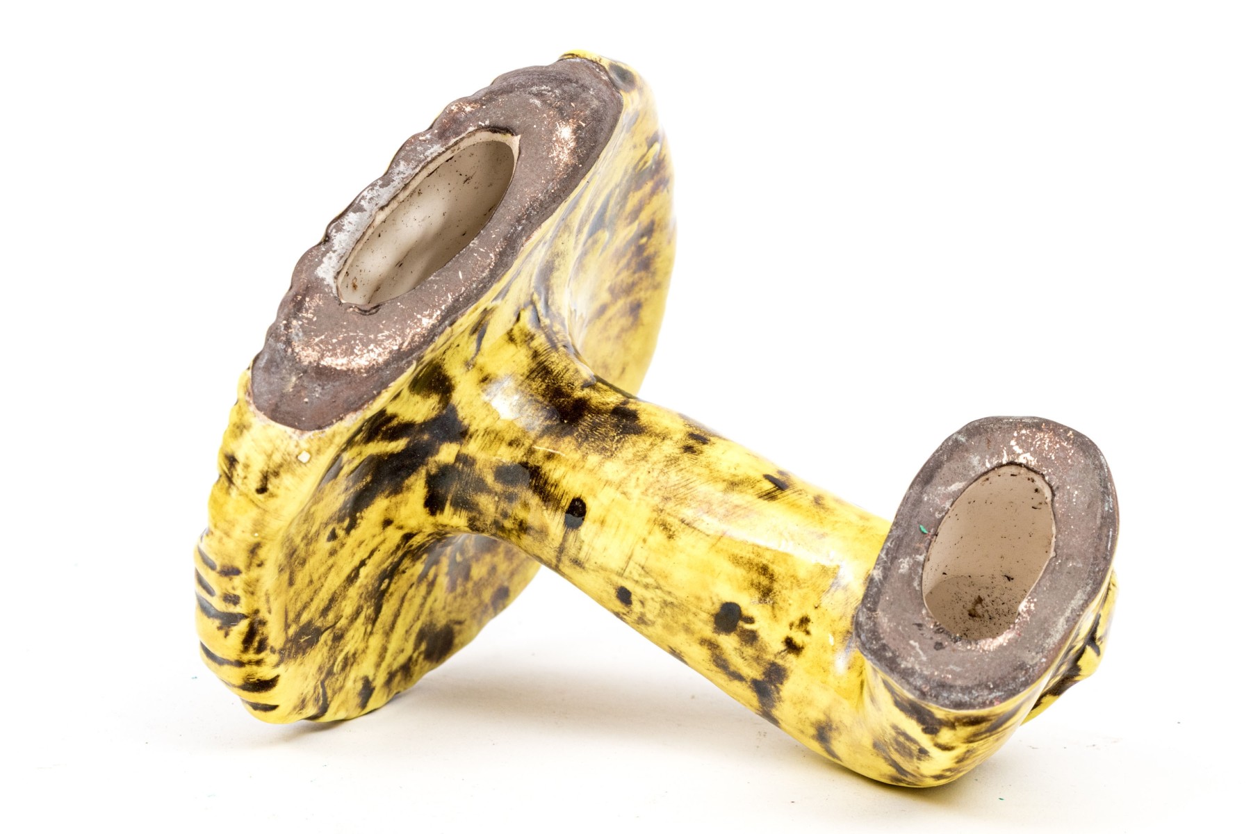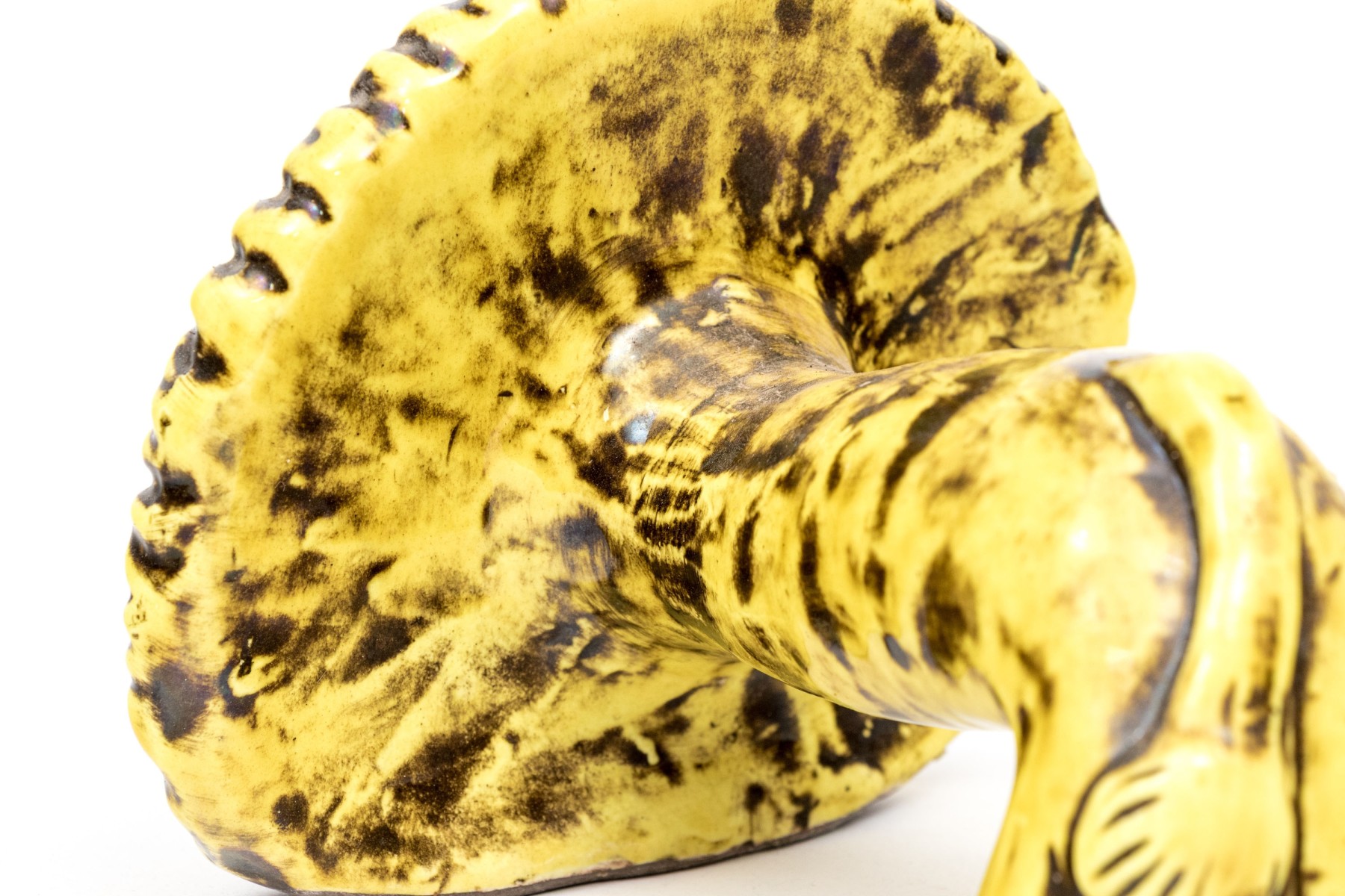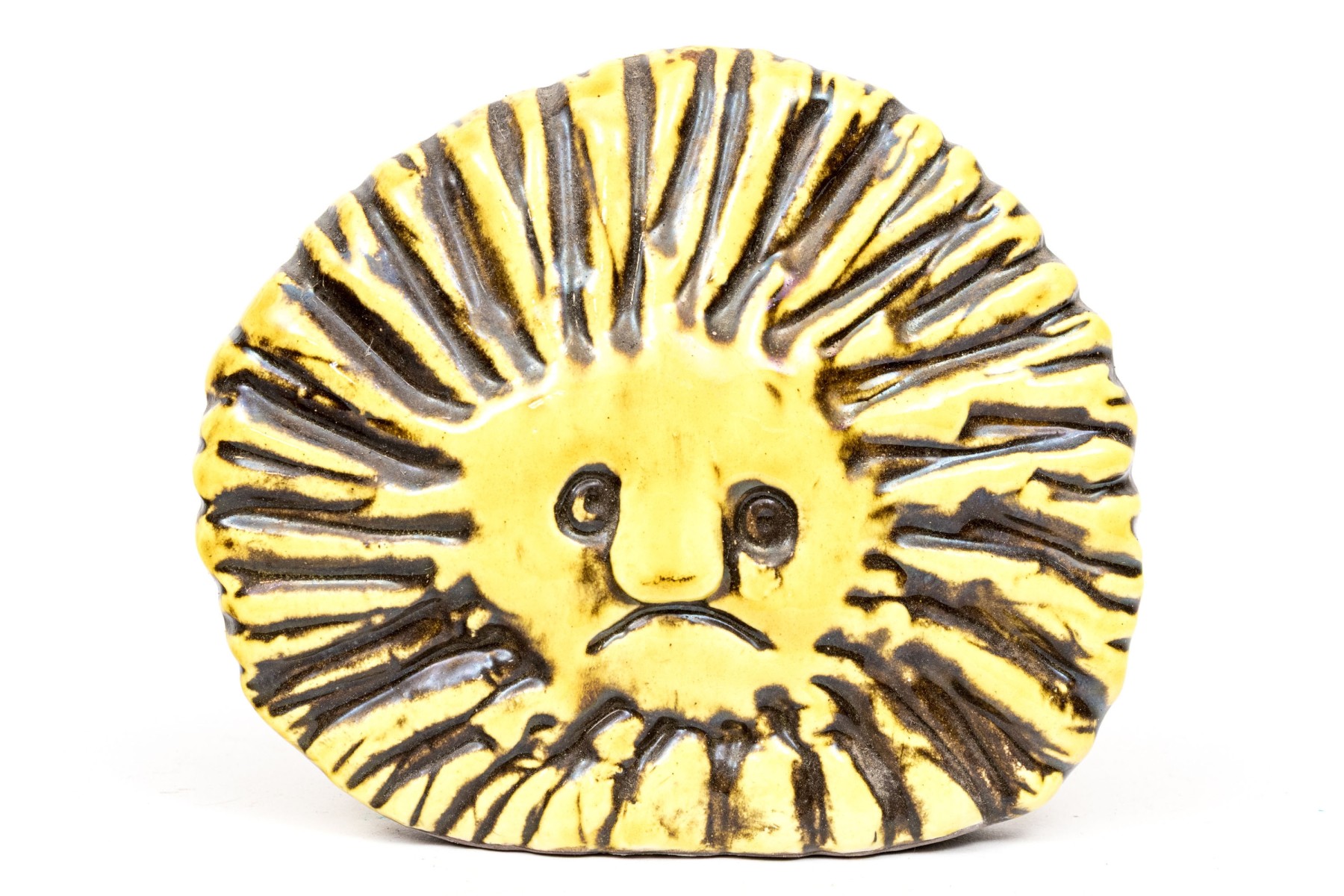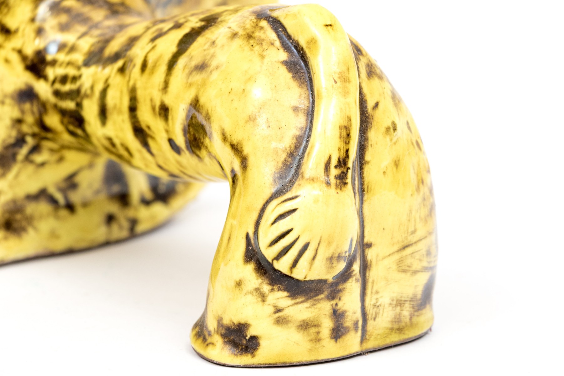 The ceramic lion has its back end with moulded tail with slender body and large circular, striated mane with facial features to the center.