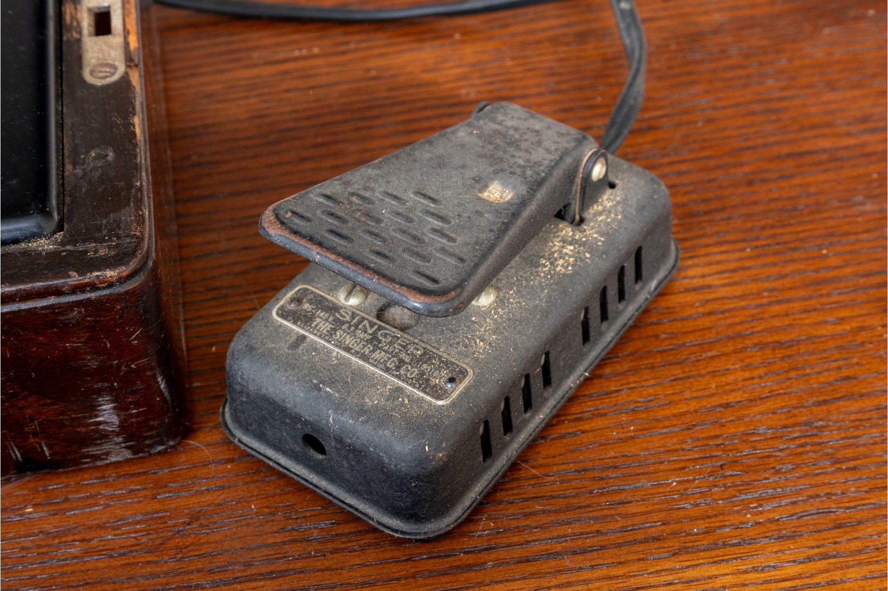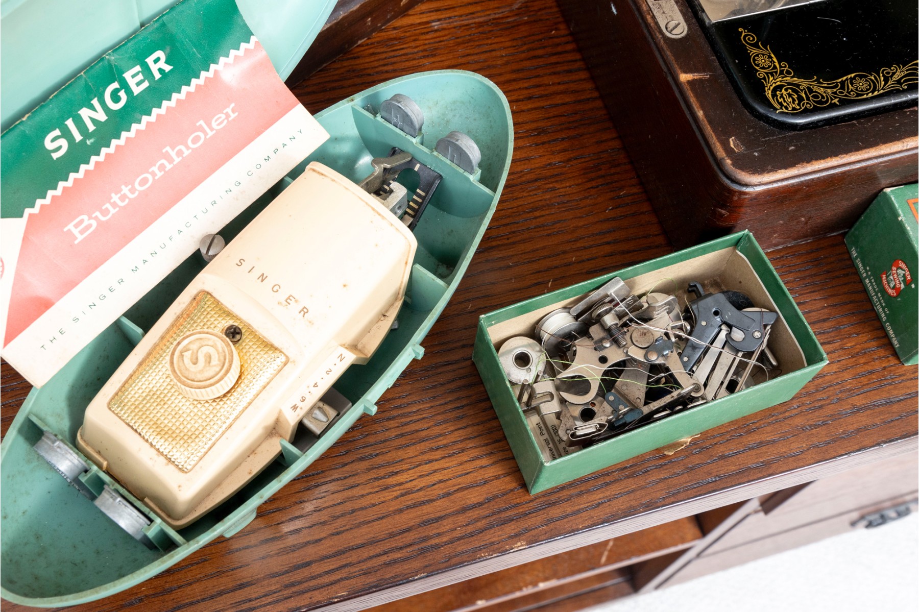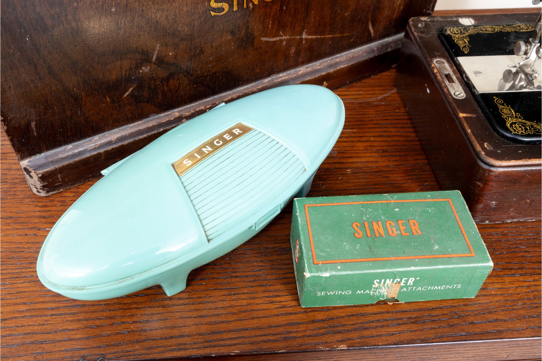 A classic mid century Singer sewing machine with a lidded case, displaying serial number EF112400. Includes a buttonholder and a variety of feet. The case include a key.