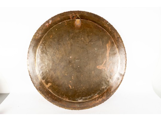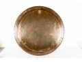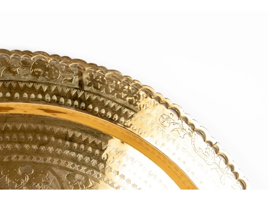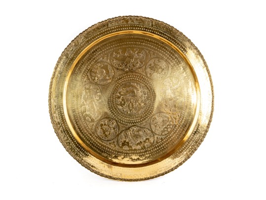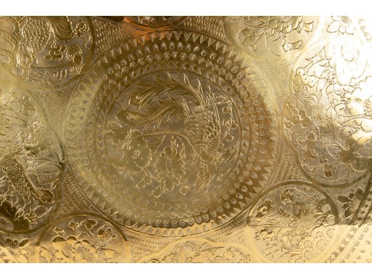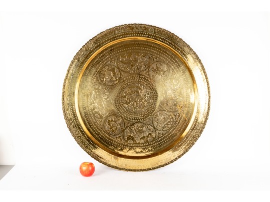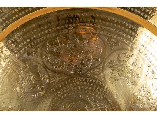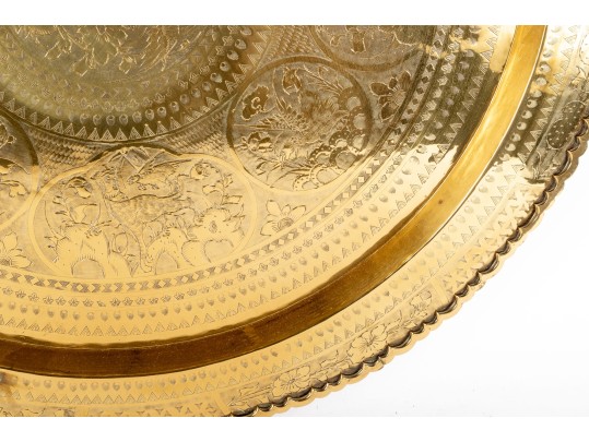 A large, 30" Asian tray table crafted from brass with stamped/engraved details with animal motifs. No tray stand included.