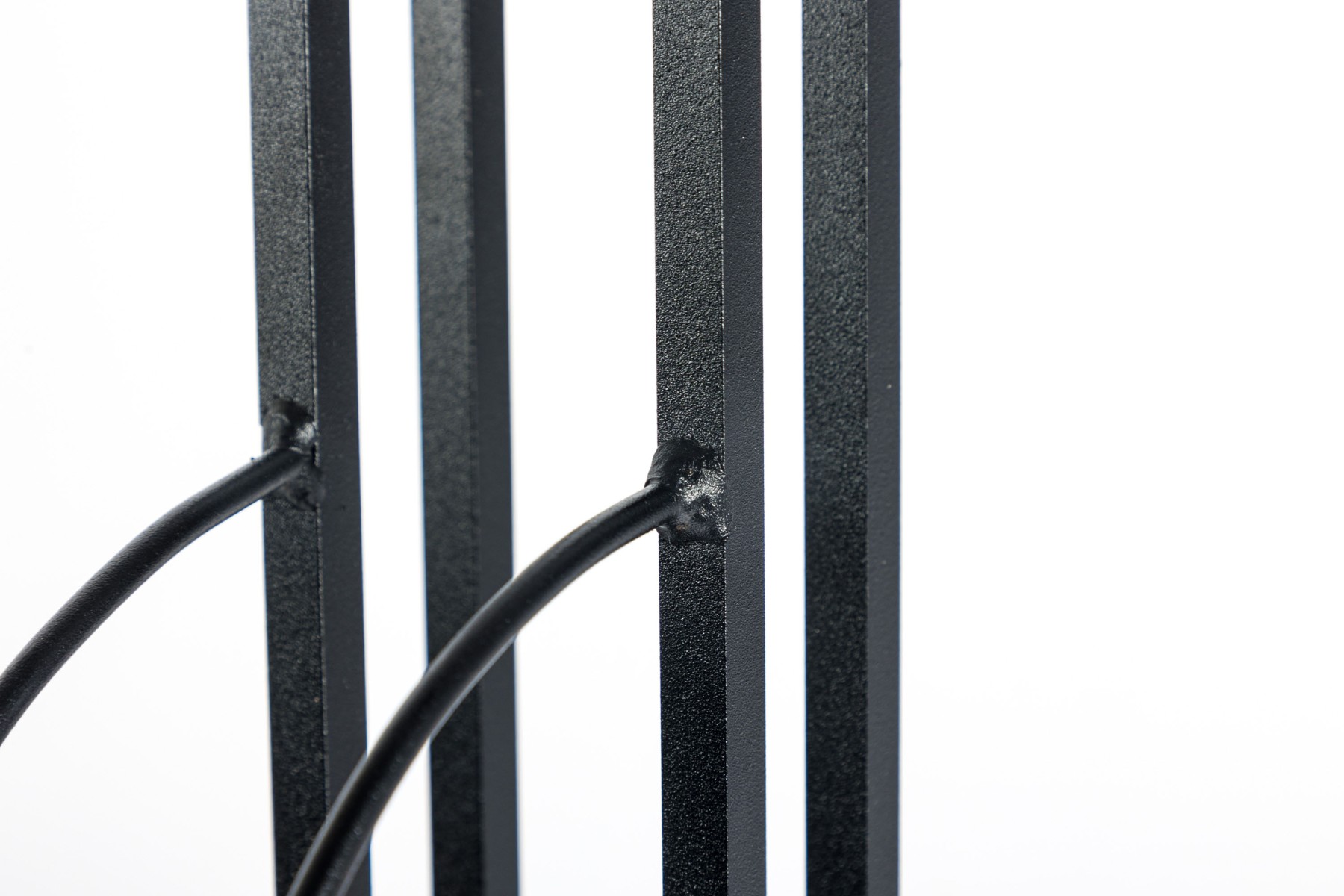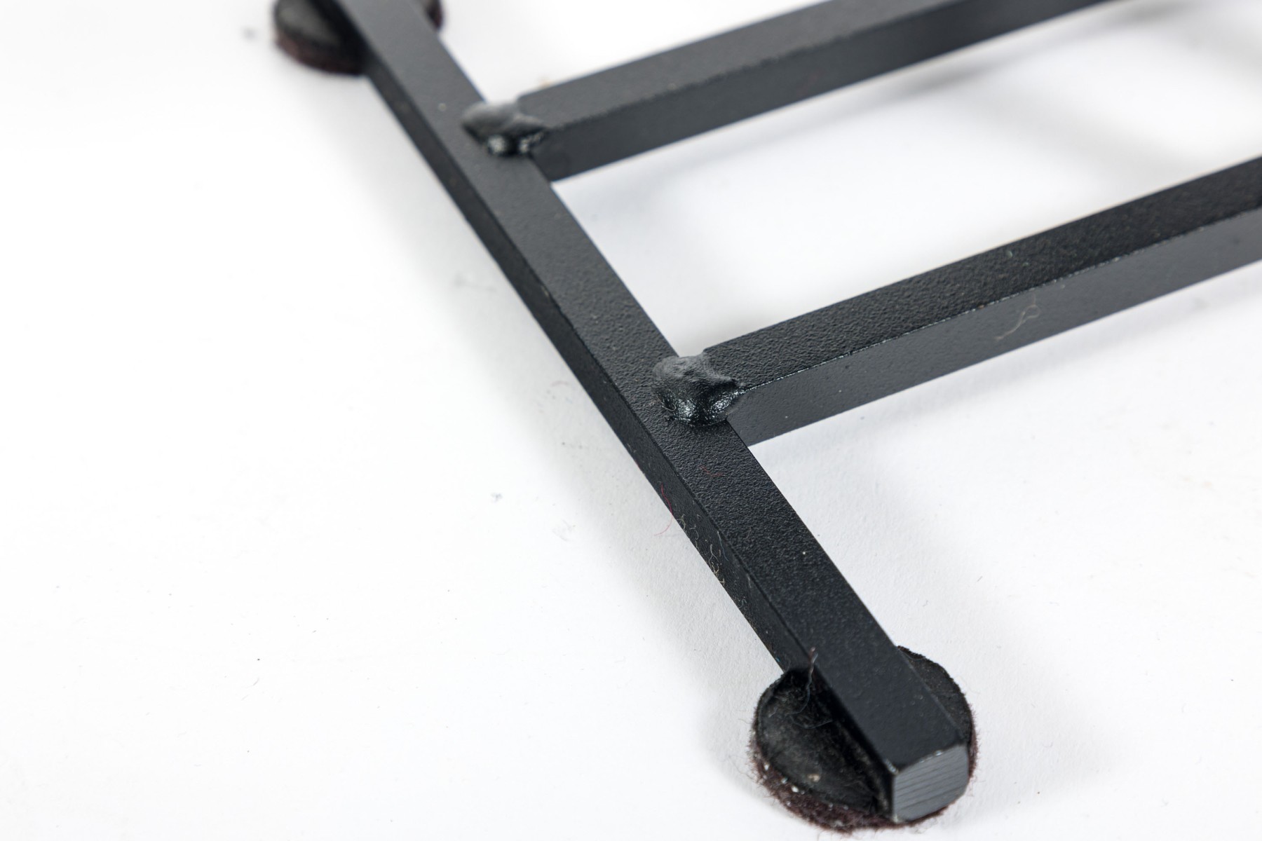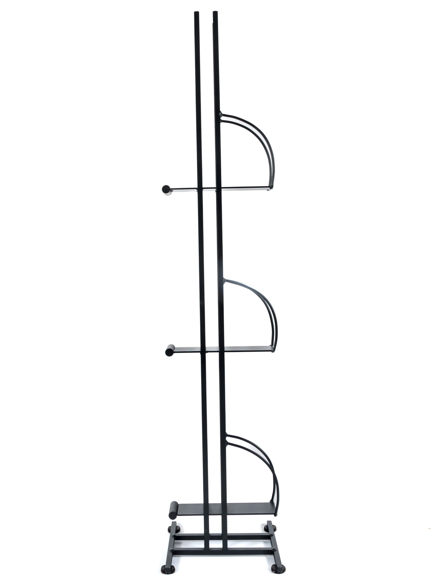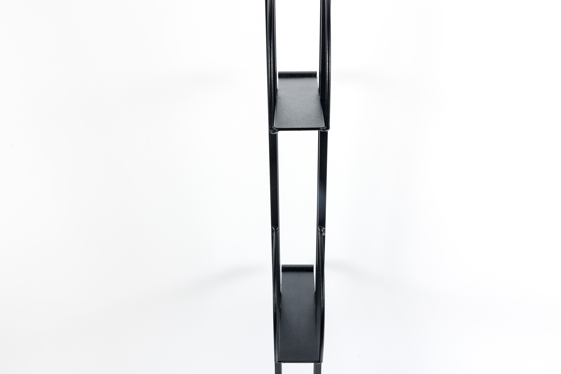 A mid-century modern style three-tier magazine rack finished in a black powder-coat over steel.