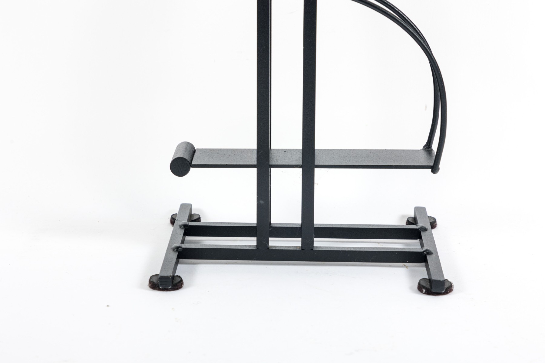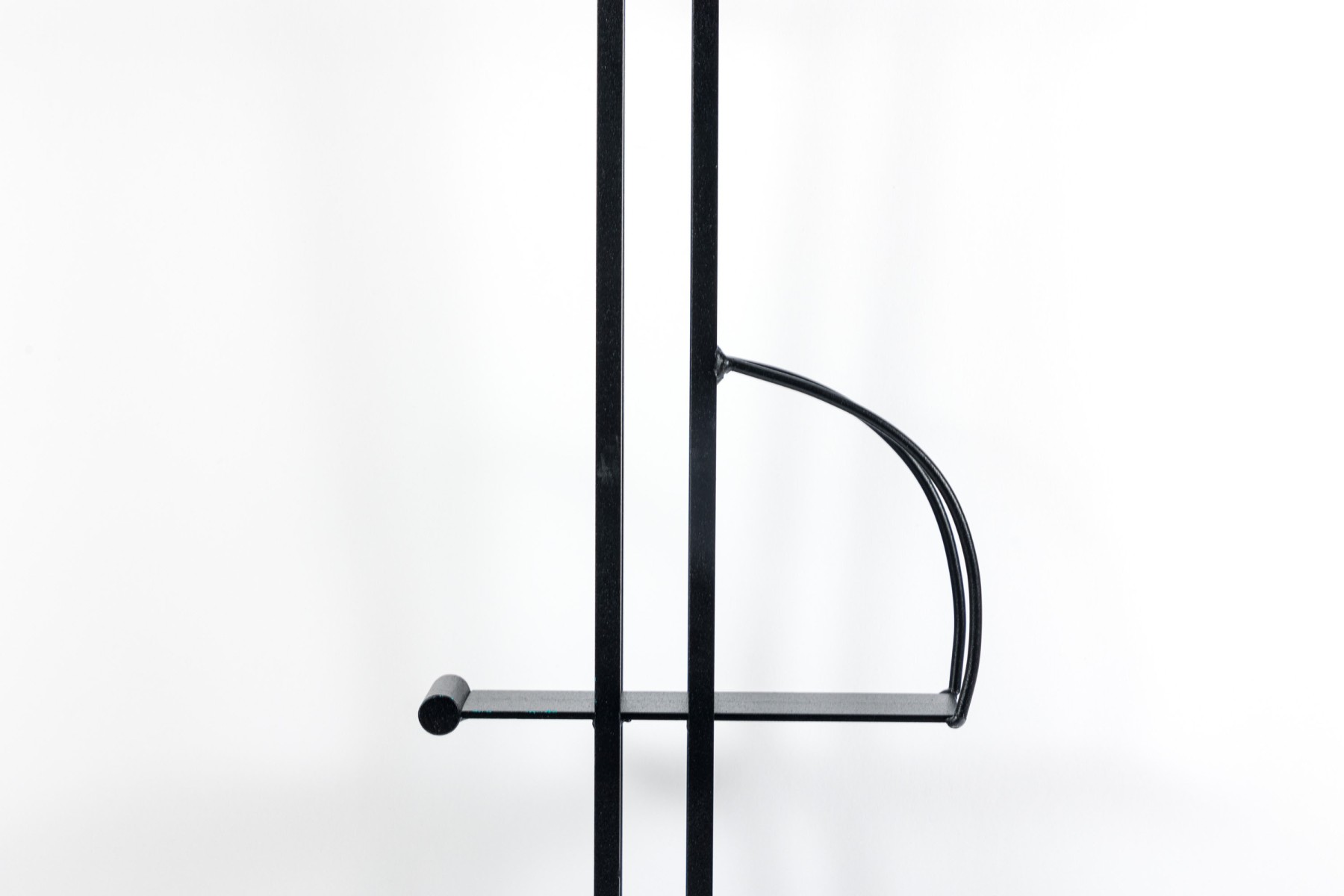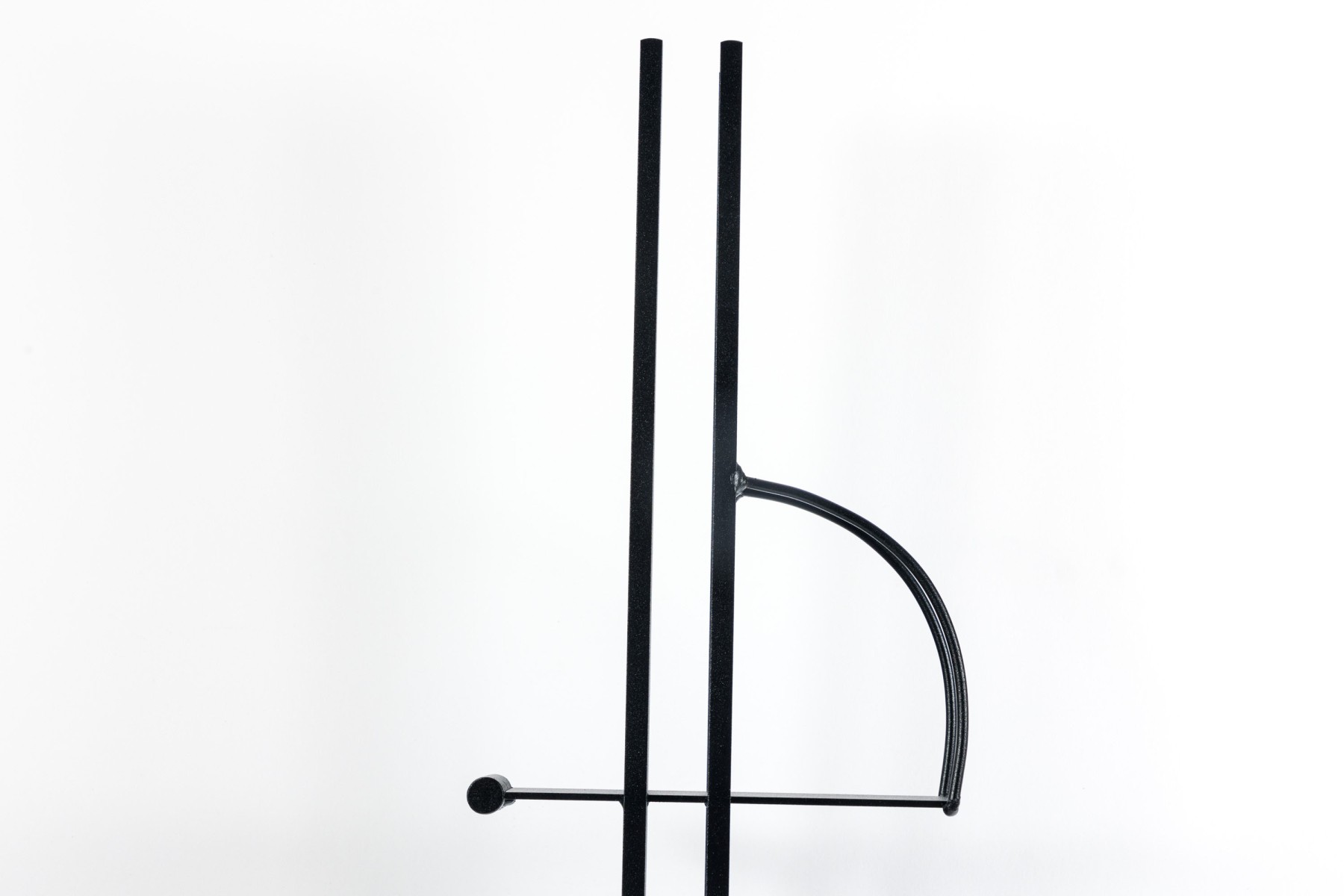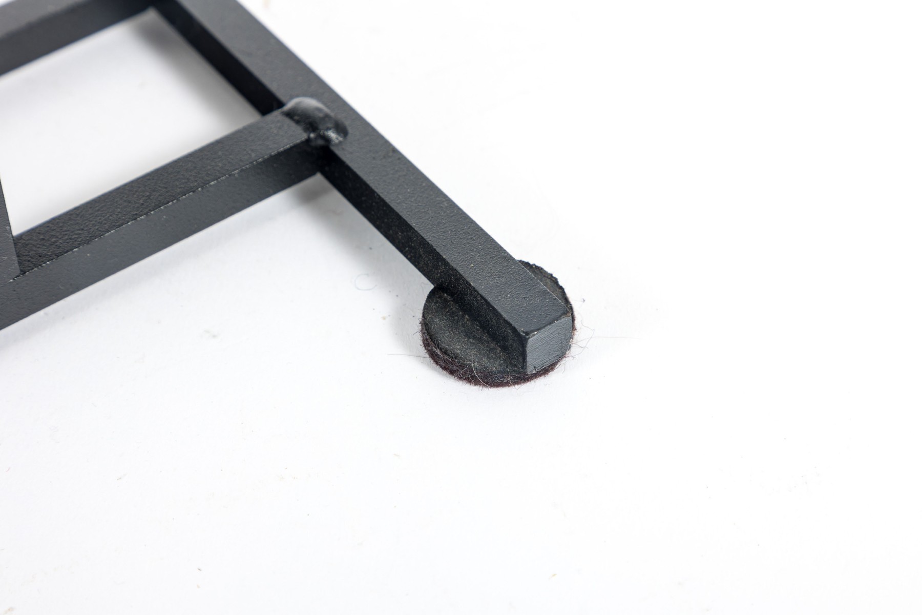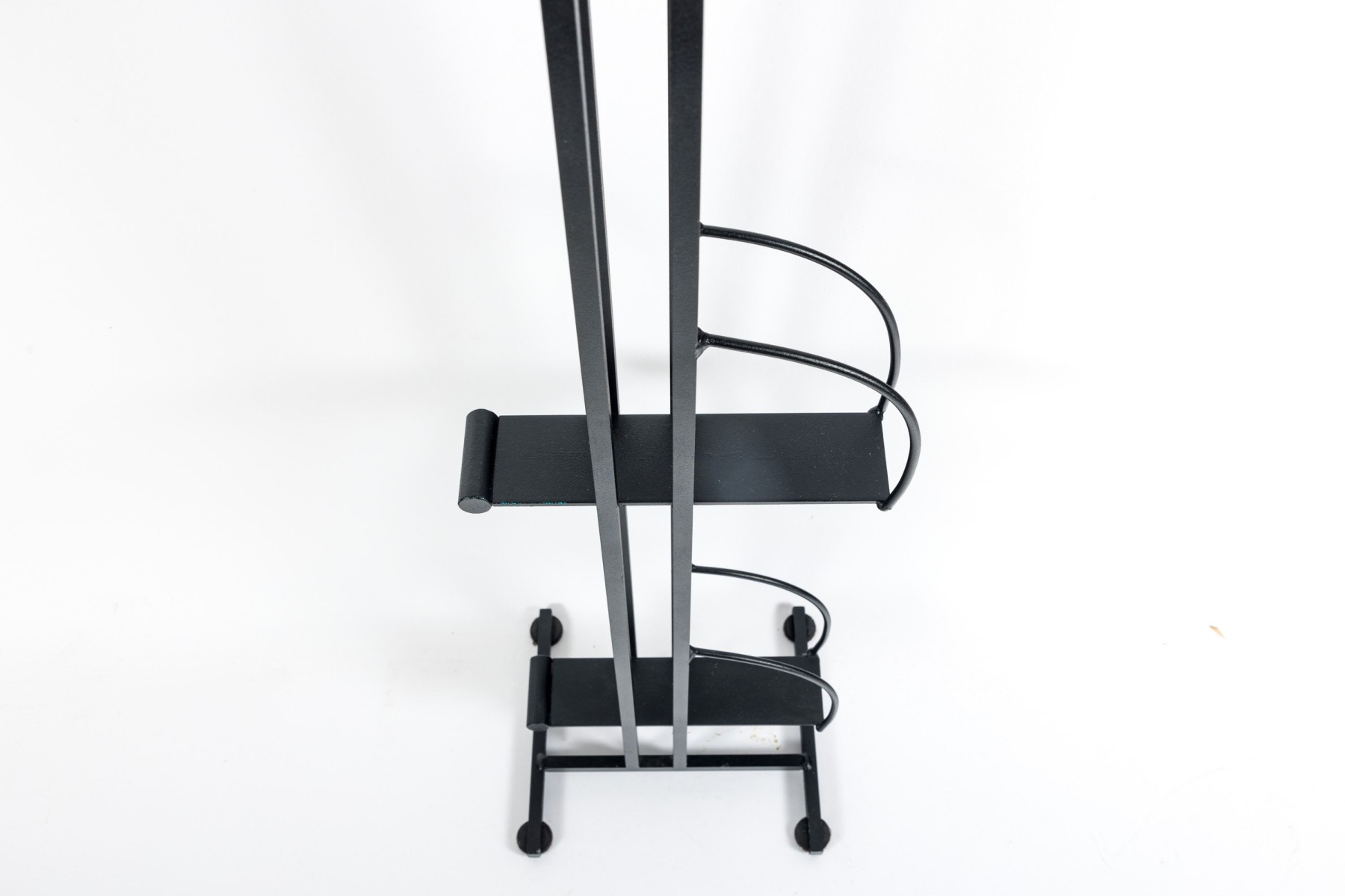 A mid-century modern style three-tier magazine rack finished in a black powder-coat over steel.