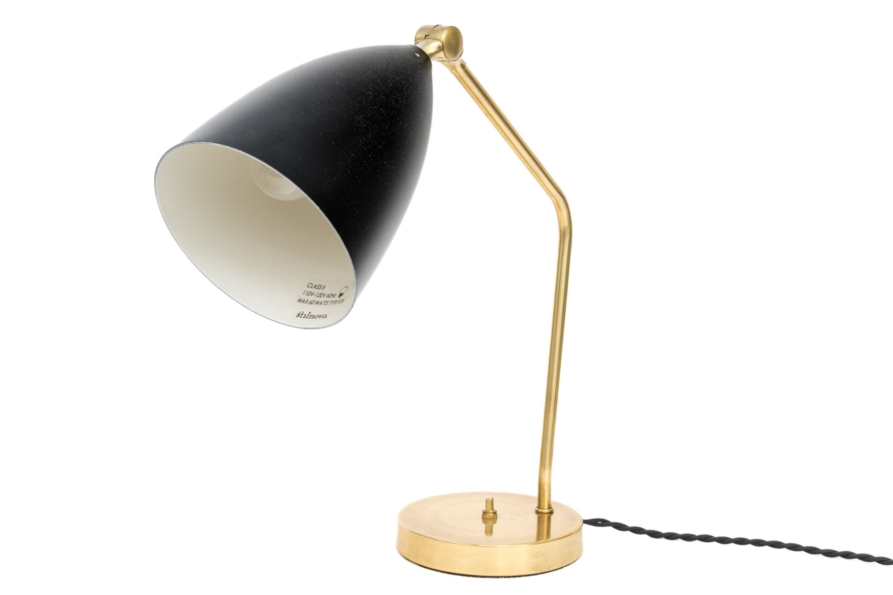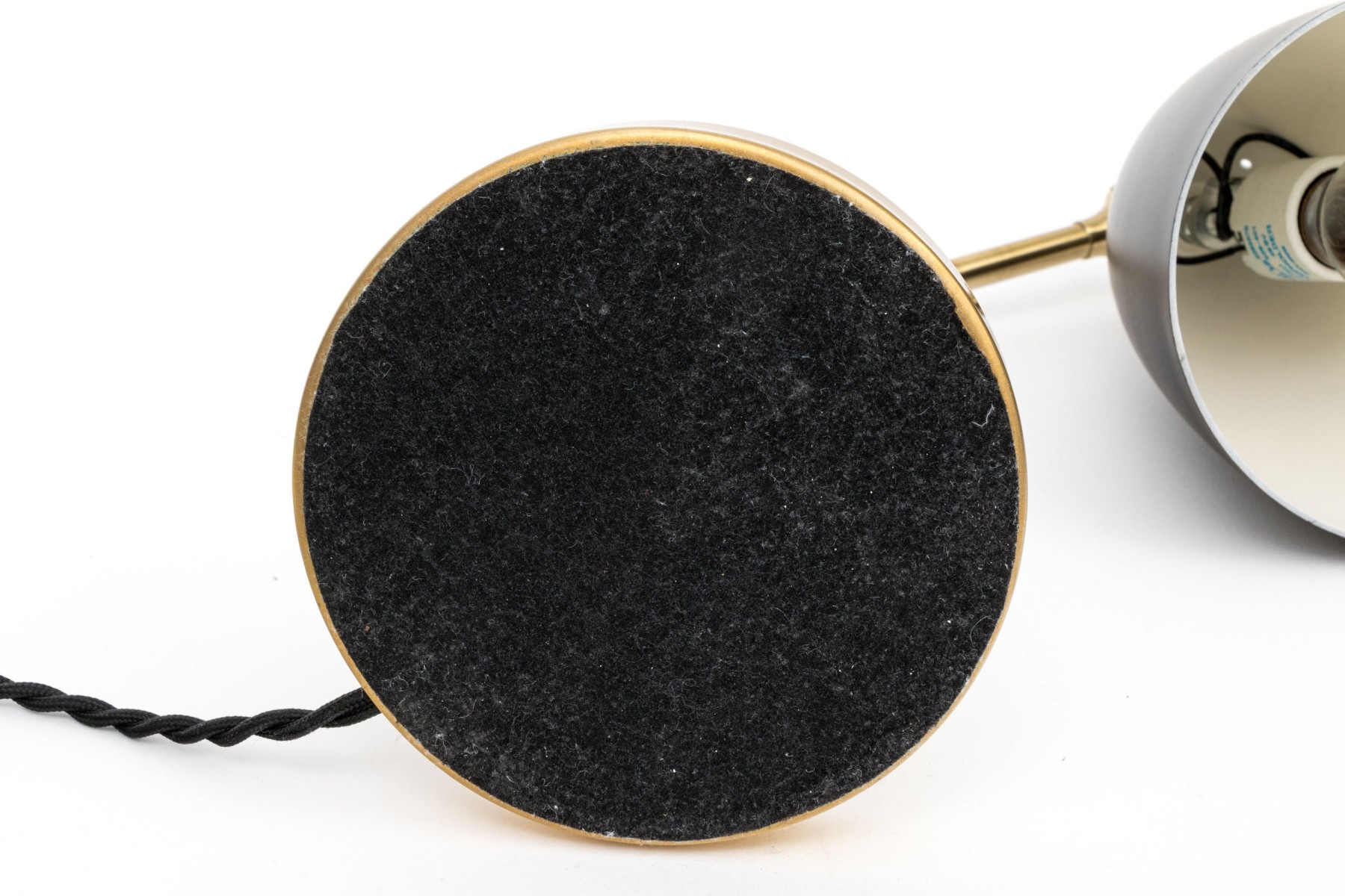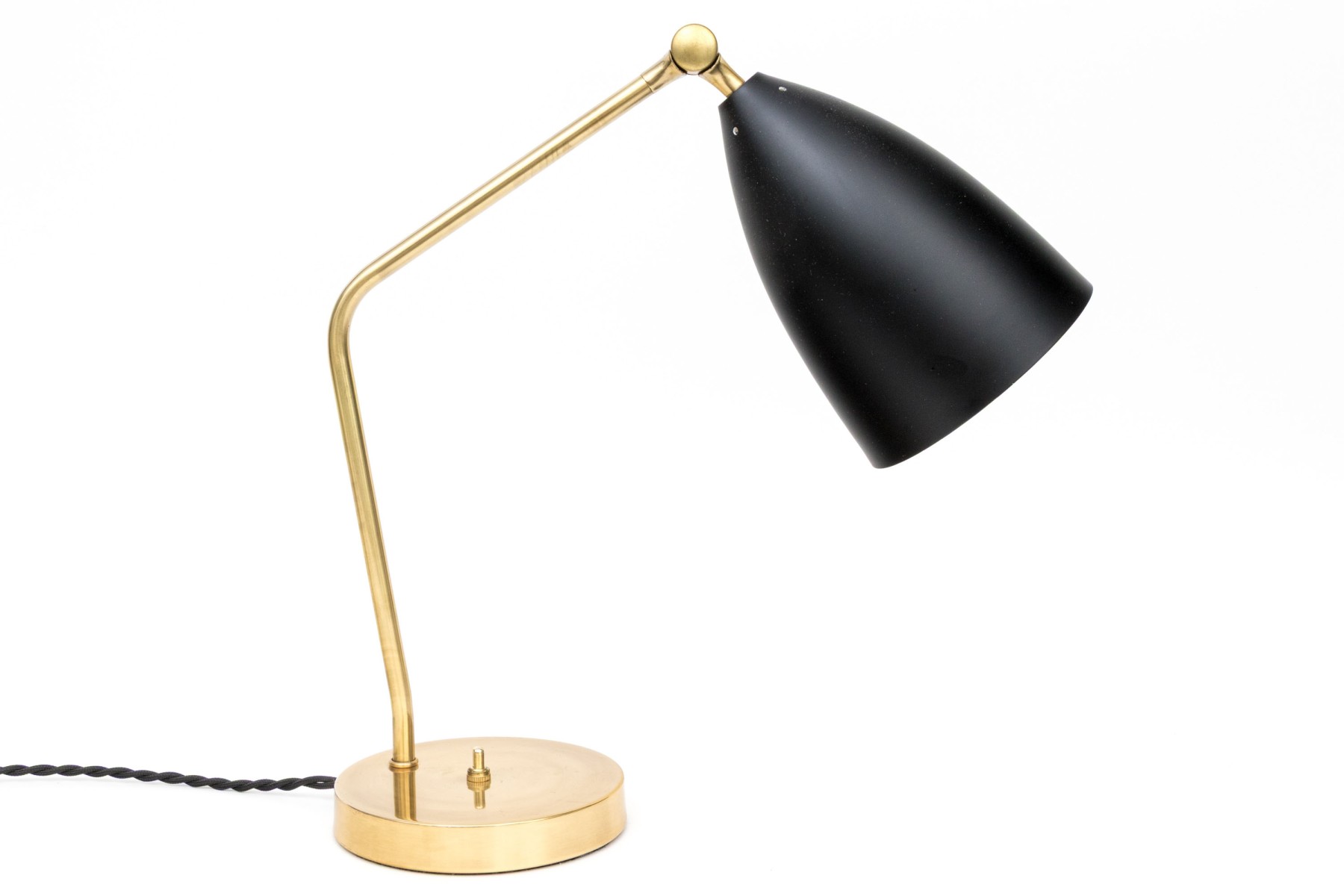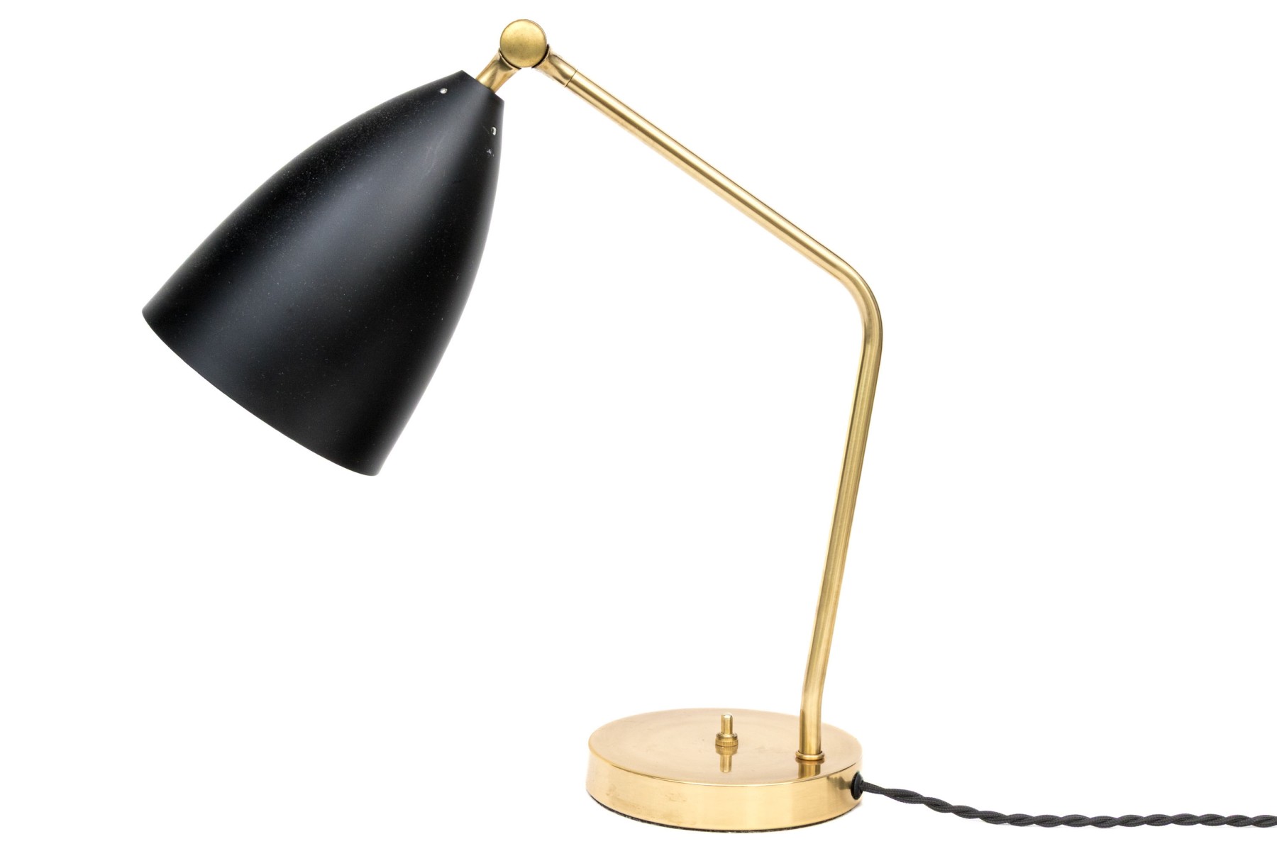 A fine example of their desk lamp designs in heavy brass with a black metal shade on a swivel adjustable mount. The circular base with a black cord.