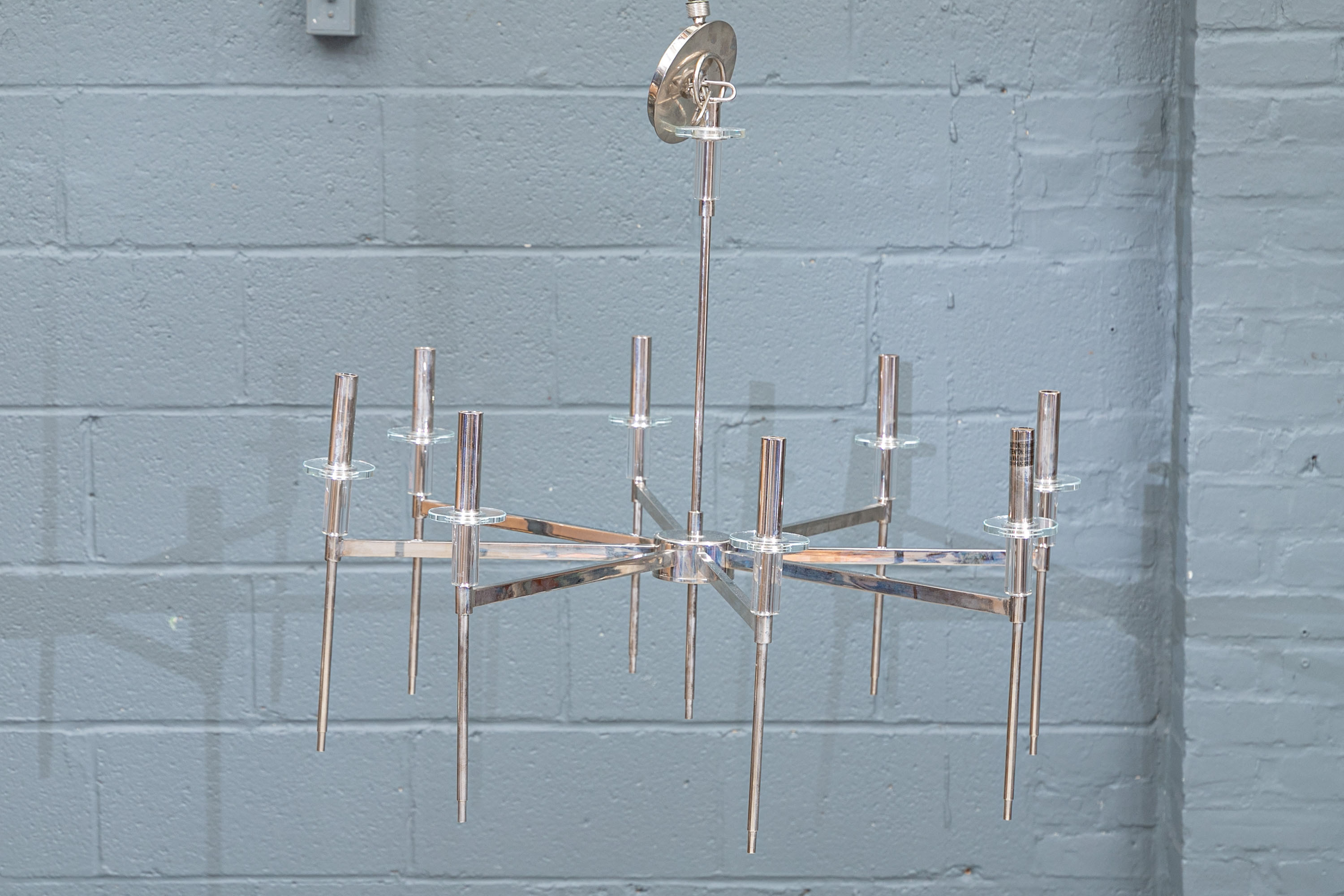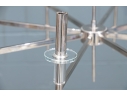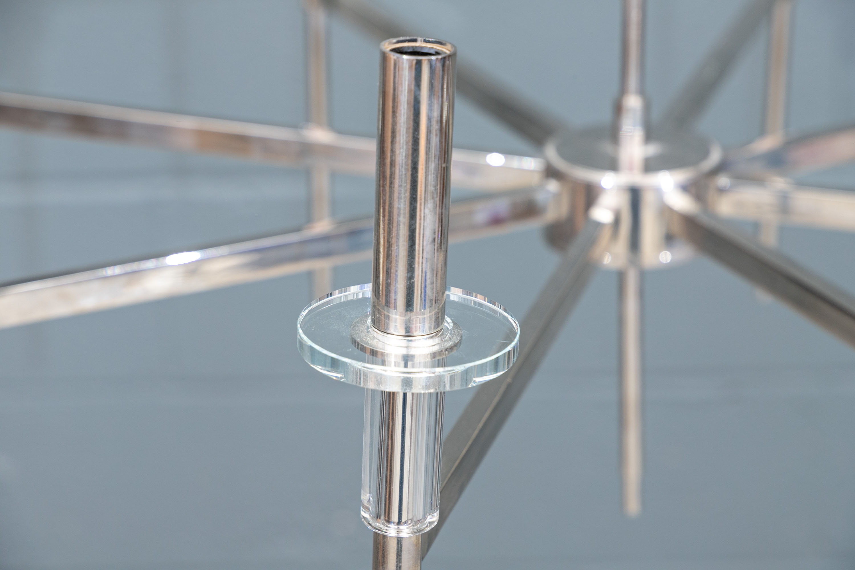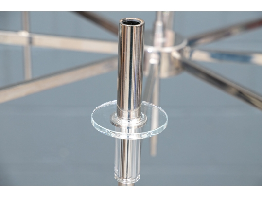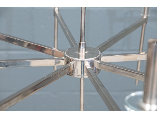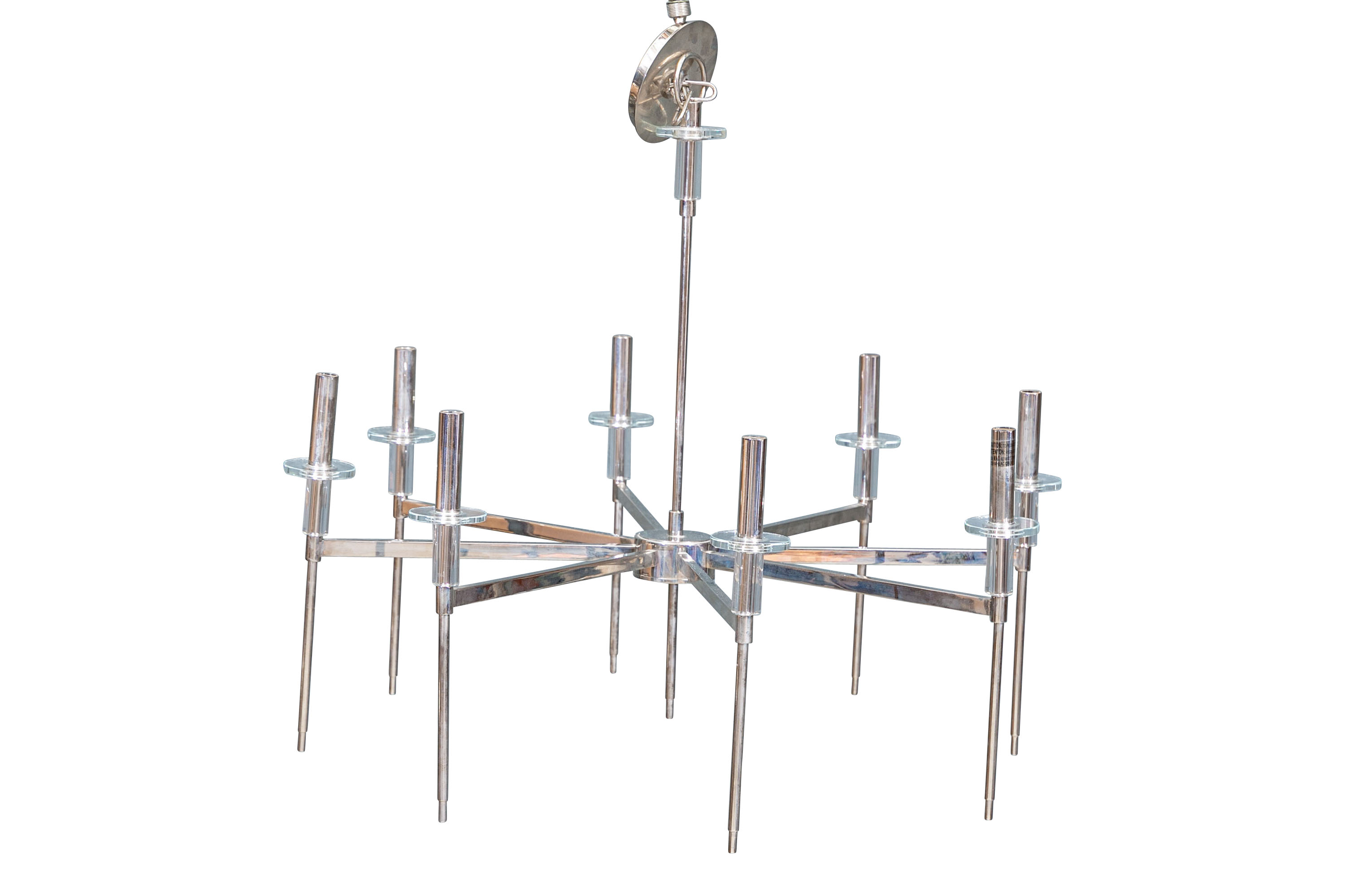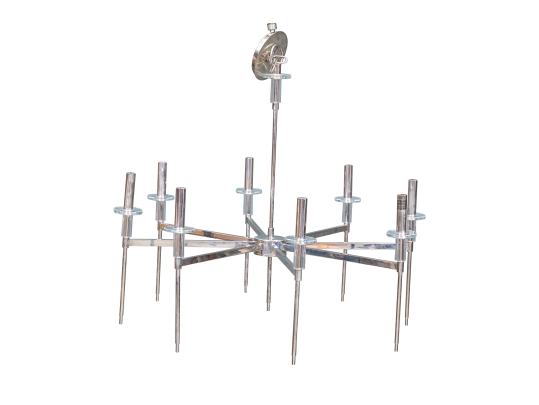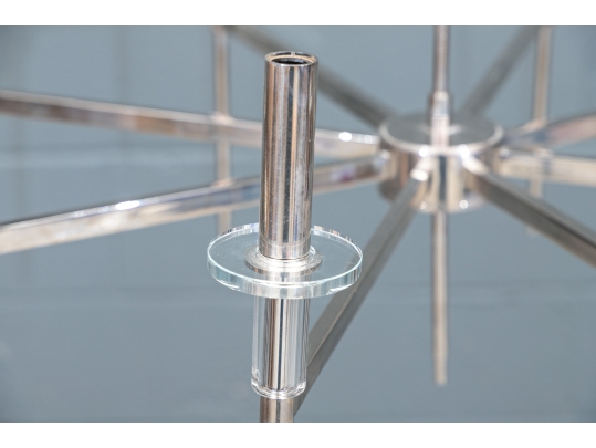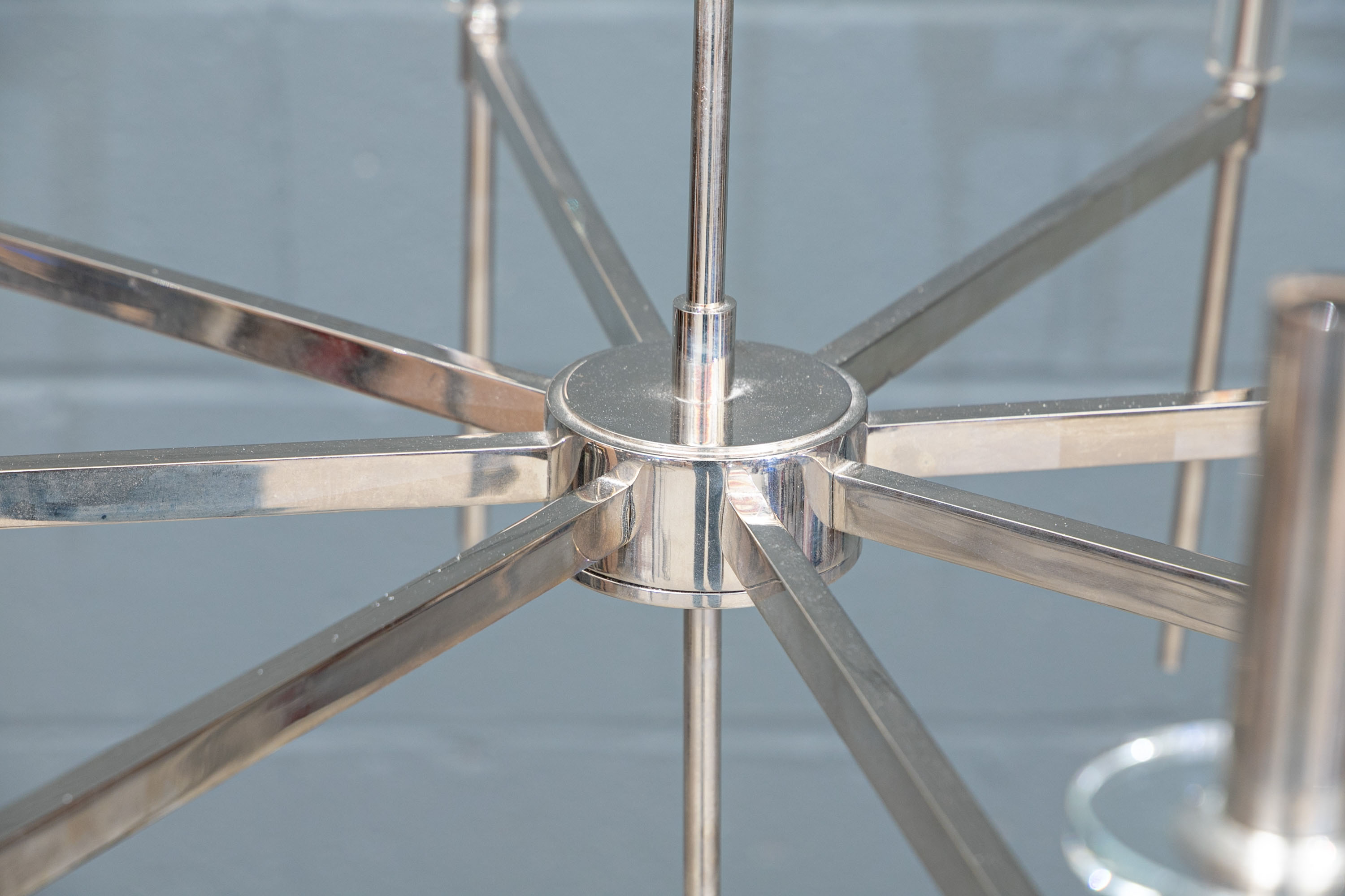 Quality Chrome Ceiling Fixture with Eight Arms having thick glass collar Bobeche on each socket and at the top. Includes Ceiling Plate and there is a hanging ring on the top. Very well made and in very good condition.