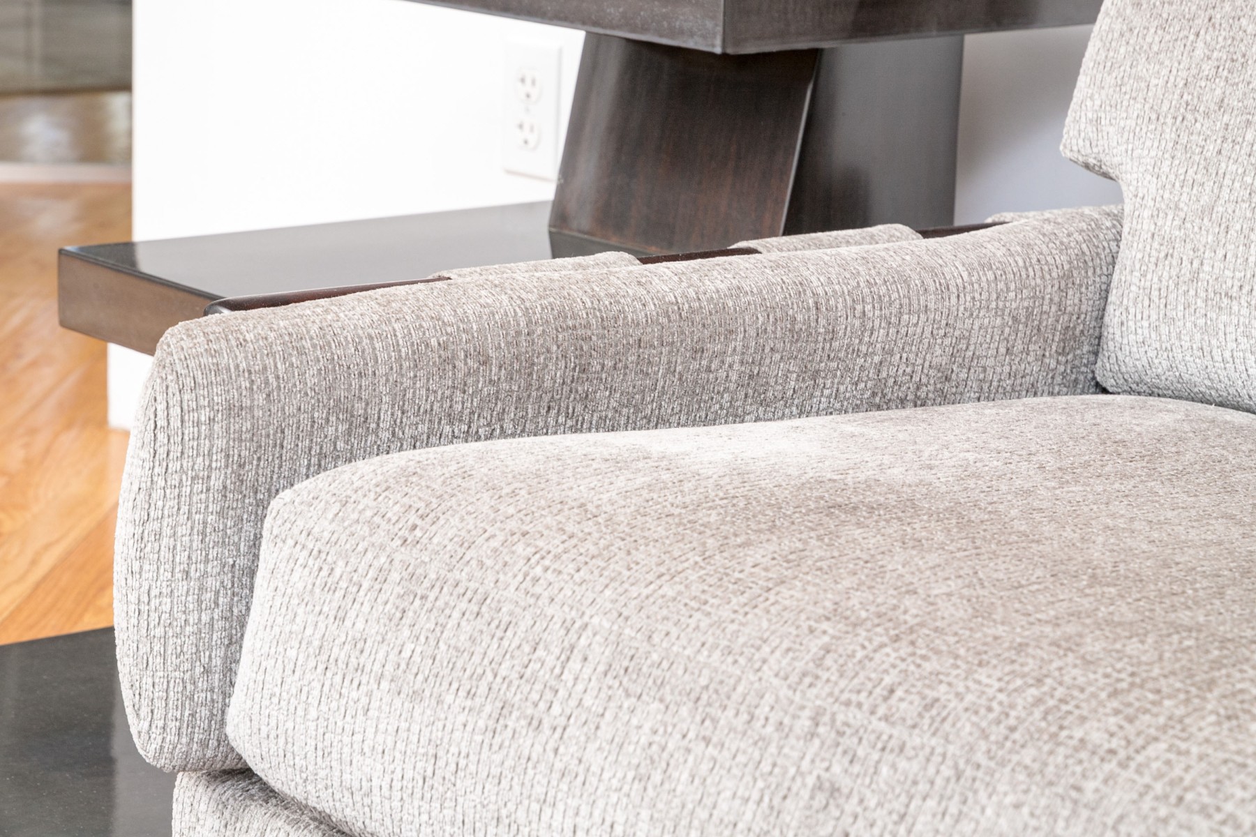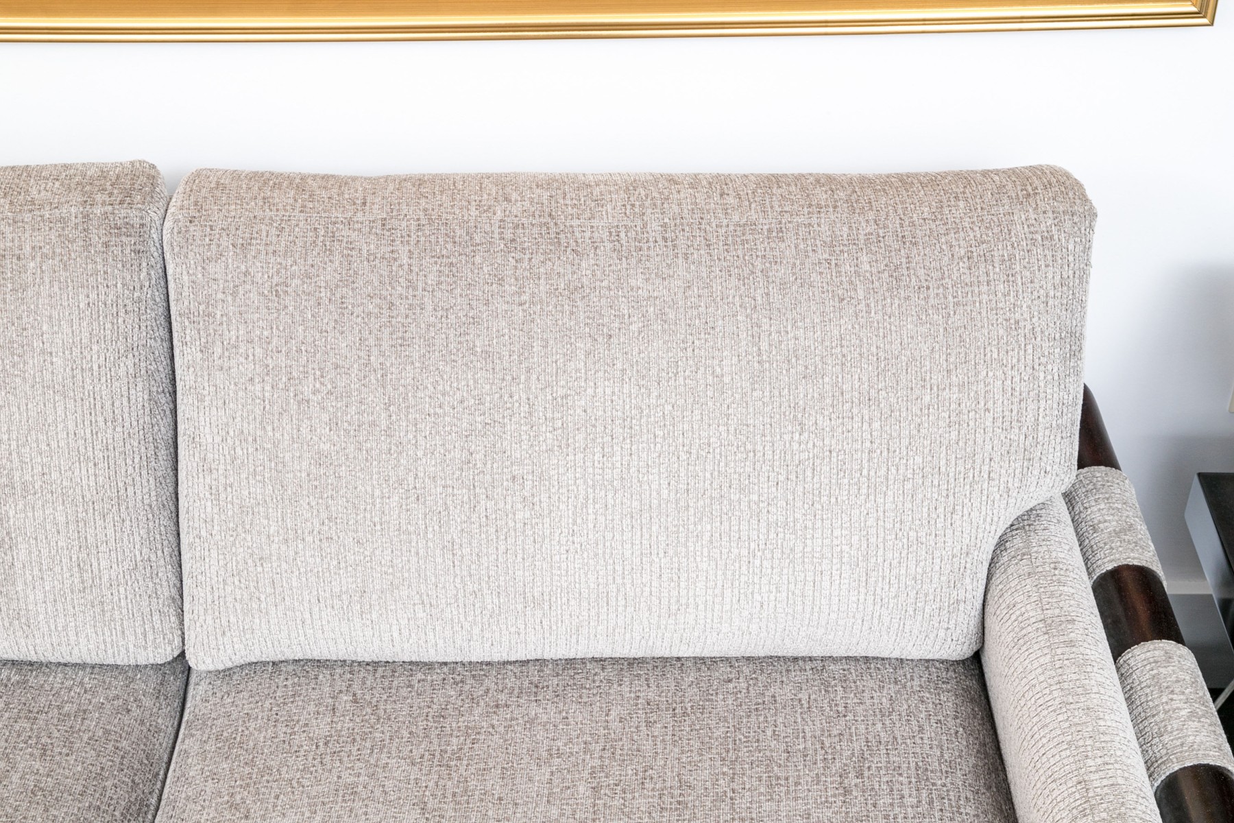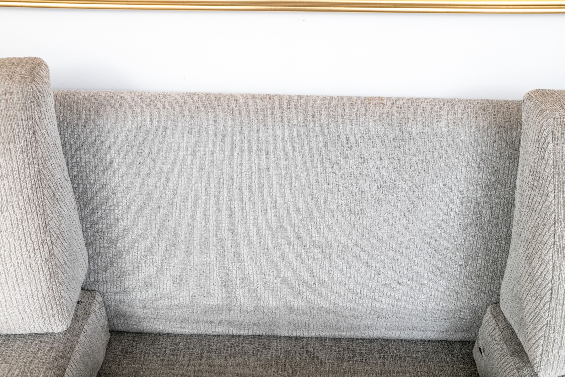 In dark wood with solid tubular construction. Upholstered in a pale greenish-gray fabric with wide straps on the arms. With back and seat cushions and slim ones at the arms.