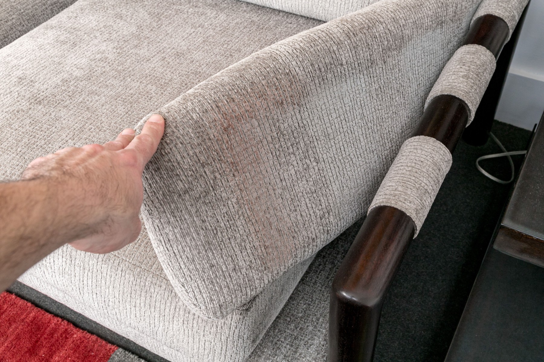 Condition: faded fabric on the straps, seat rail, and the back top edge, sunstruck seat cushions, soiled and discolored arms and the cushions. Please review the photos as they are part of the condition report.