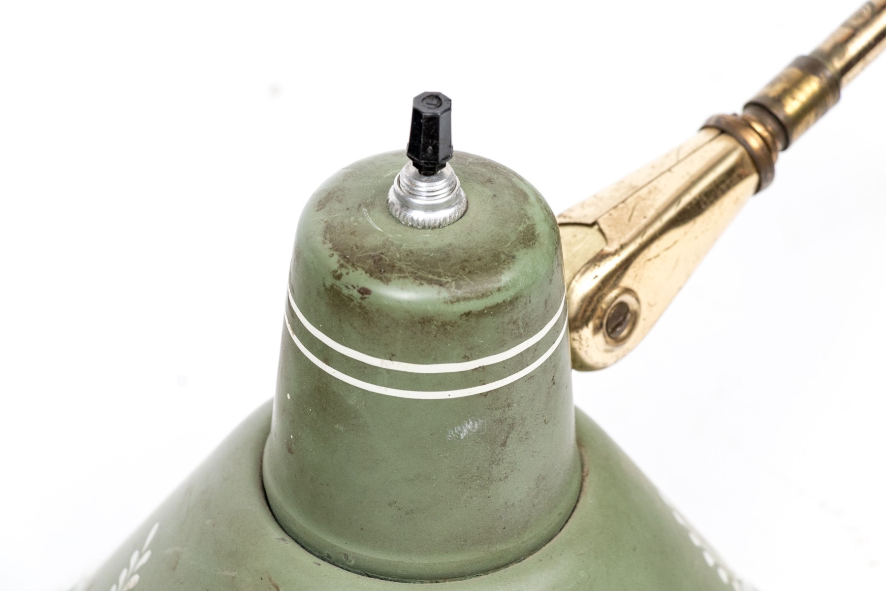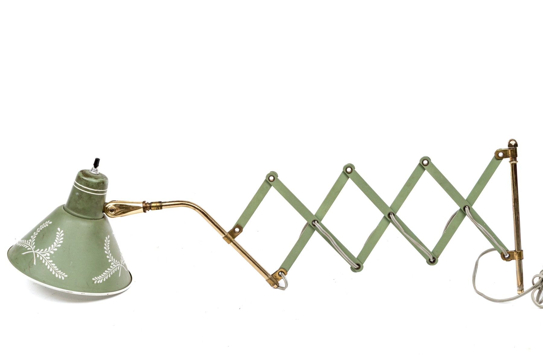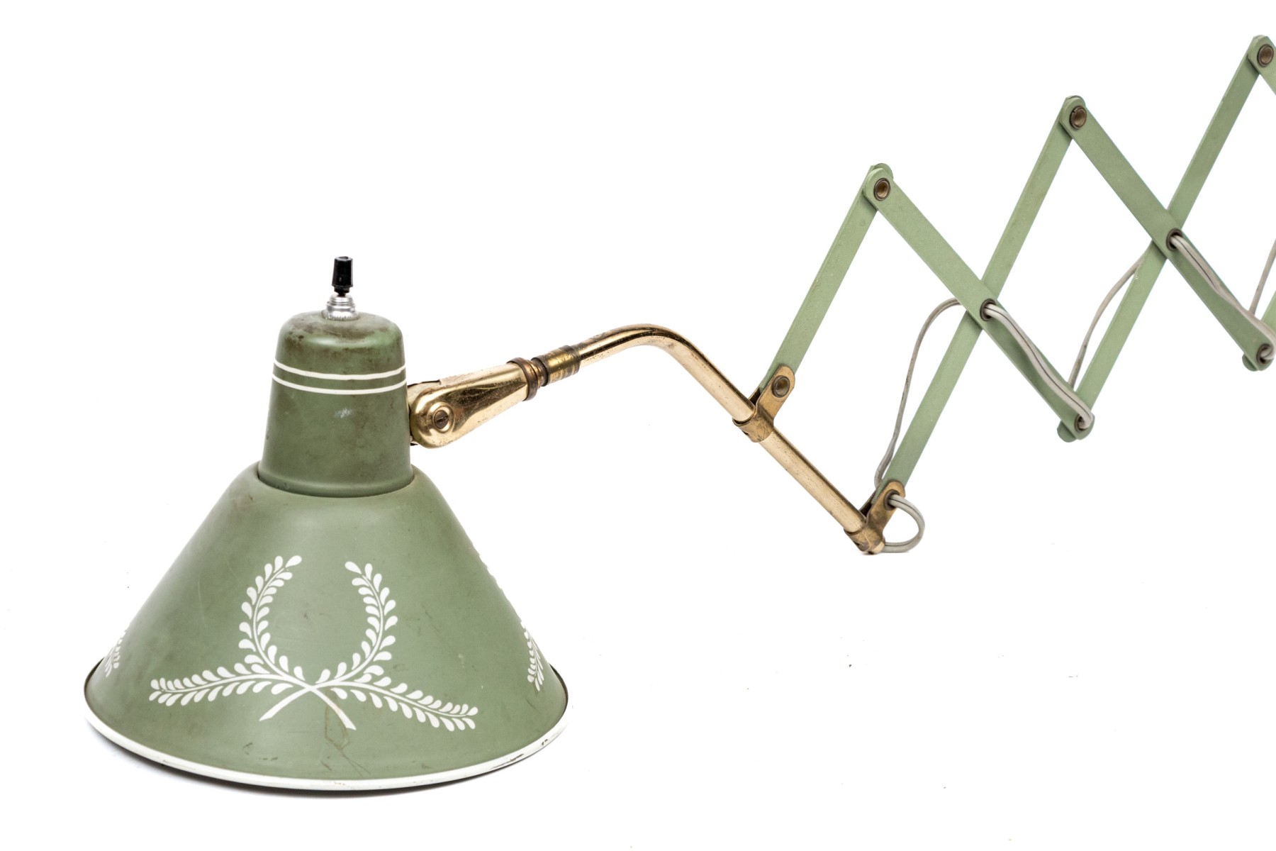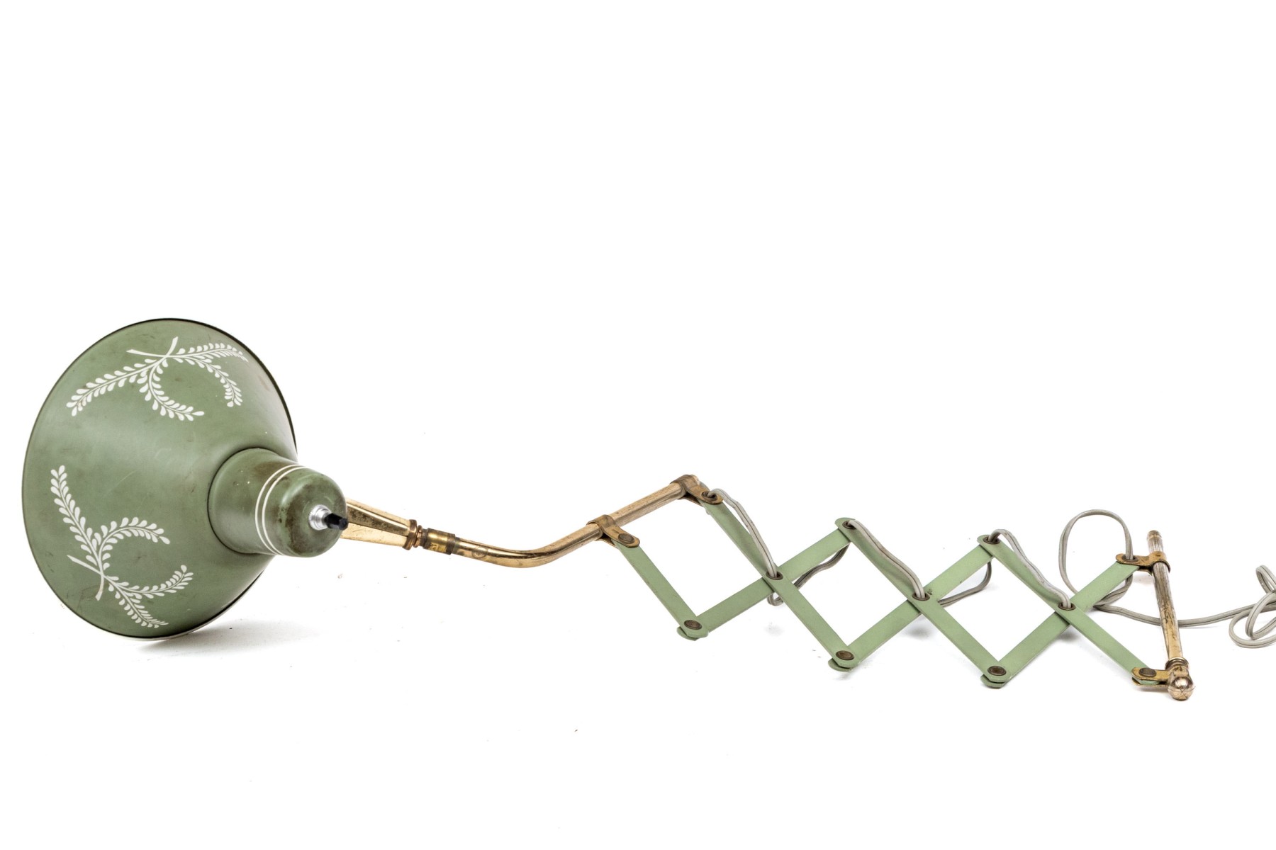 A charming mid-century wall lamp tole in beautiful sage green. The lamp features a conical shade painted with white wreaths and rims on a brass arm connecting to an adjustable accordian wall mount.