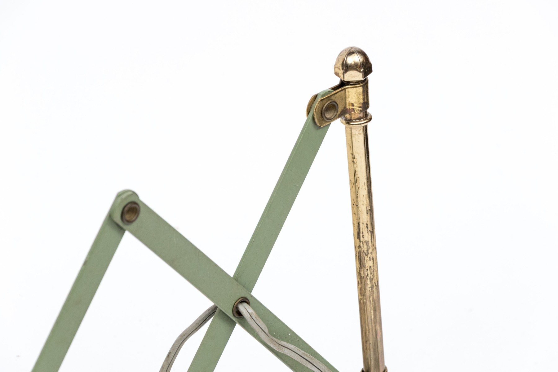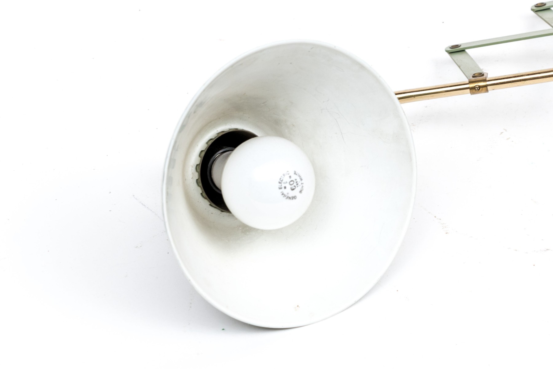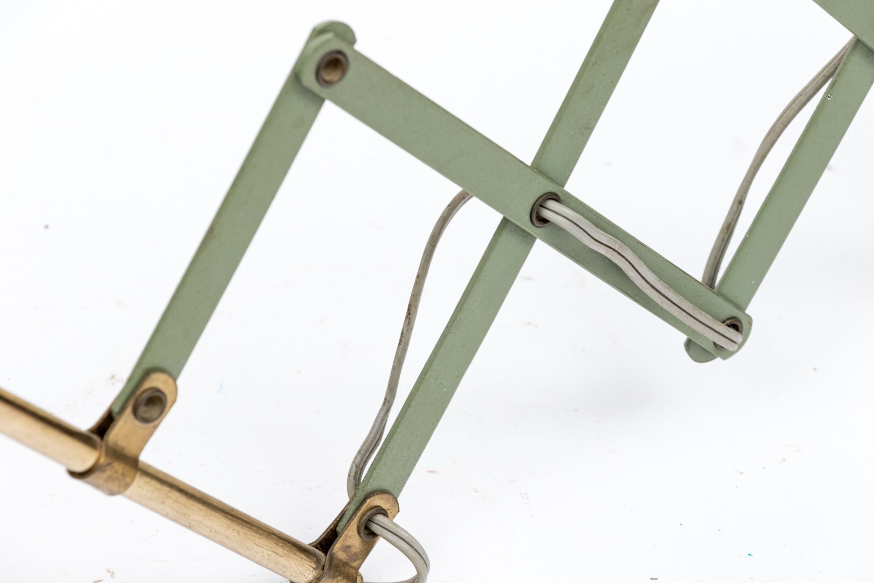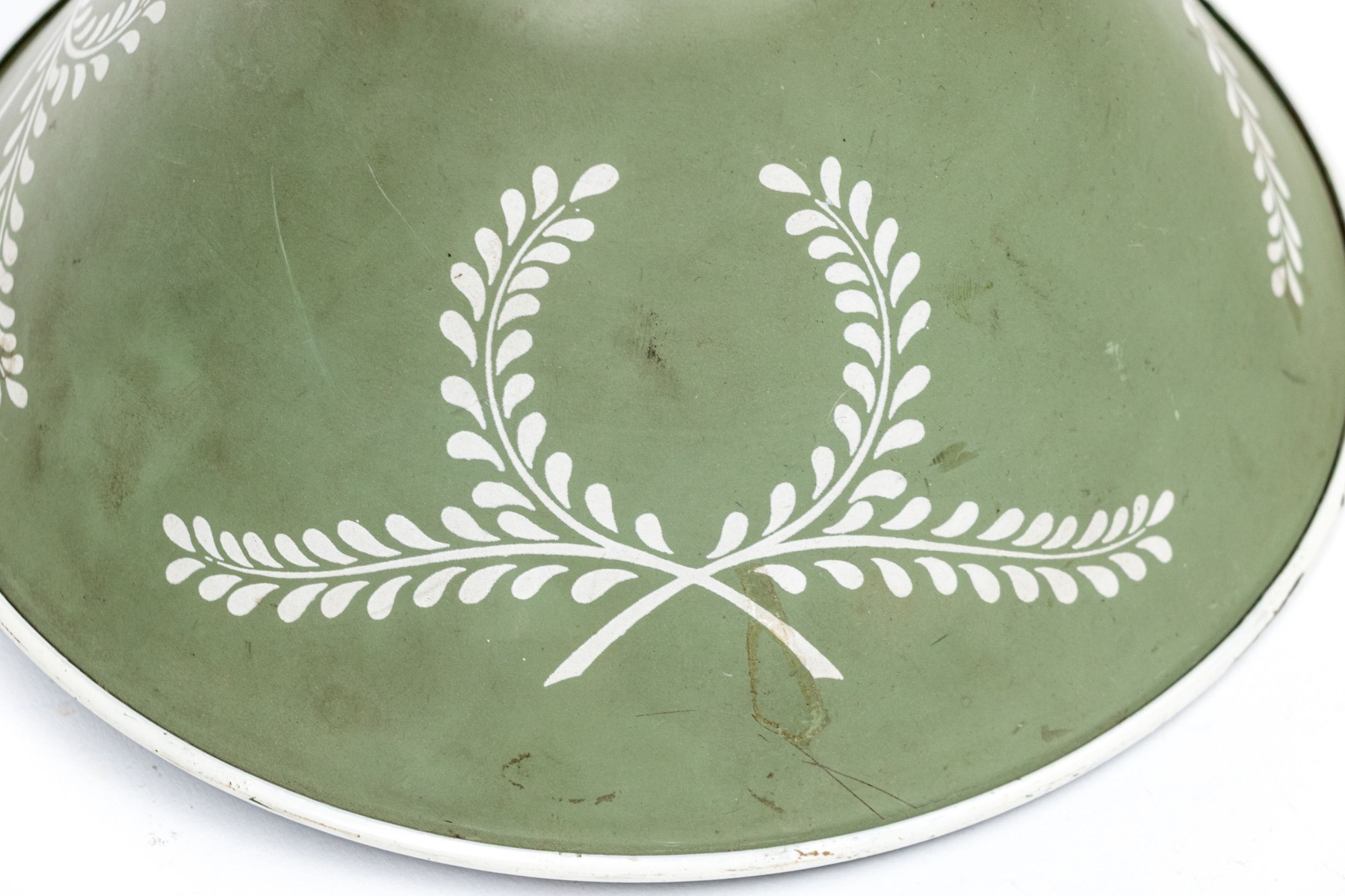 A charming mid-century wall lamp tole in beautiful sage green. The lamp features a conical shade painted with white wreaths and rims on a brass arm connecting to an adjustable accordian wall mount.
