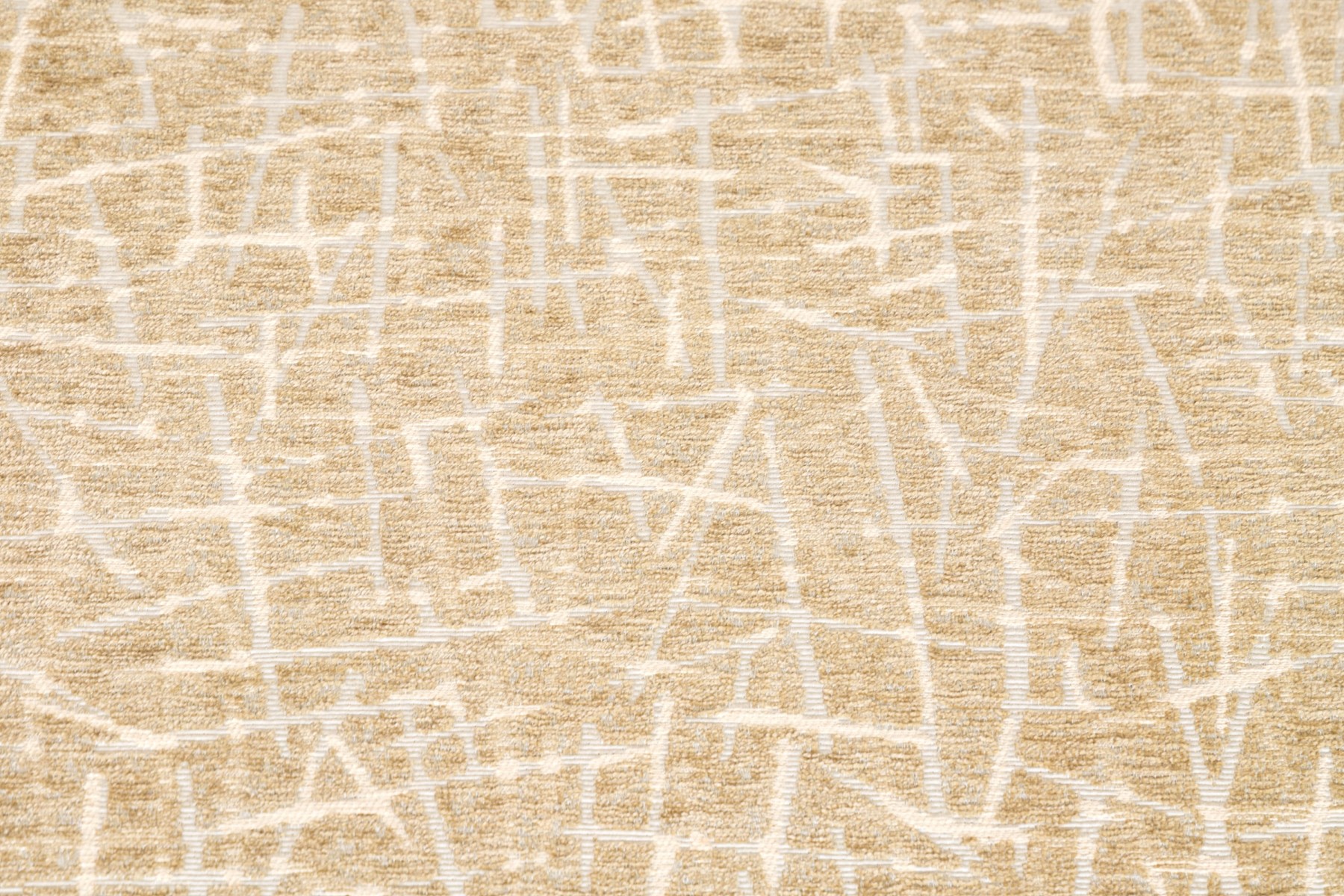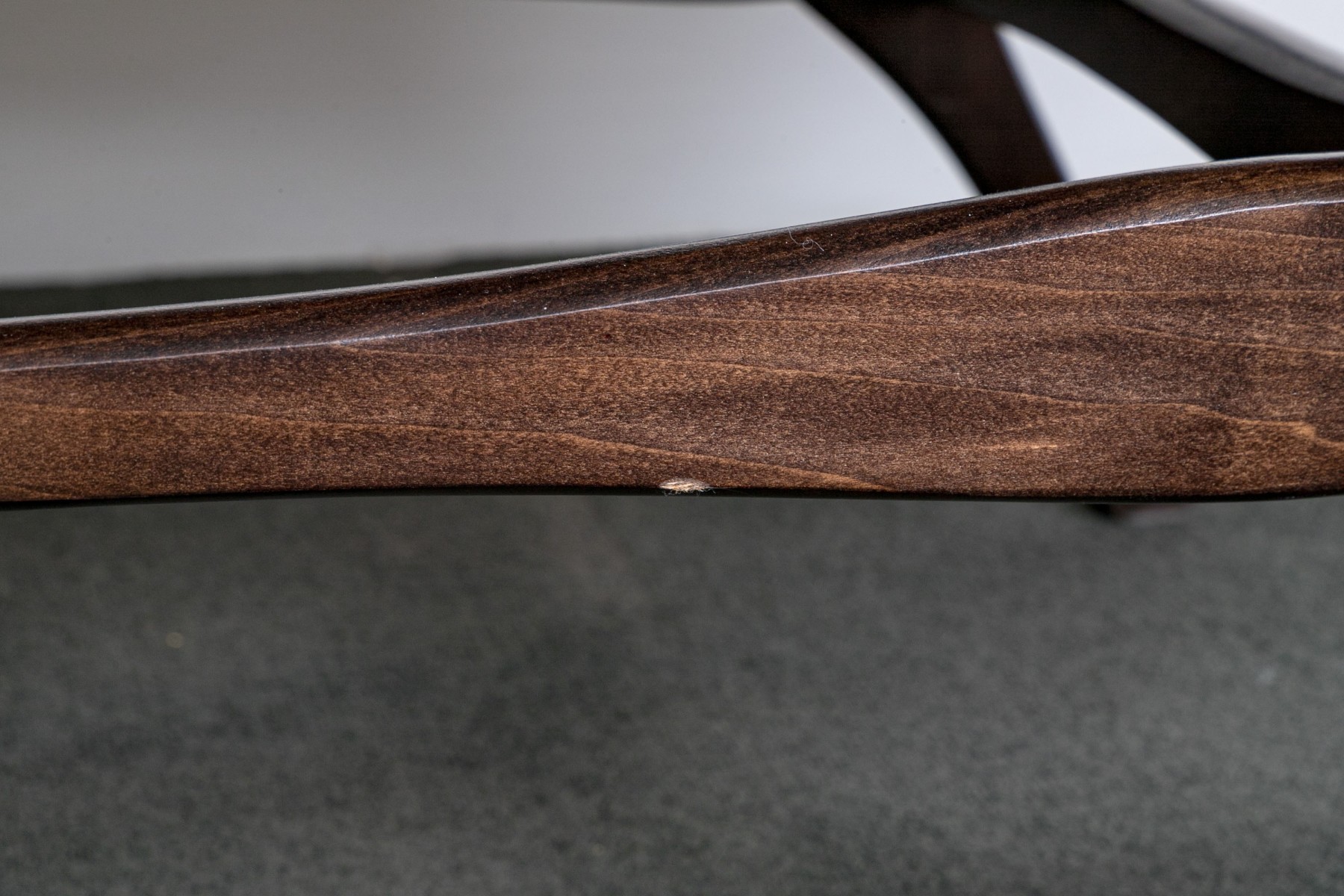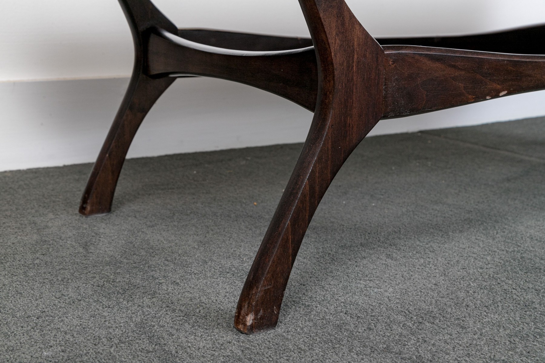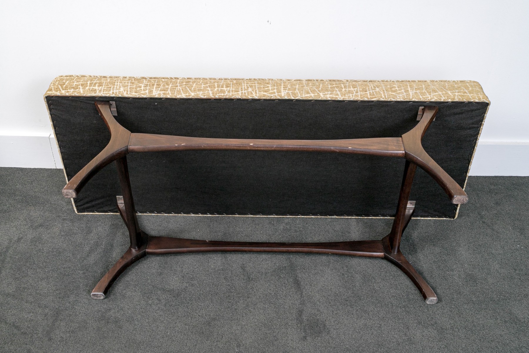 A dark stained openwork frame with curved splayed legs and curved stretchers on all sides. The seat upholstered in a cut textured fabric in greenish tan and white.