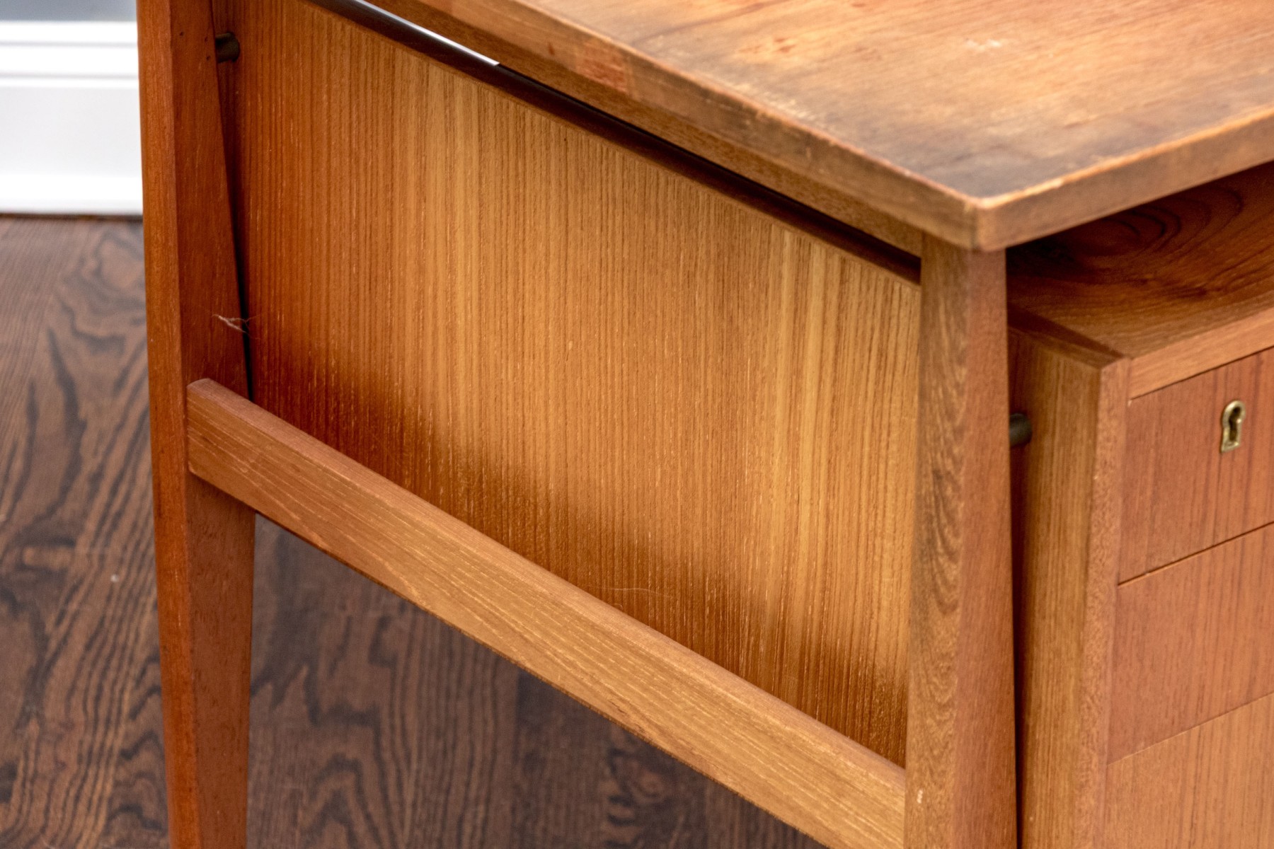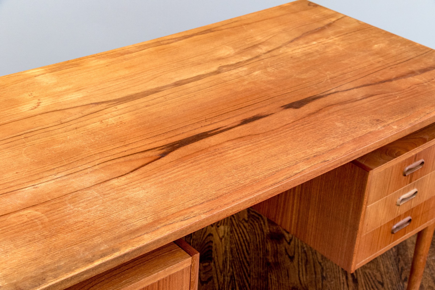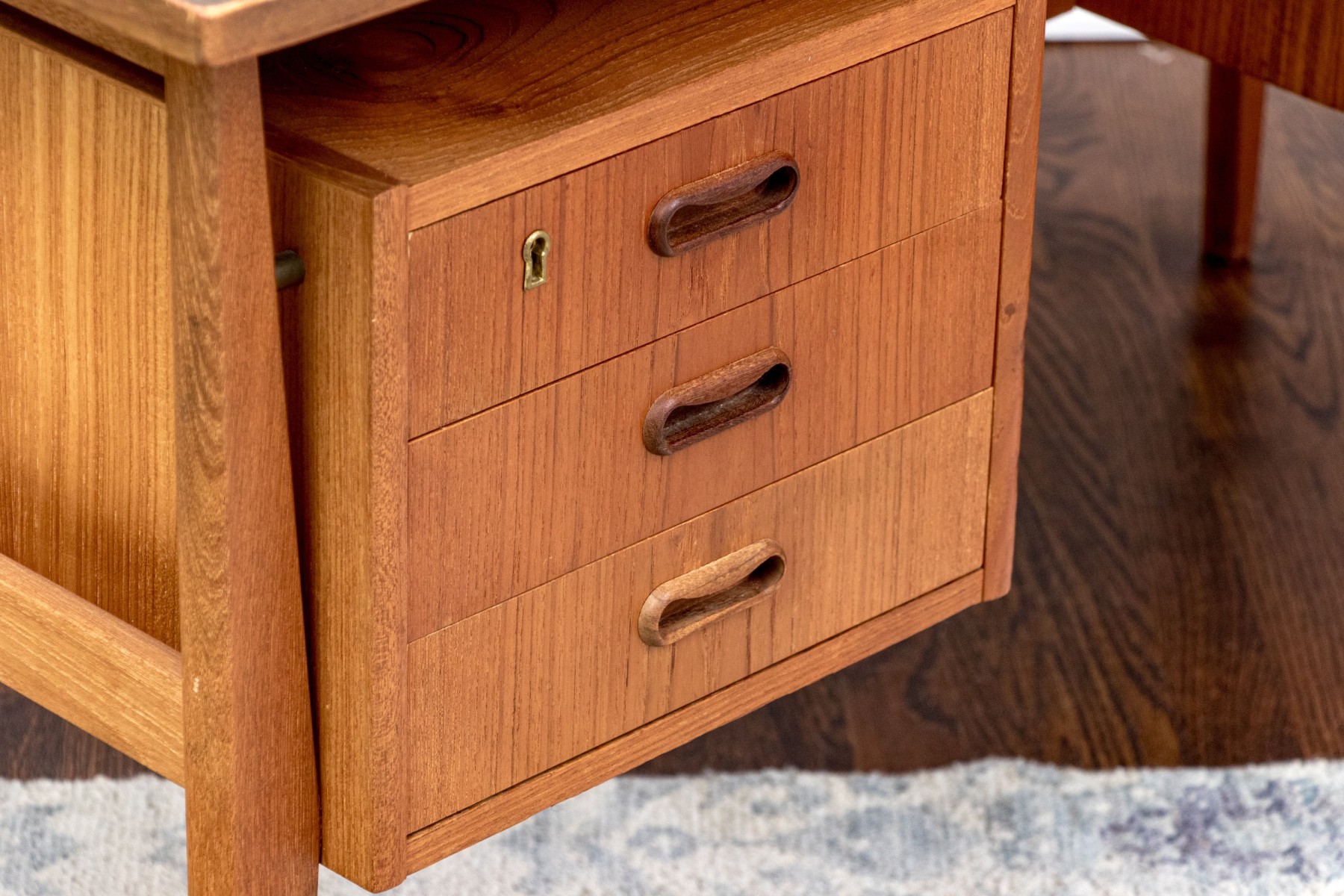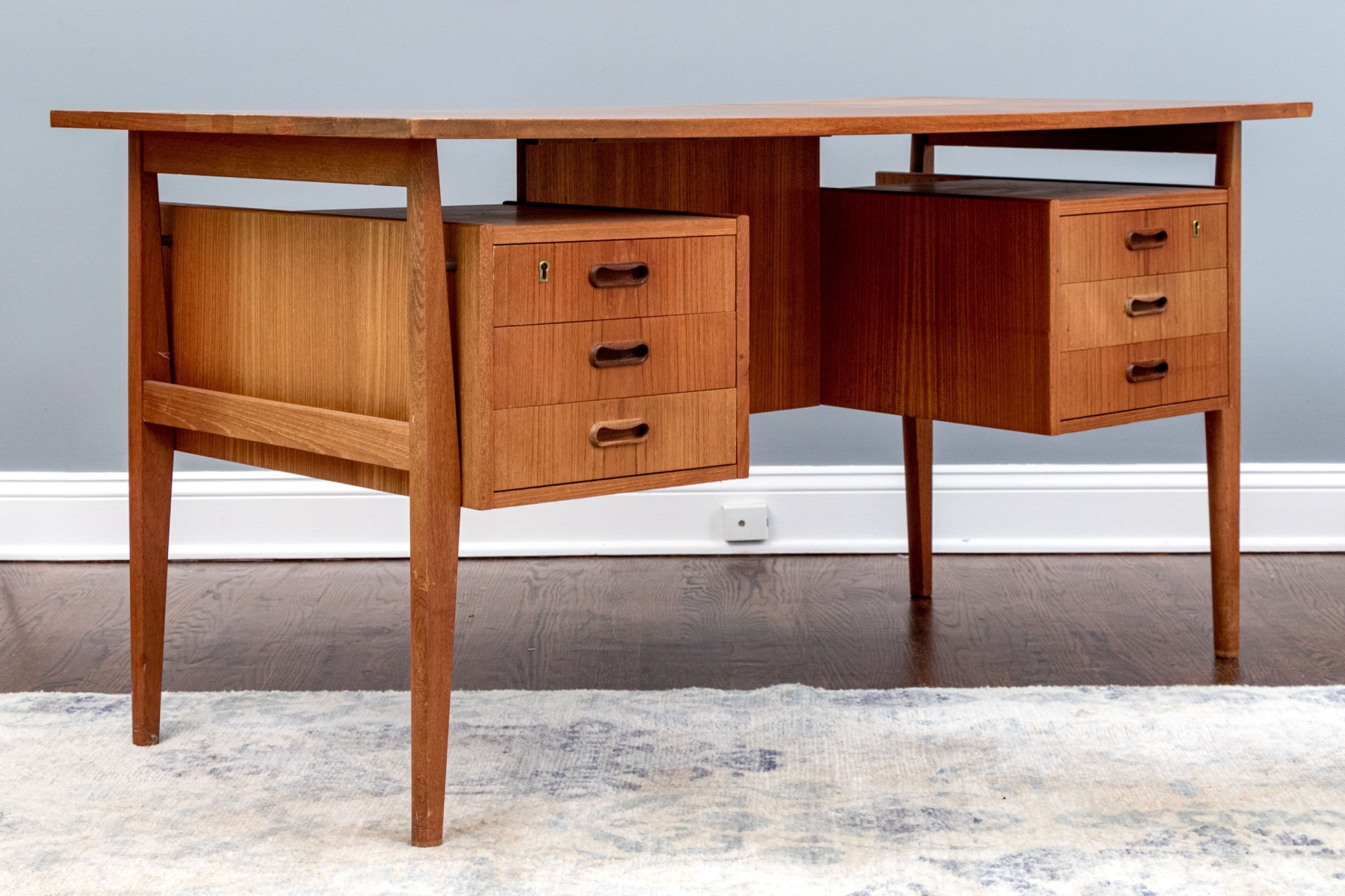 A stylish vintage Danish desk well crafted in orange-brown teak, standing on four square tapered form legs with table top above. Below the table top is fitted with two bays of three drawers. The top drawer on each bay of drawers with brass key escutcheon. Key included.