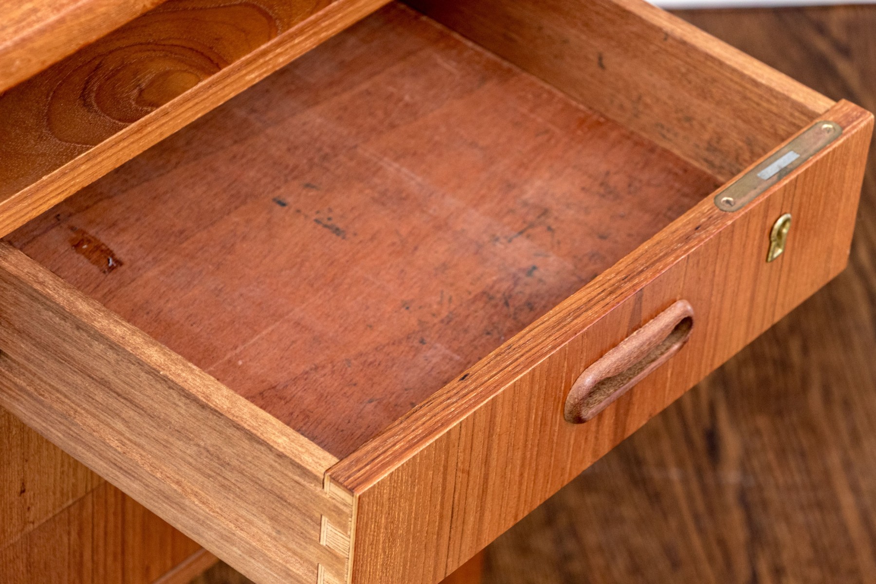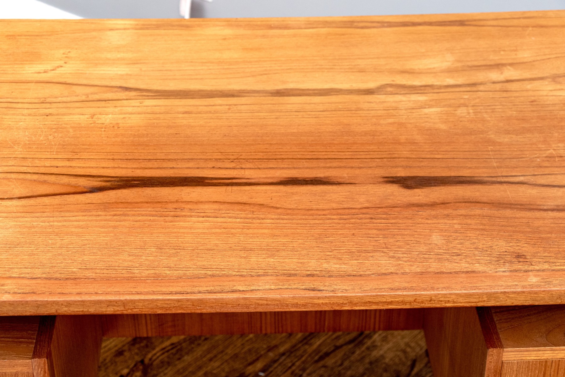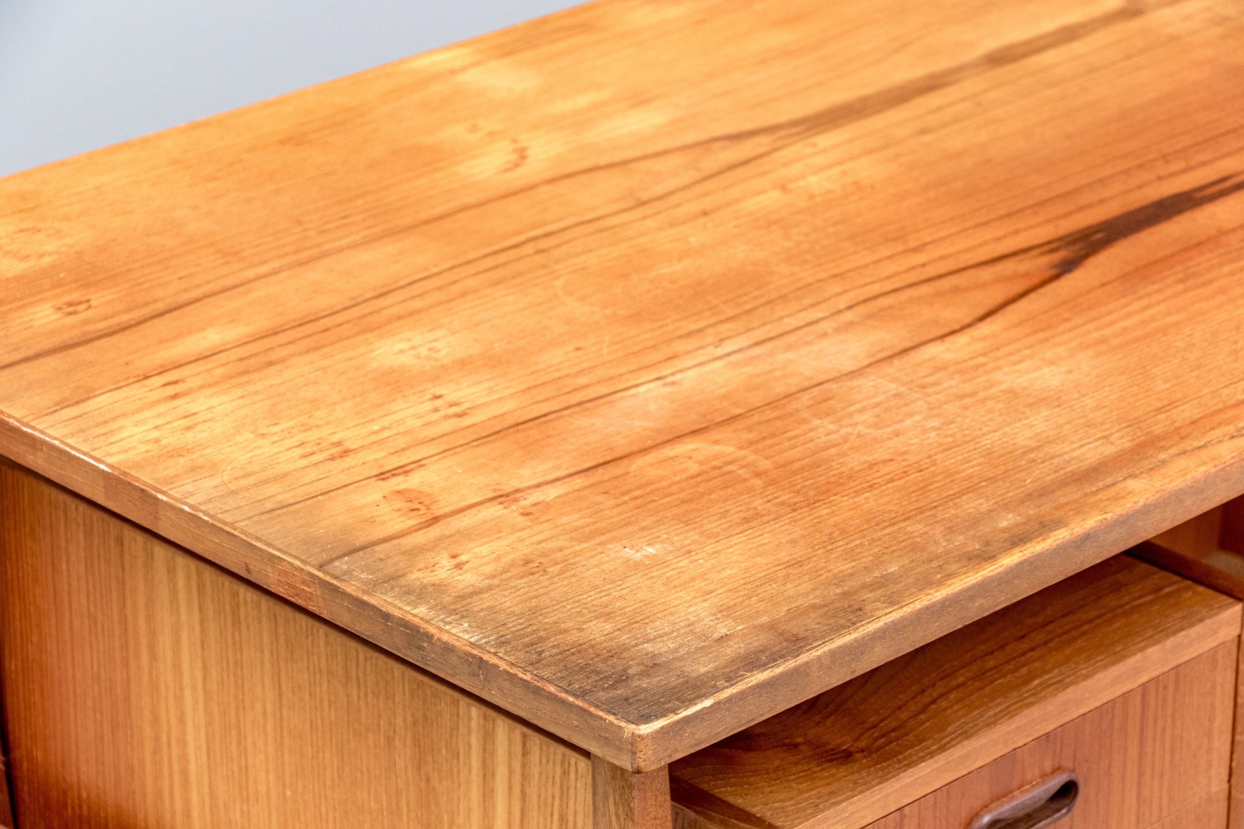 A stylish vintage Danish desk well crafted in orange-brown teak, standing on four square tapered form legs with table top above. Below the table top is fitted with two bays of three drawers. The top drawer on each bay of drawers with brass key escutcheon. Key included.
