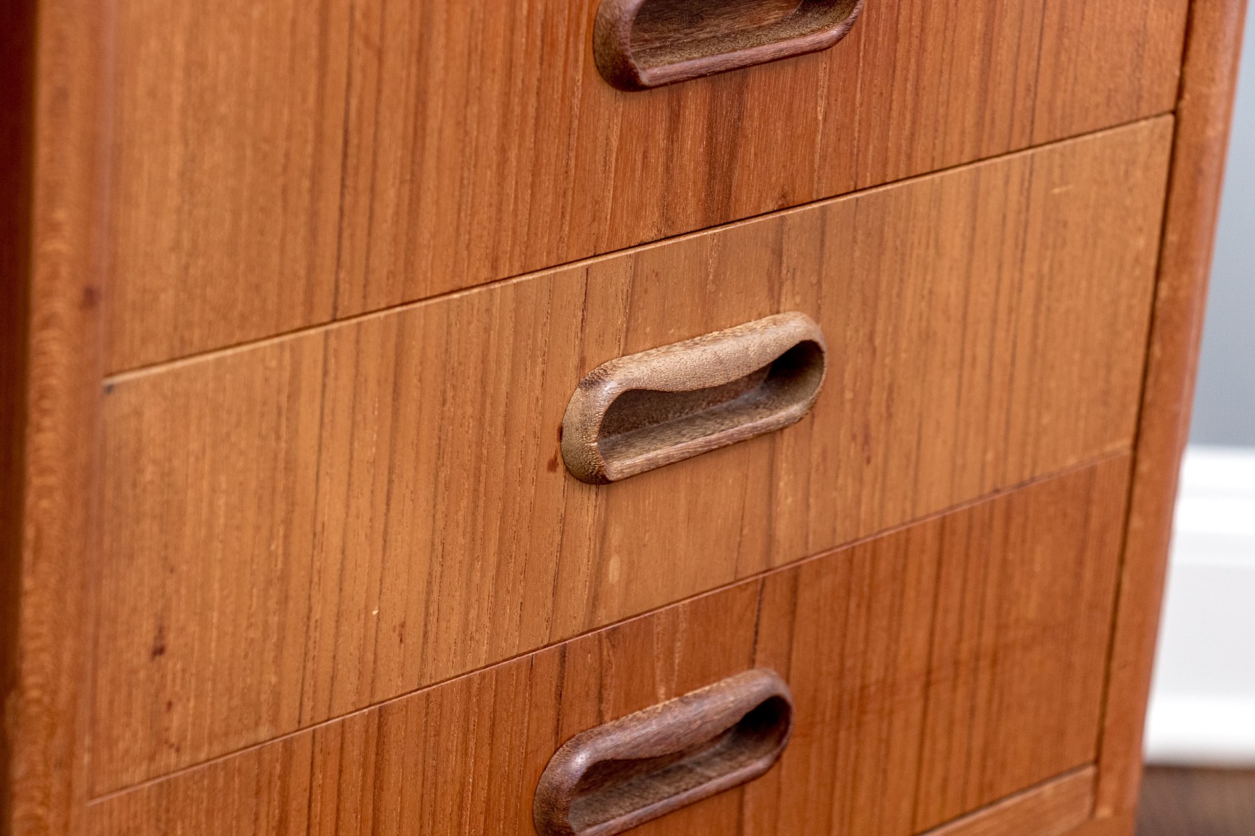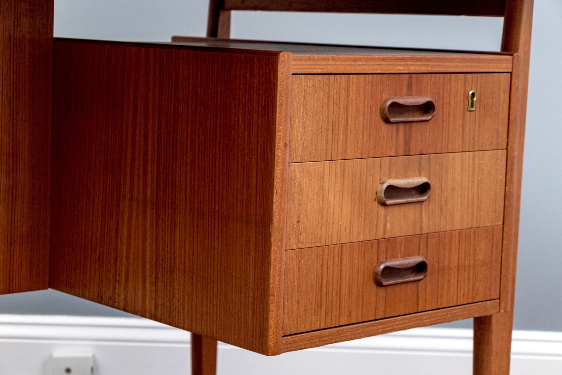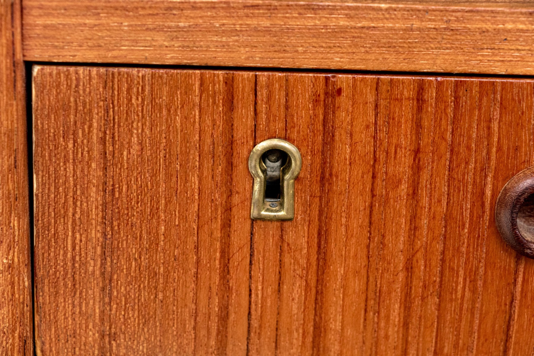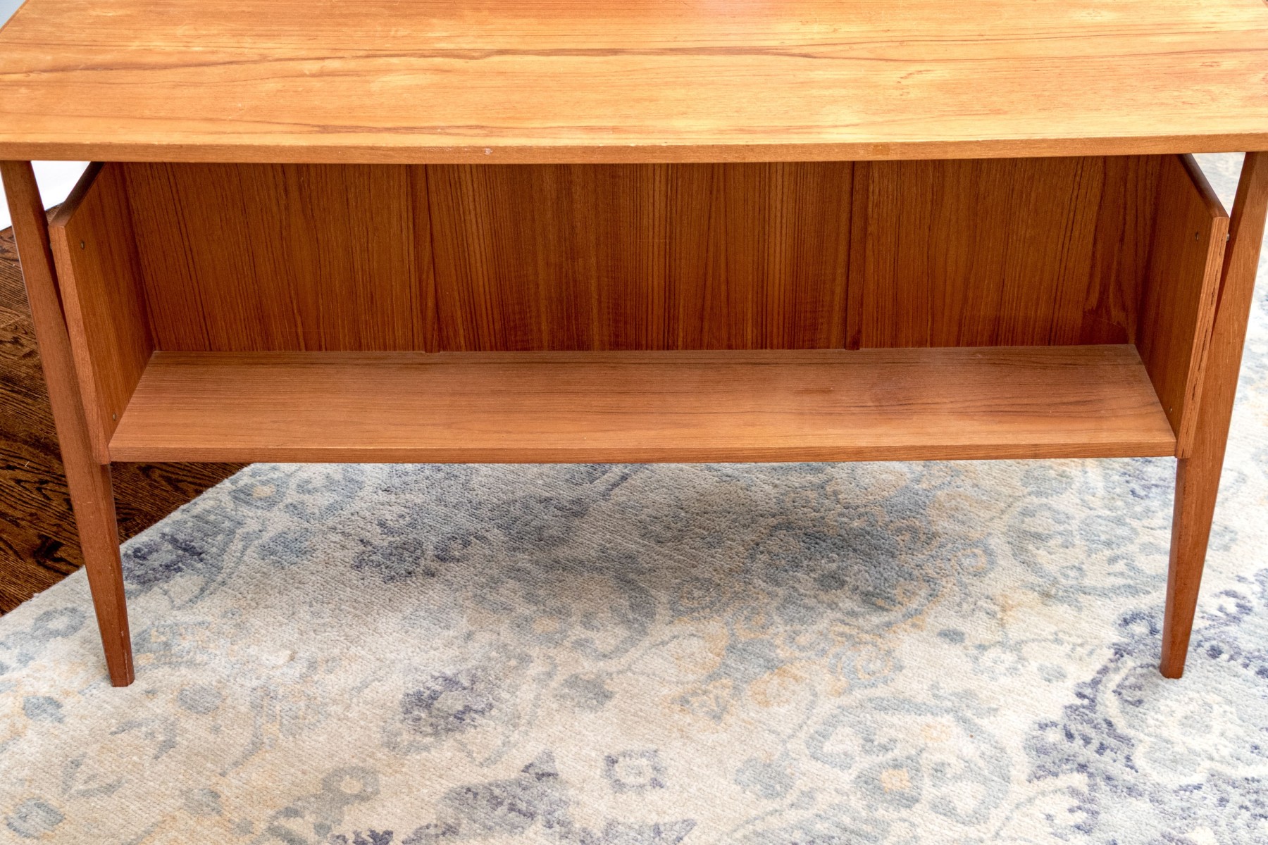 A stylish vintage Danish desk well crafted in orange-brown teak, standing on four square tapered form legs with table top above. Below the table top is fitted with two bays of three drawers. The top drawer on each bay of drawers with brass key escutcheon. Key included.