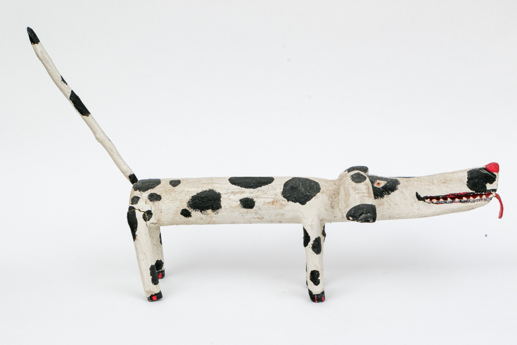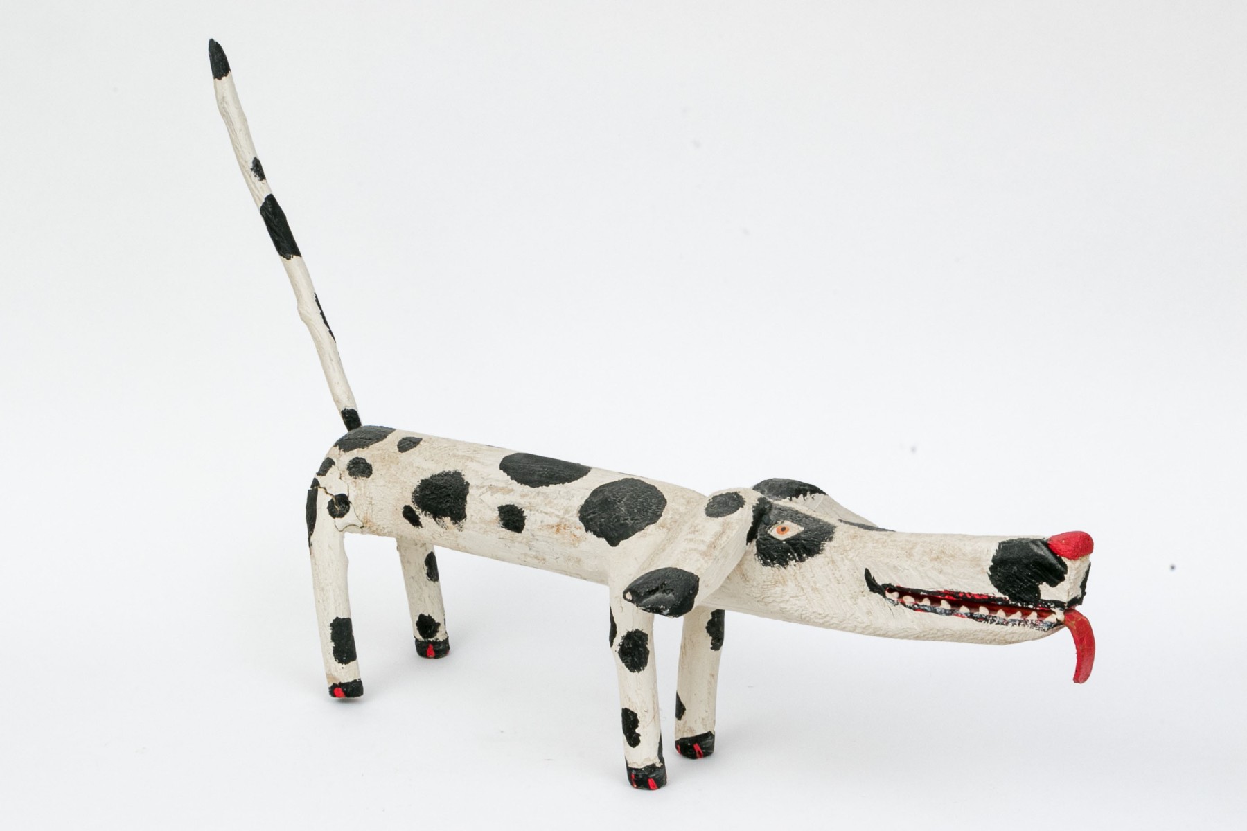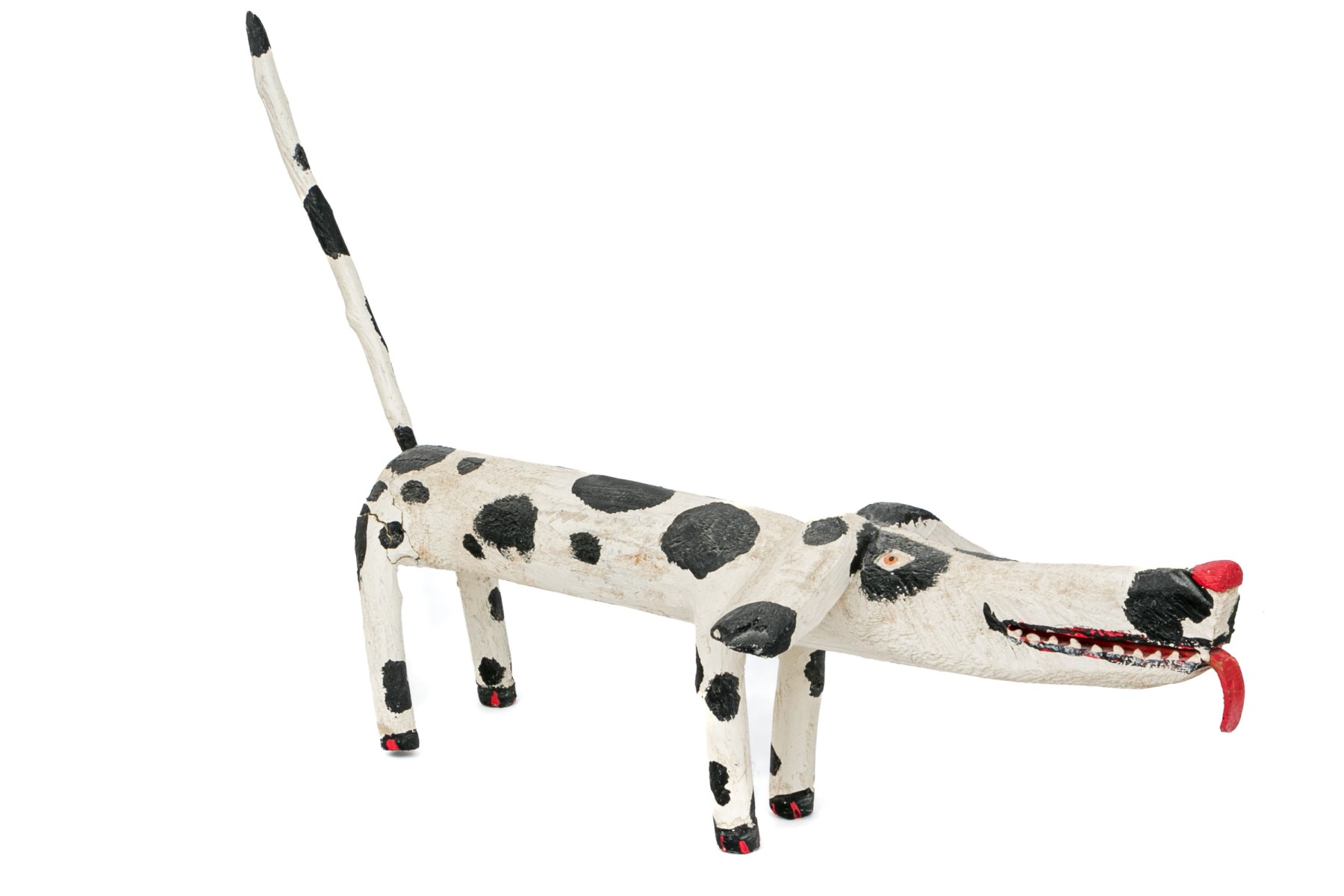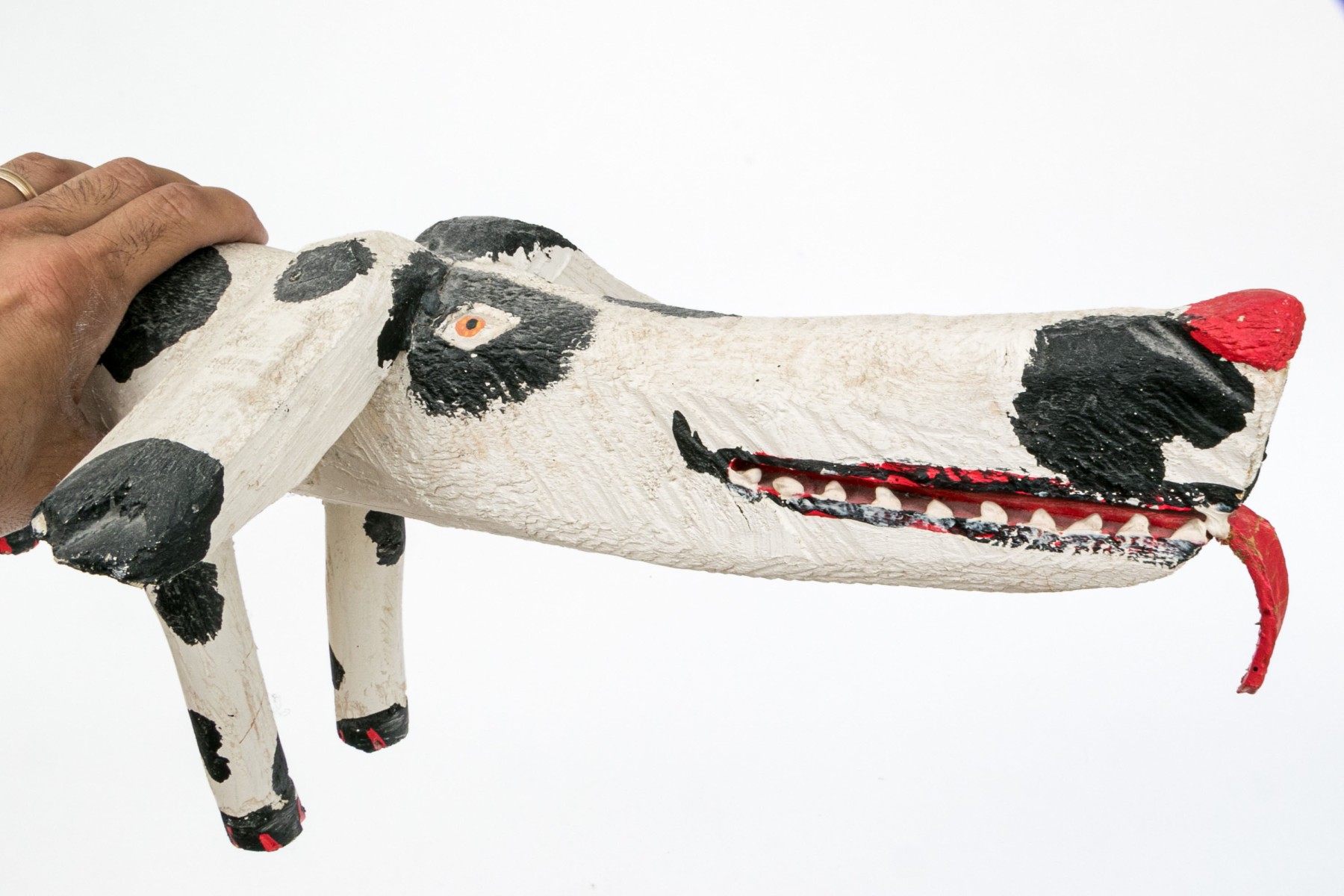 A folk style carved and paint finished wooden dog by artist Miguel Rodriguez depicting a dog, standing on four legs with an extended tail.