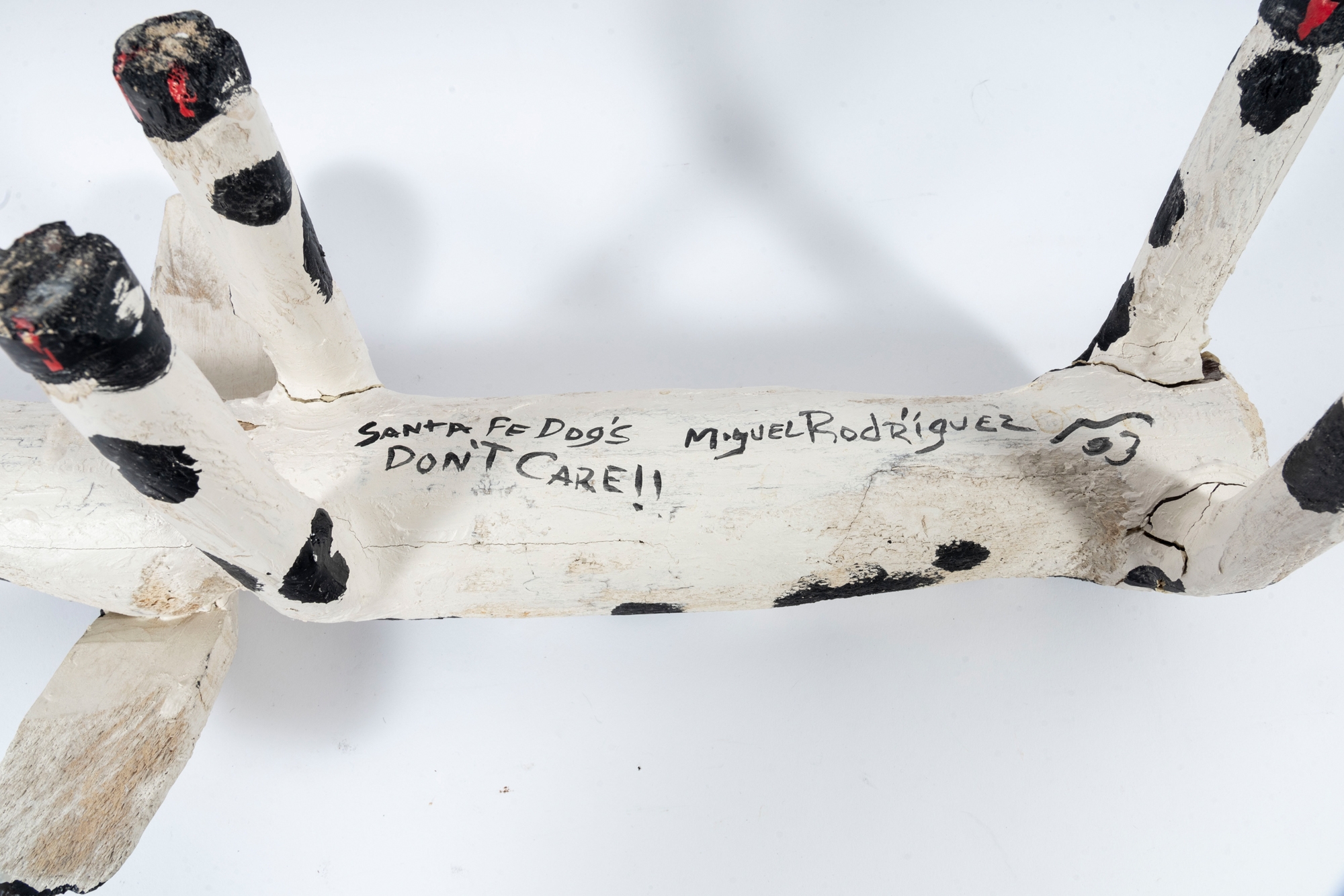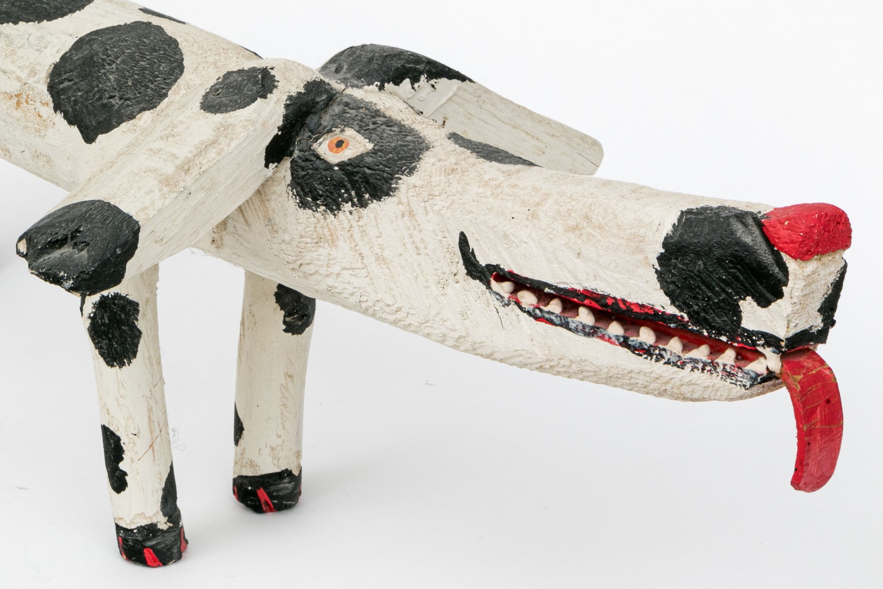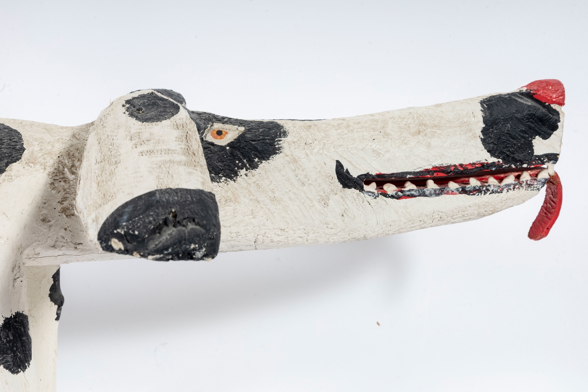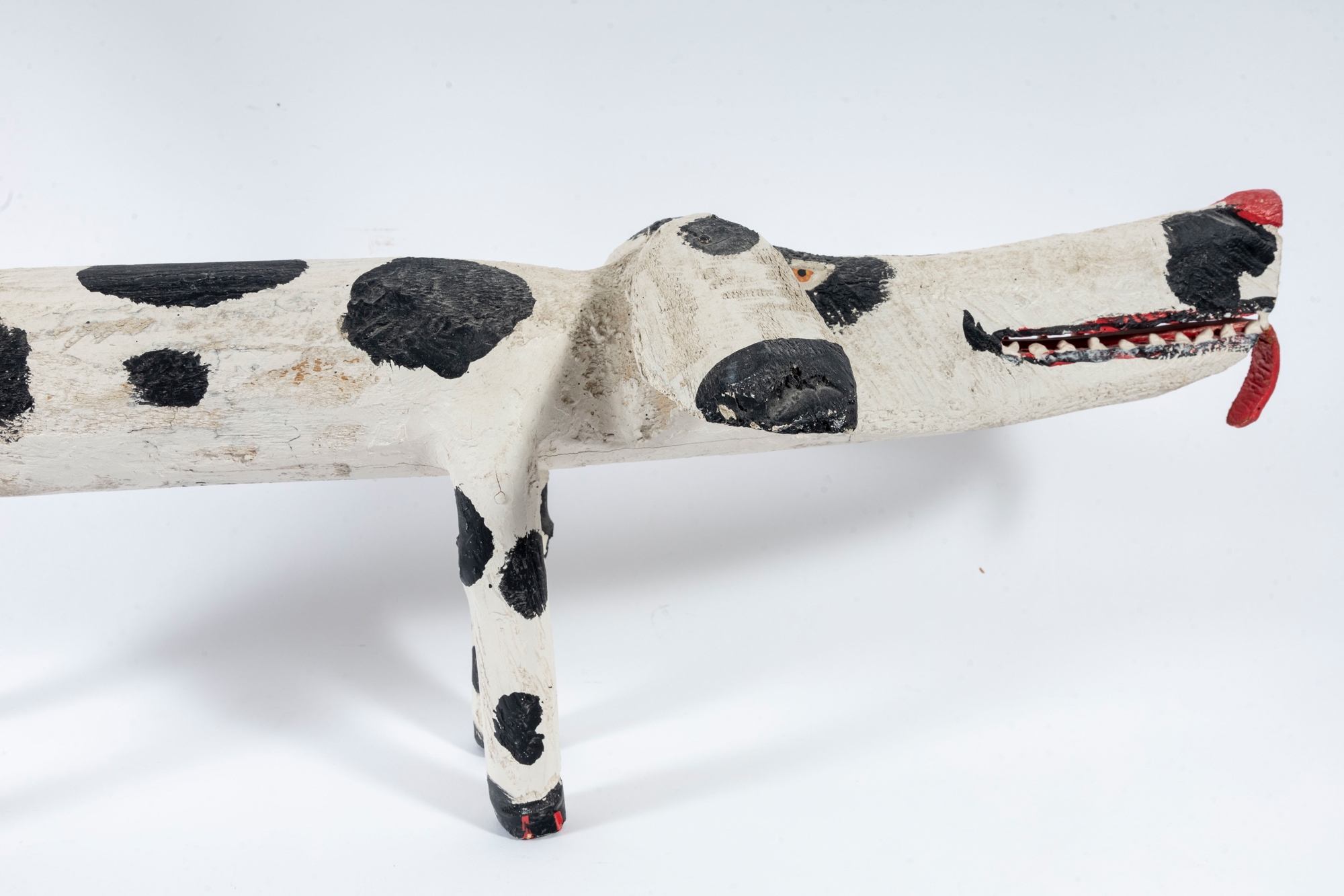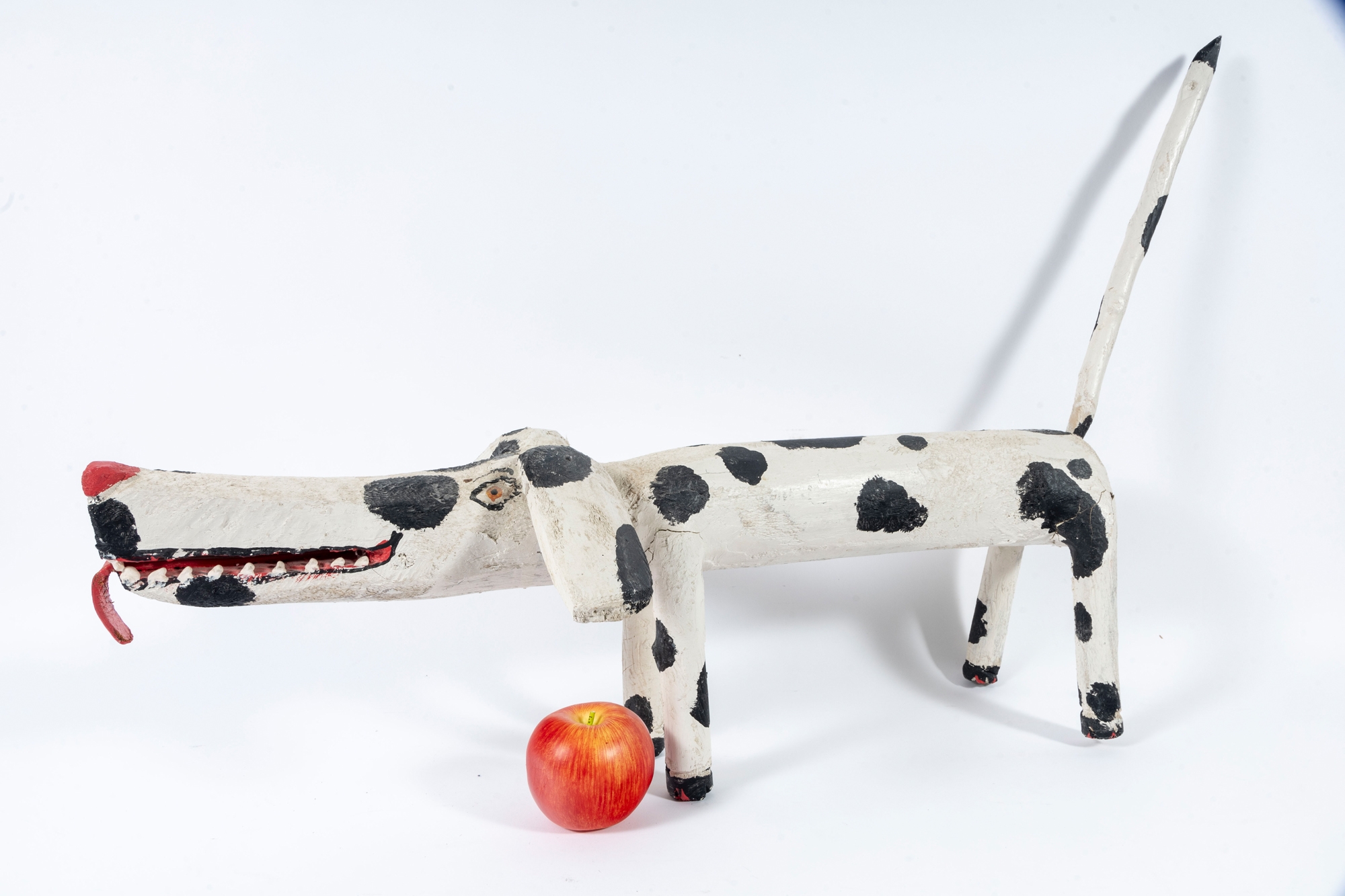 A folk style carved and paint finished wooden dog by artist Miguel Rodriguez depicting a dog, standing on four legs with an extended tail.