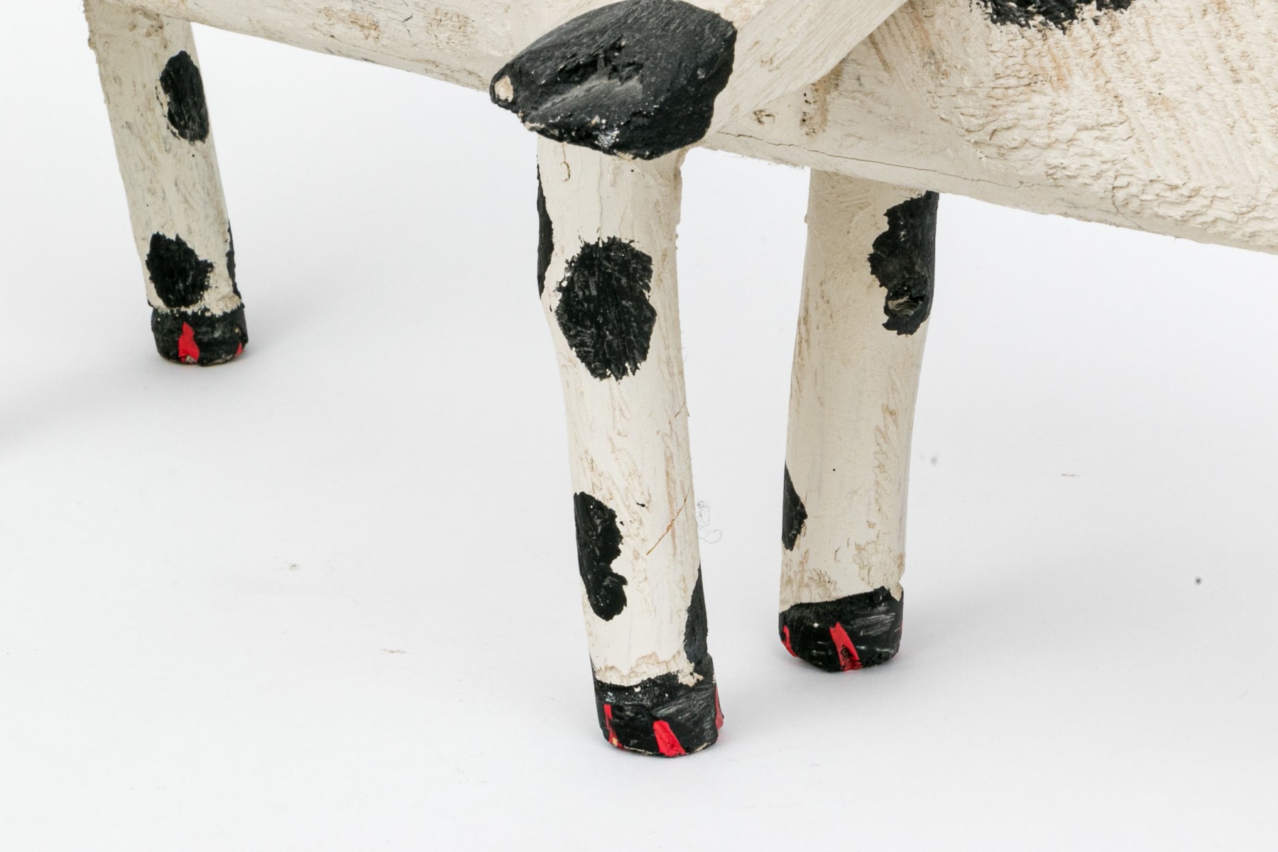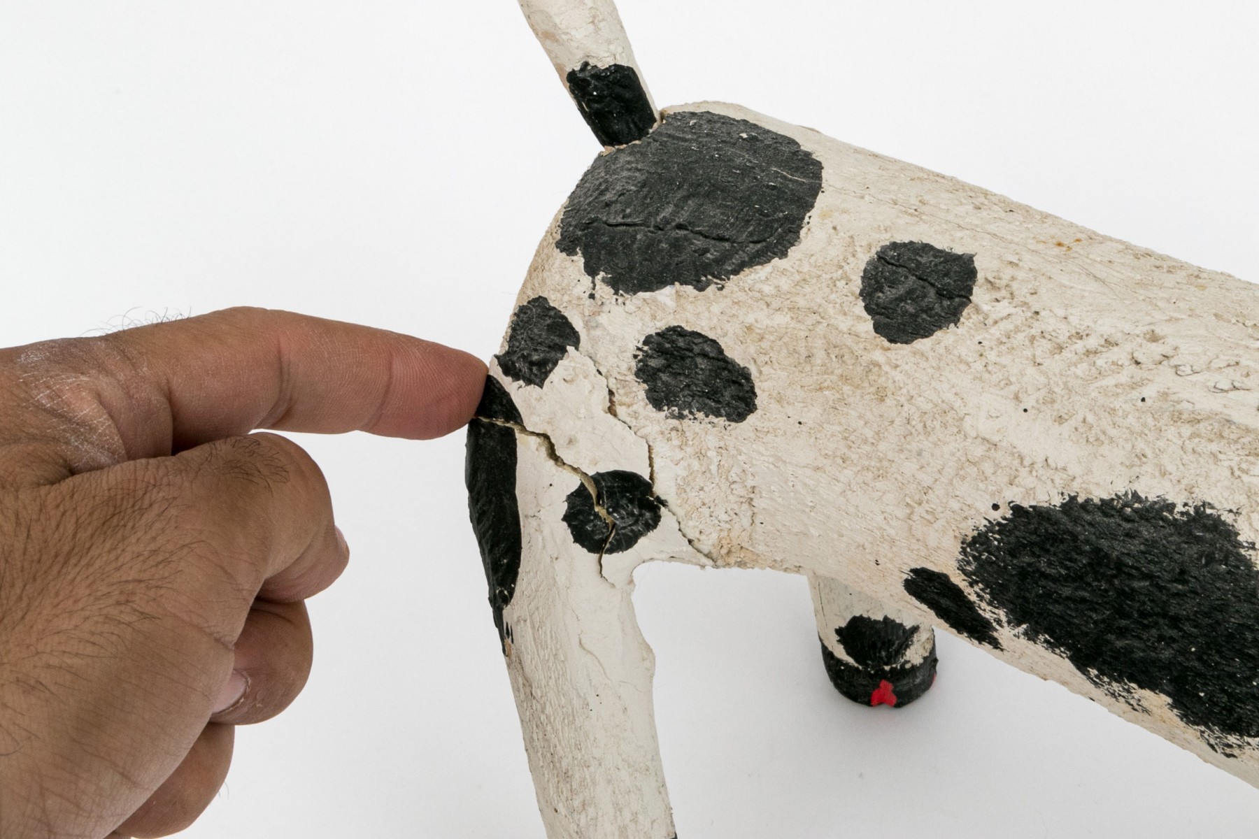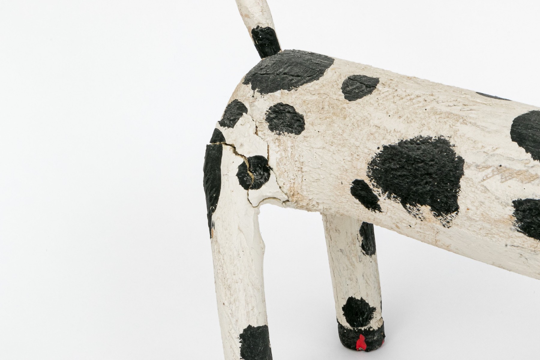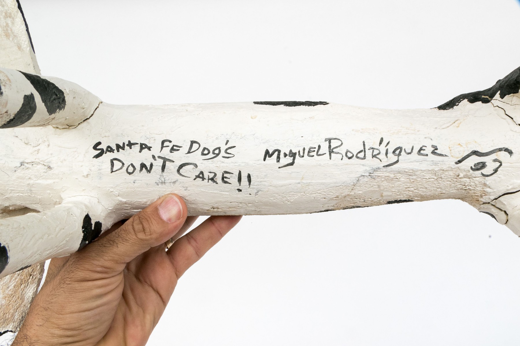 A folk style carved and paint finished wooden dog by artist Miguel Rodriguez depicting a dog, standing on four legs with an extended tail.