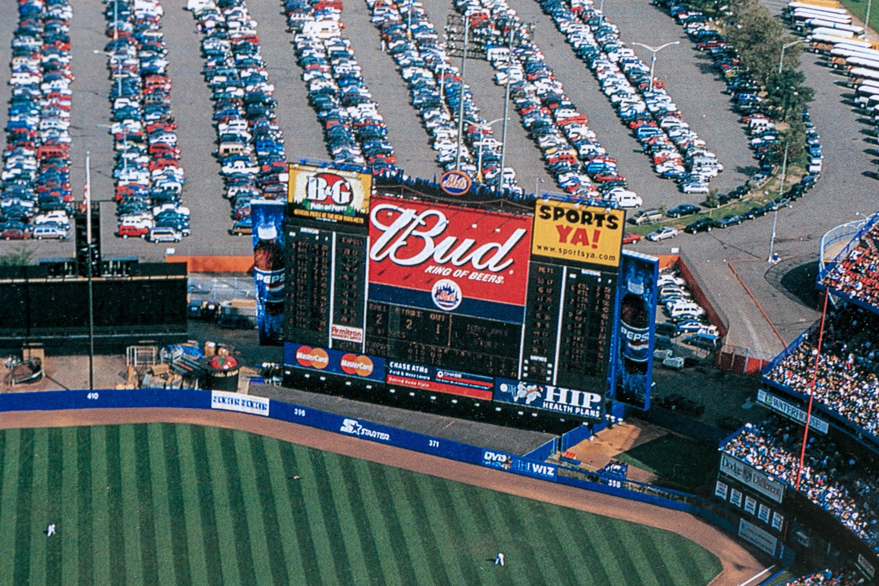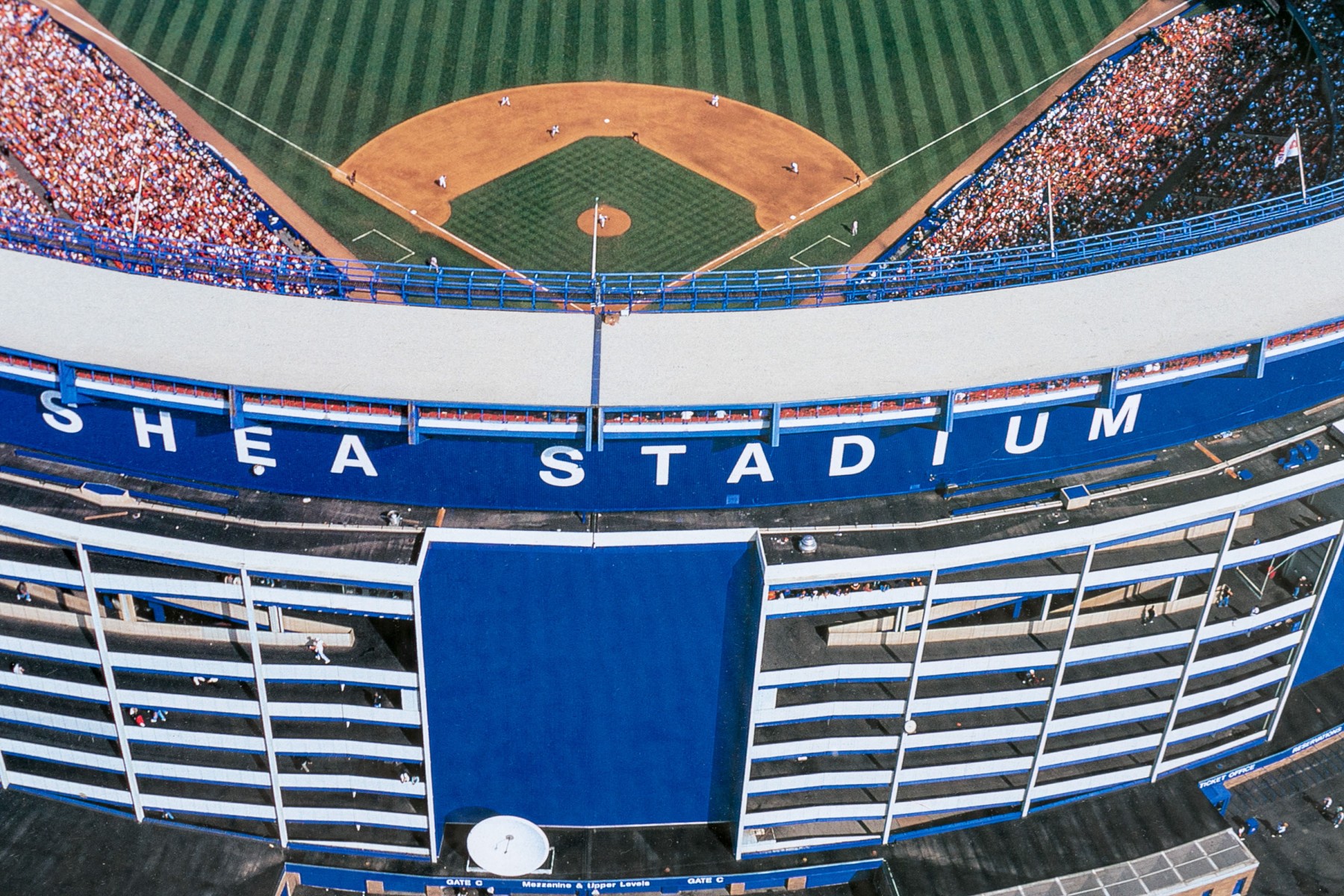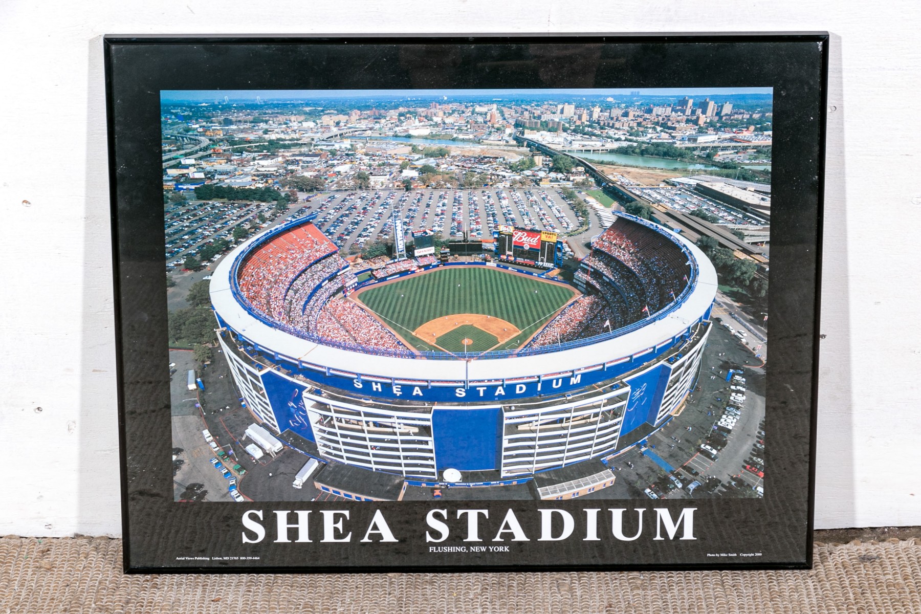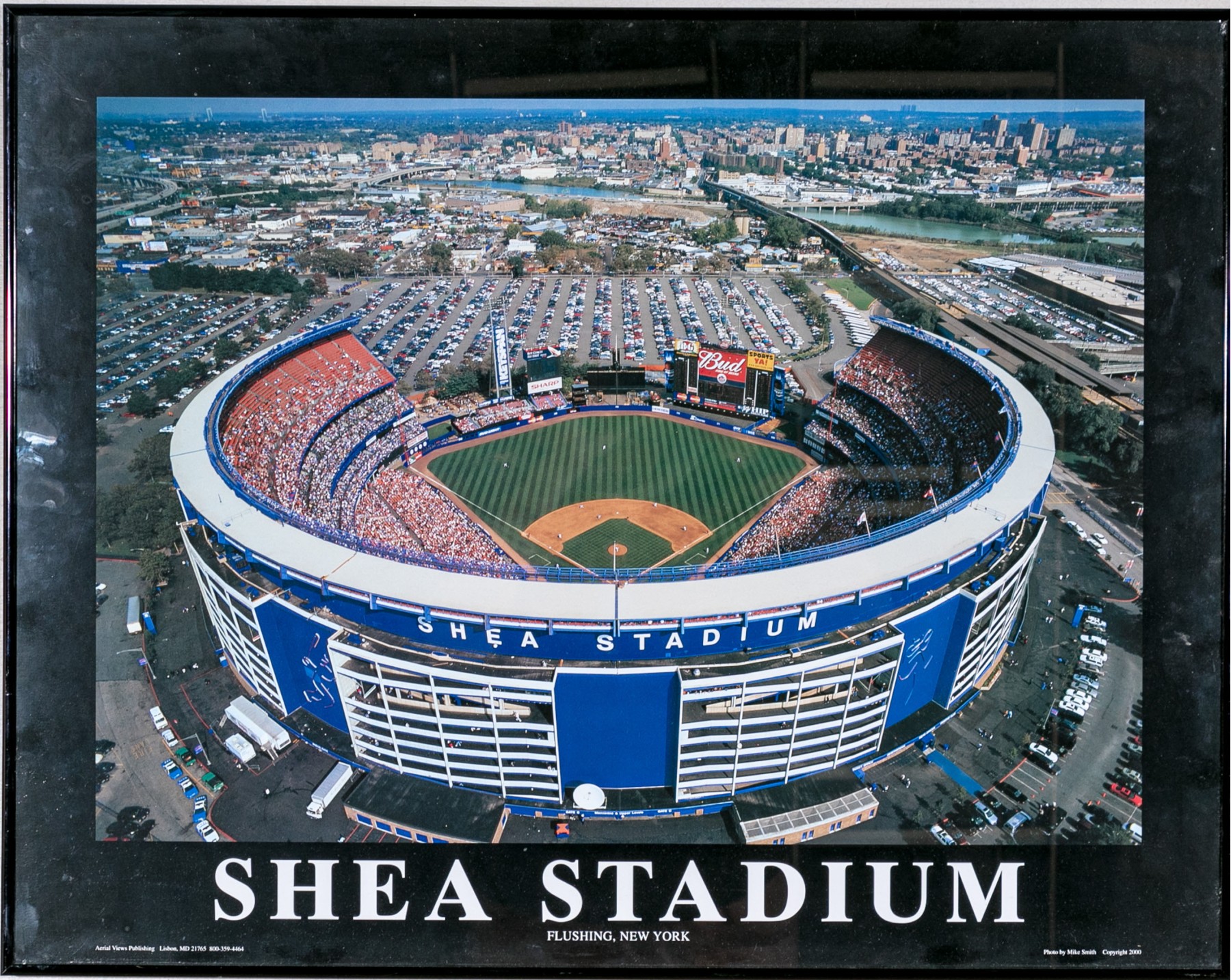 An aerial image taken on October 1, 2000 of the former Shea Stadium, the long time home of the Mets baseball team. It was dismantled in 2009. Presented in a black frame with glass.