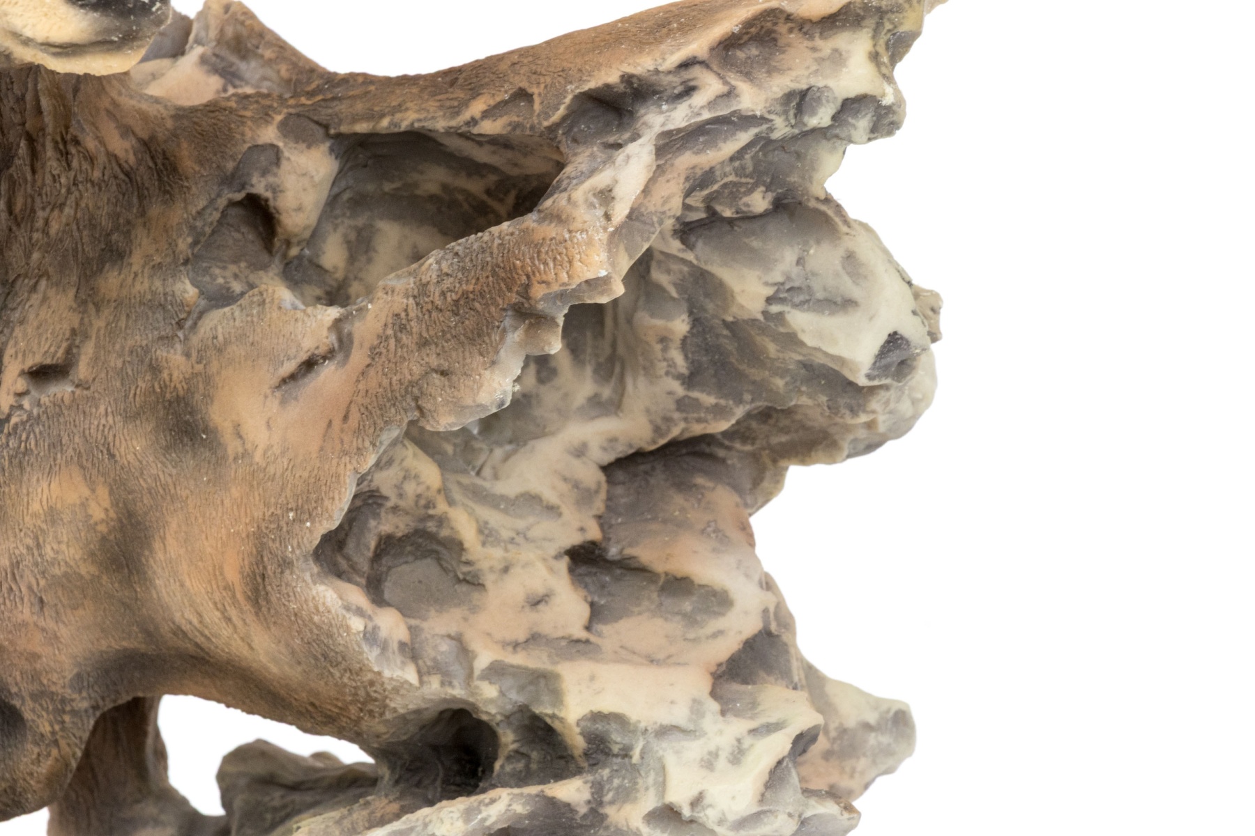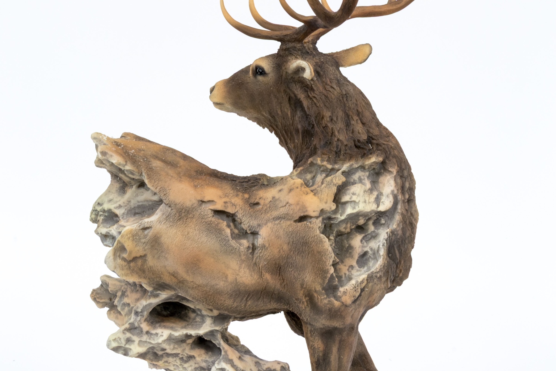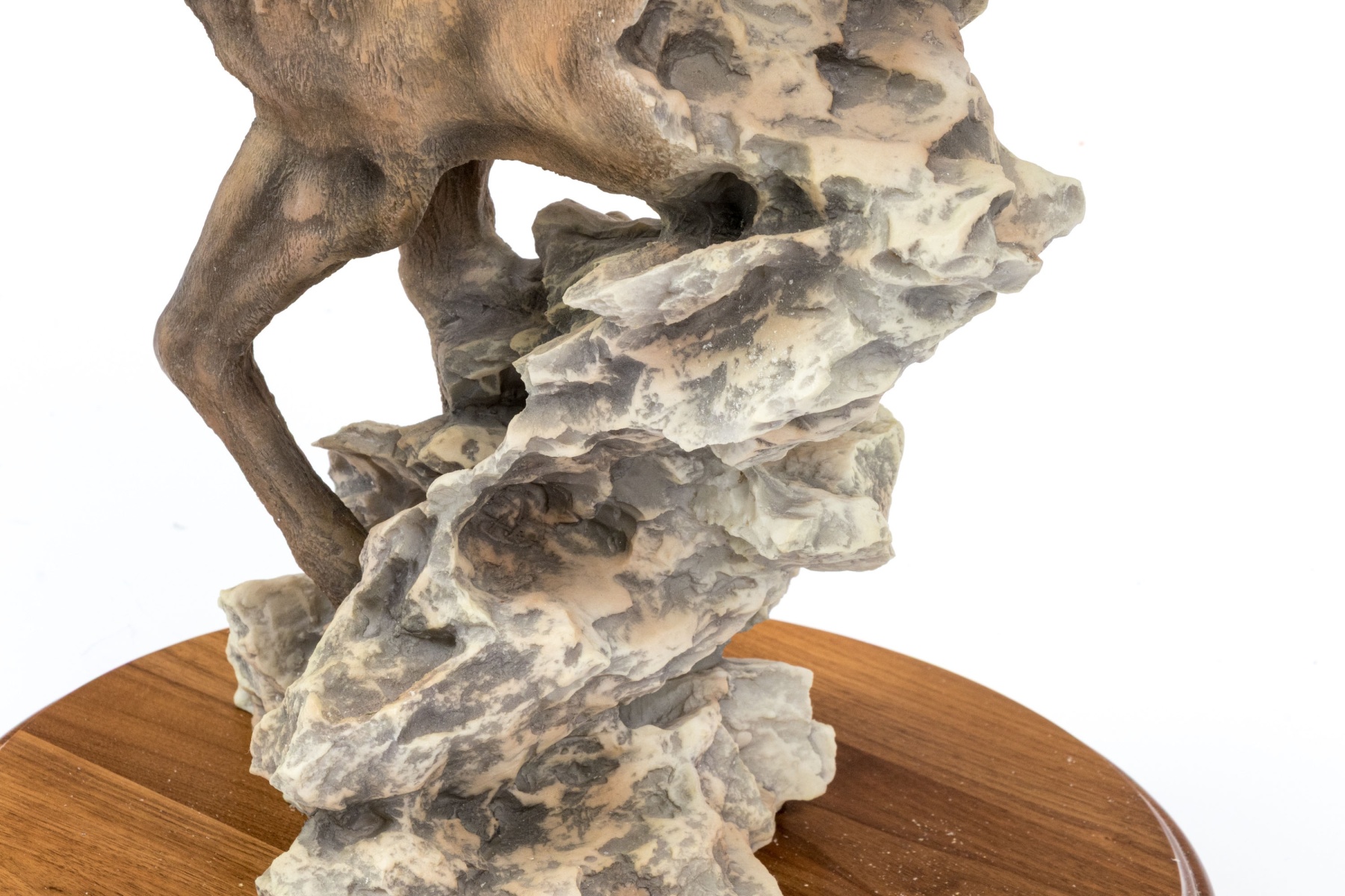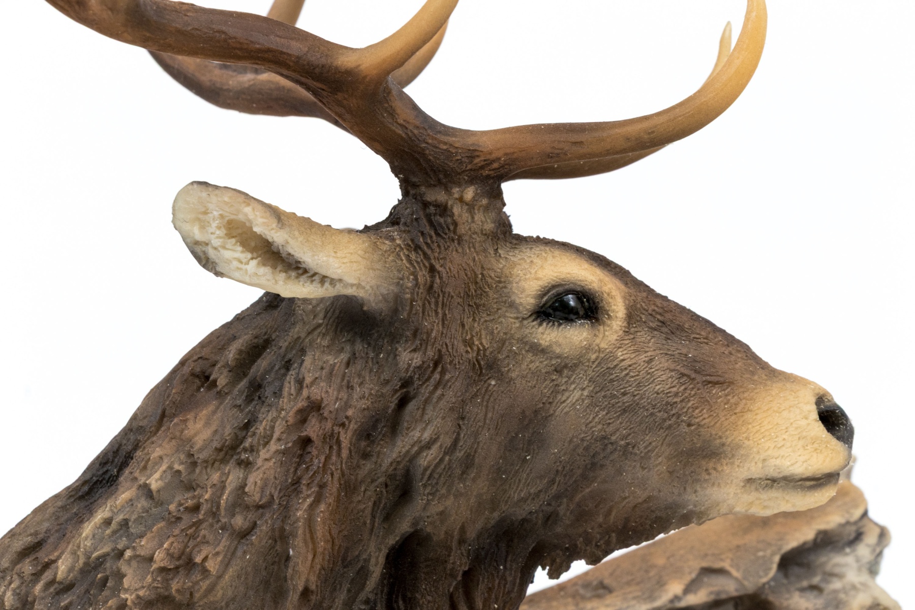 A gorgeous Mill Creek Studios "The Challenge" sculpture of an elk rendered in high, naturalistic detail depicting a stag with impressive pointed horns looking back over its shoulder, its body graduated into an abstracted craggy outcrop mounted to a circular wood base. Bearing a title plaque on the base numbered 2753/4000 and signed underneath.