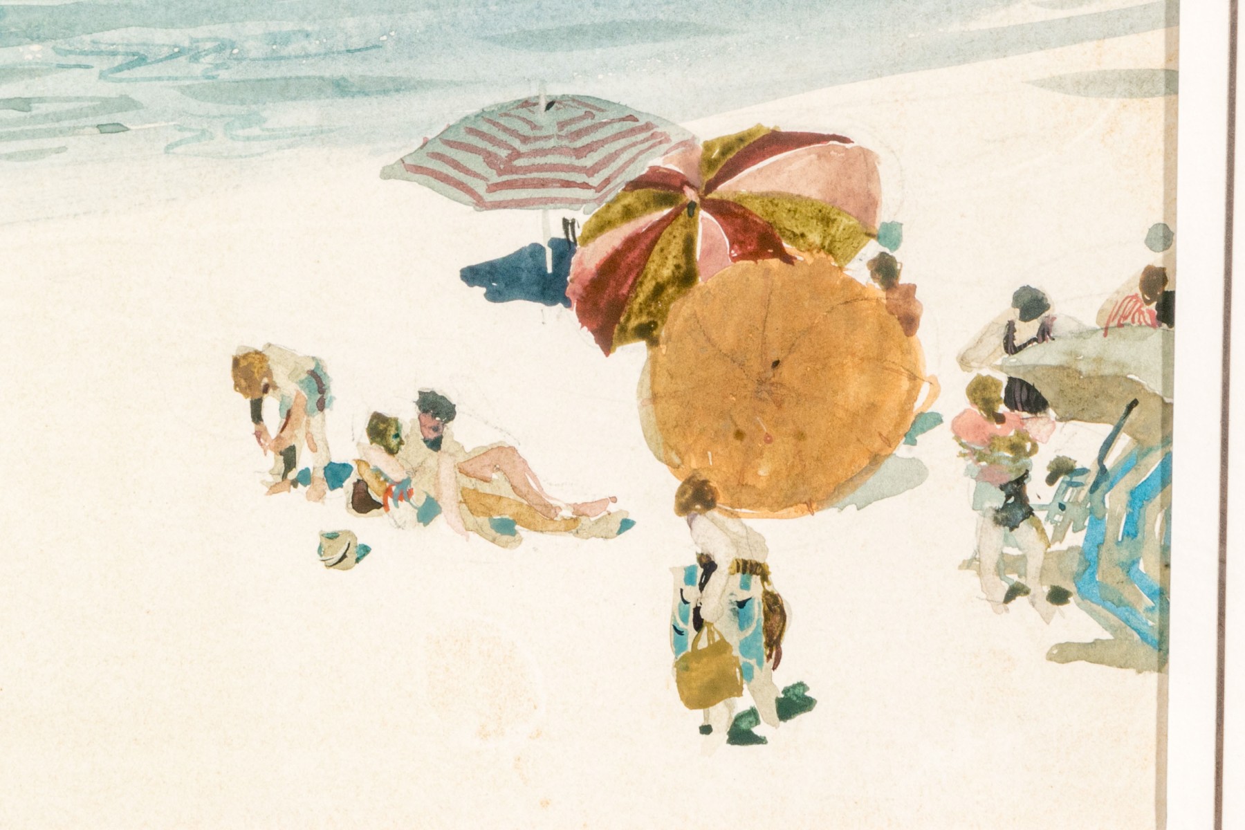 Depicting a beach and the sea, with sun bathers umbrellas and children playing on the sand in the foreground with turbulent ocean in the distance.