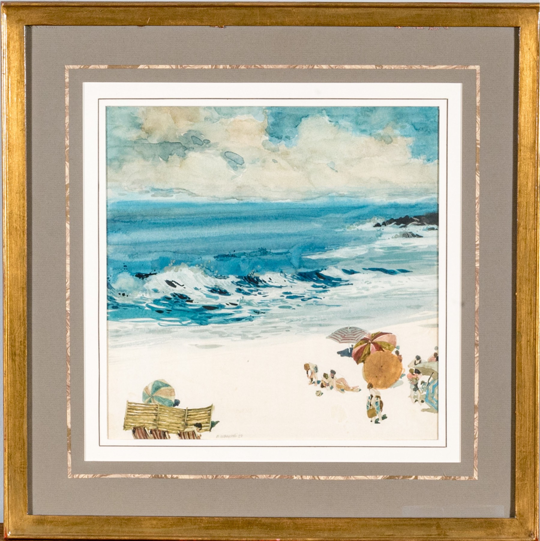 Presented handsomely matted with a thin marbled band within a gilt wood frame and glazed.