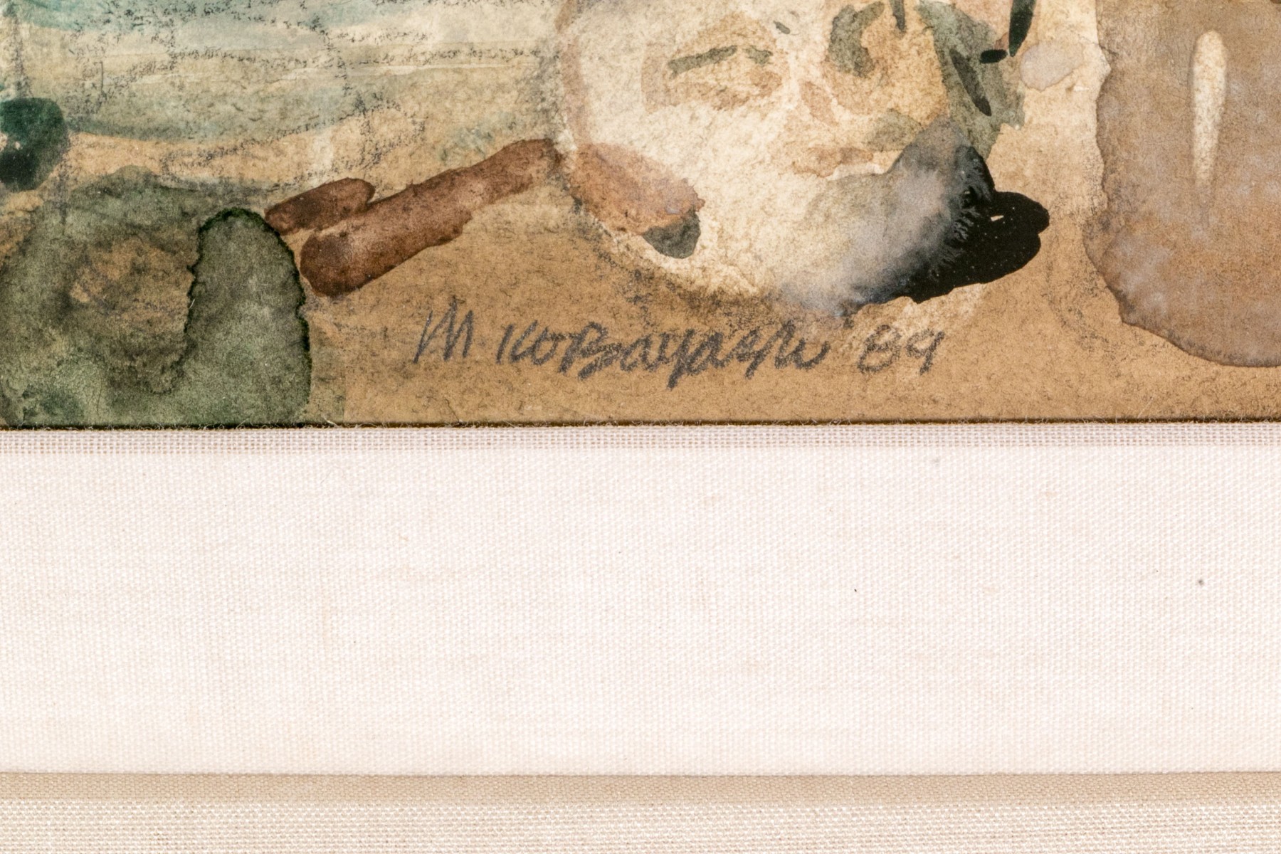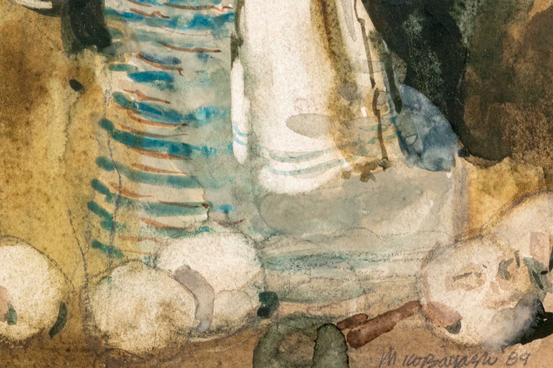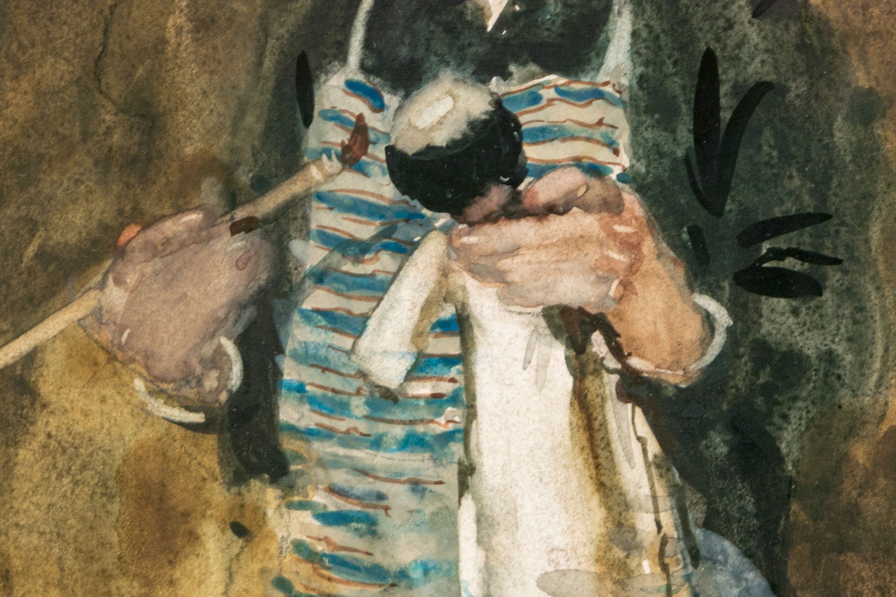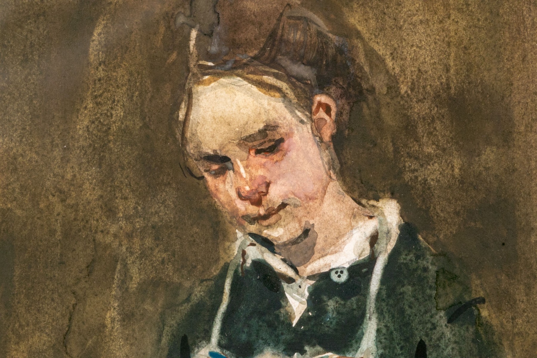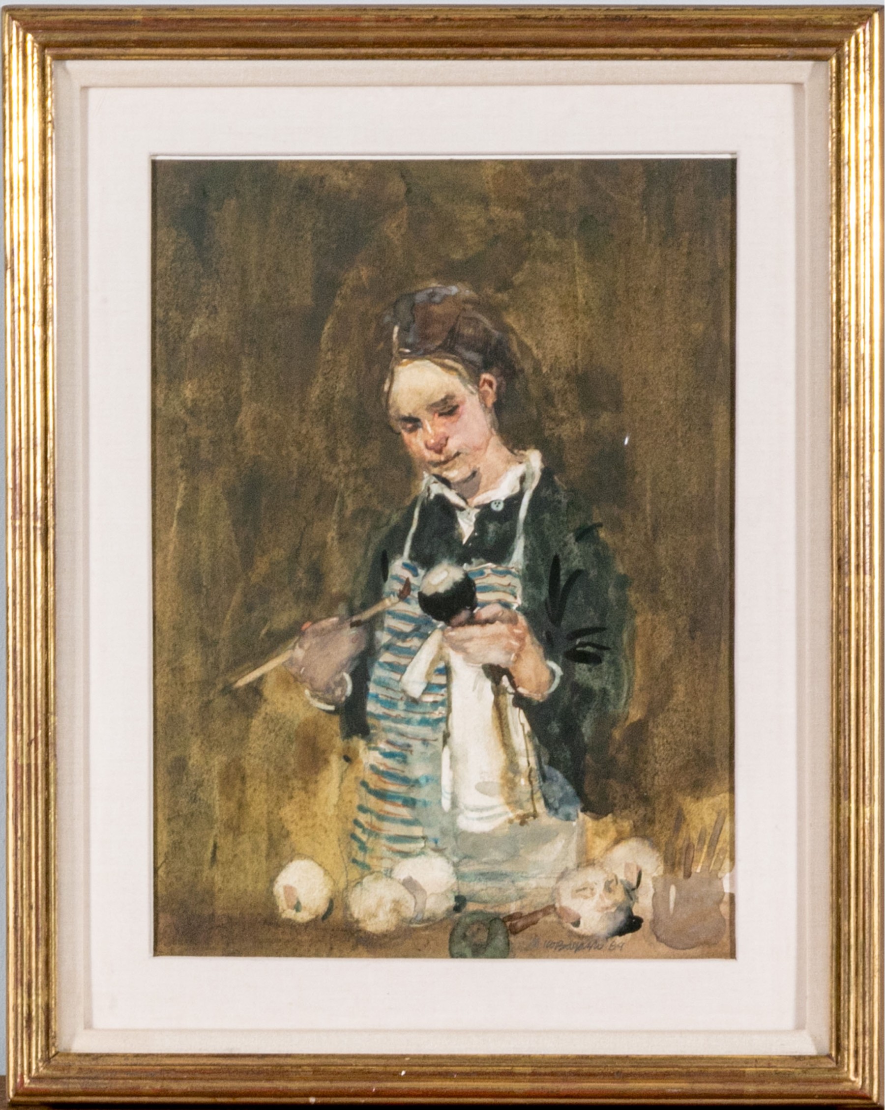 The current watercolor on paper wonderuflly depicts a girl wearing a painters smock, depicted painting the head of a doll, with a group of unpainted heads laid on a table.