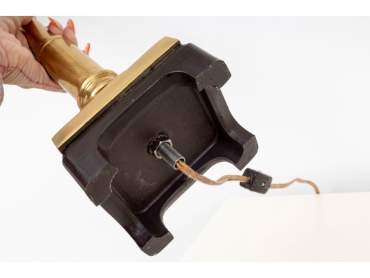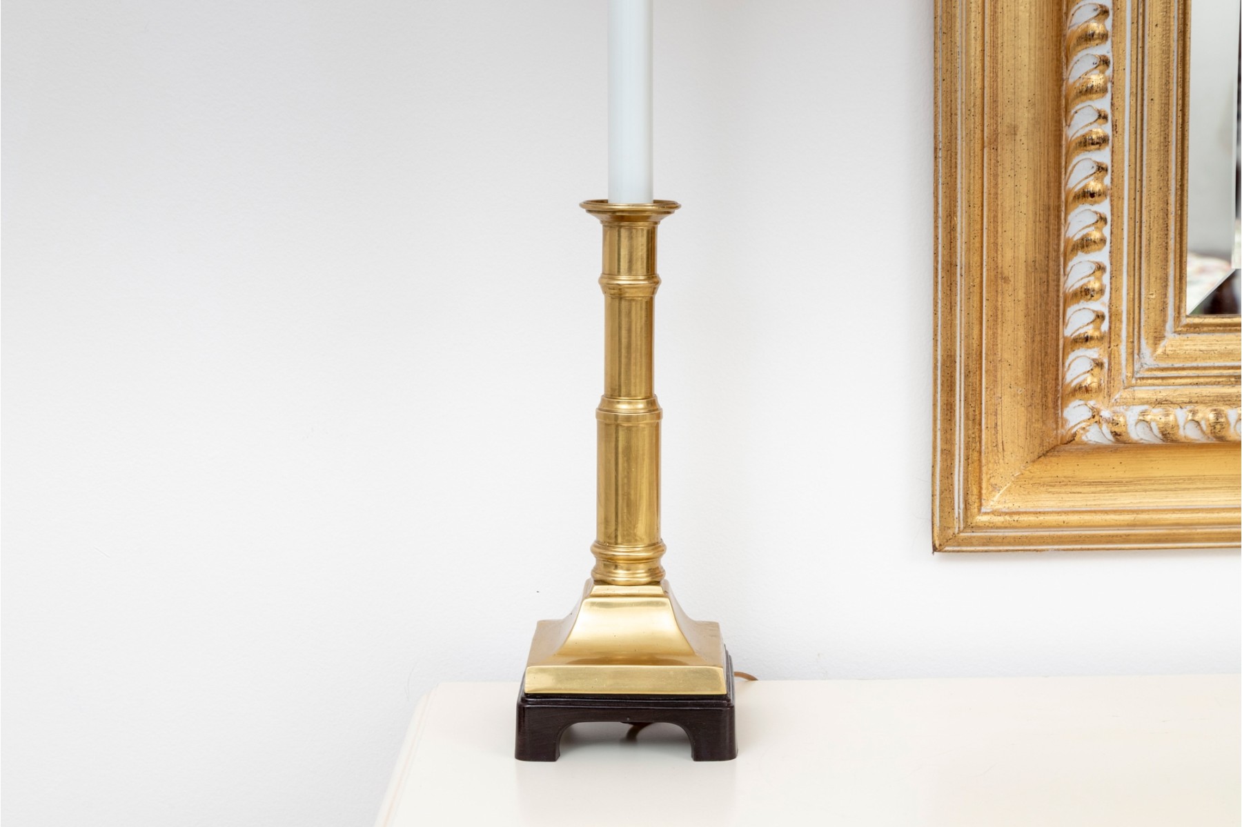 two matching table lamps -- classic faux candlestick and brass column form complimented by a wooden Ming-style base. Bulb clip shades included.