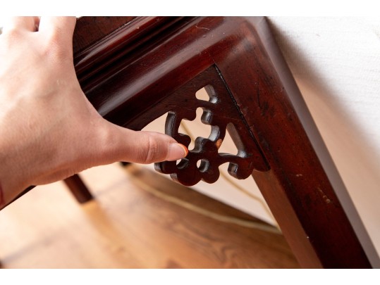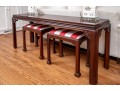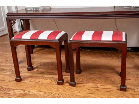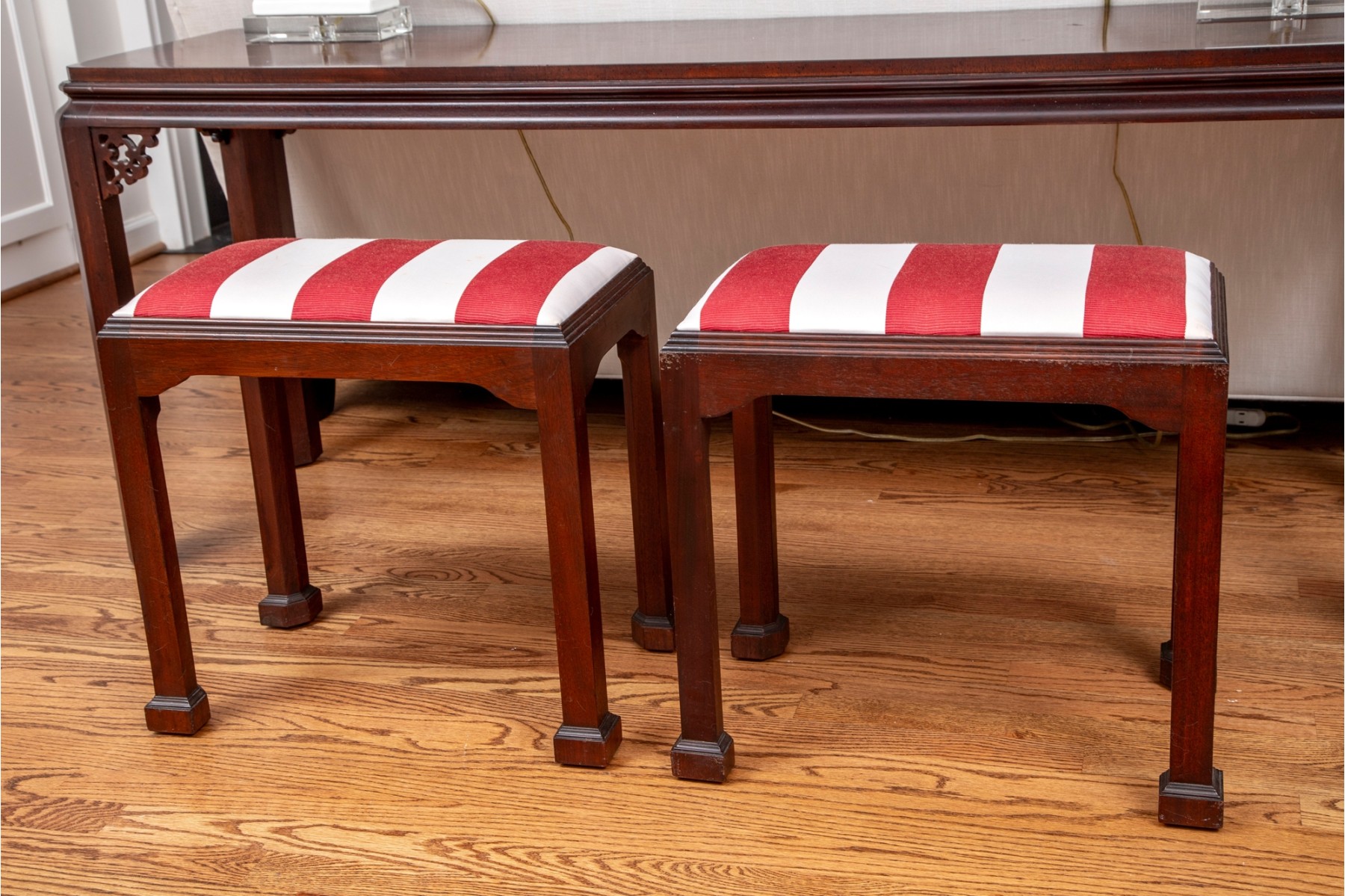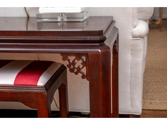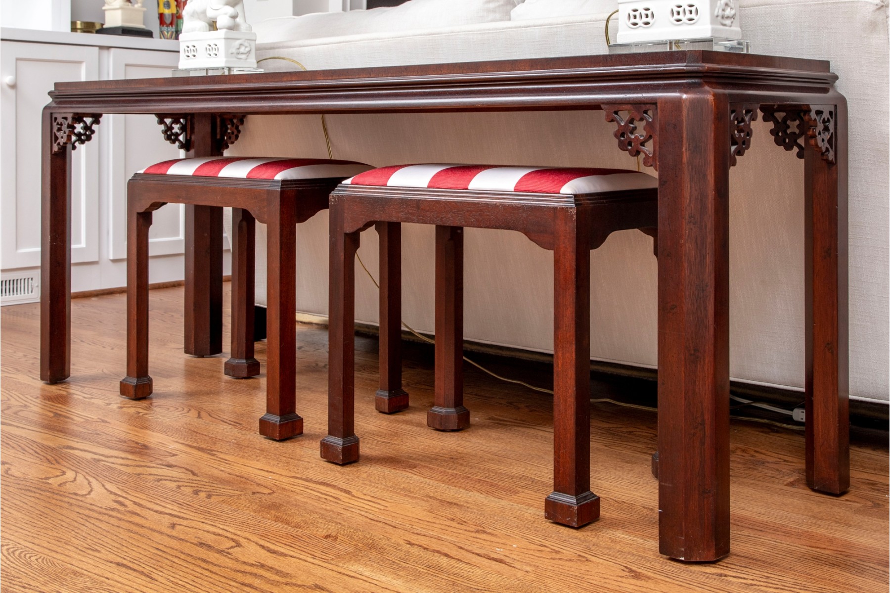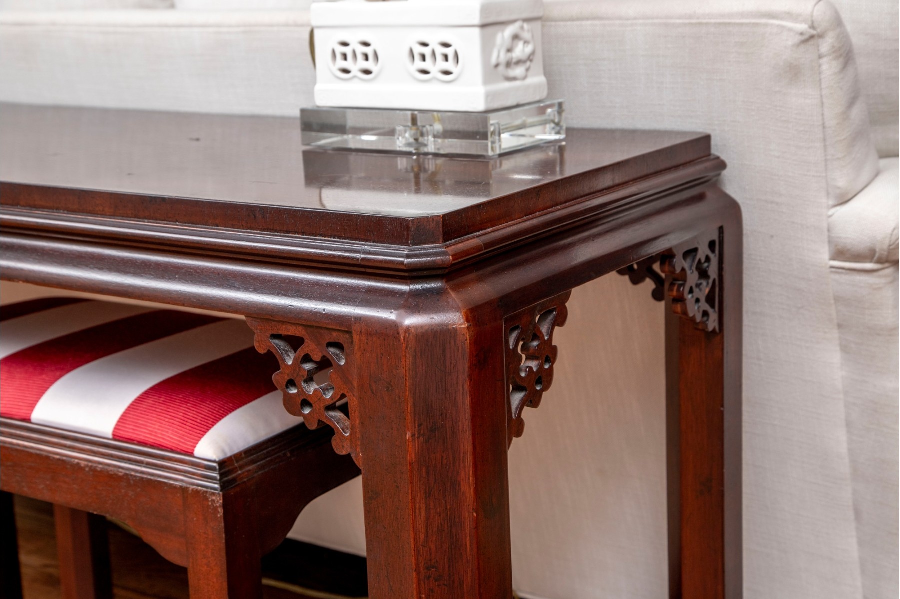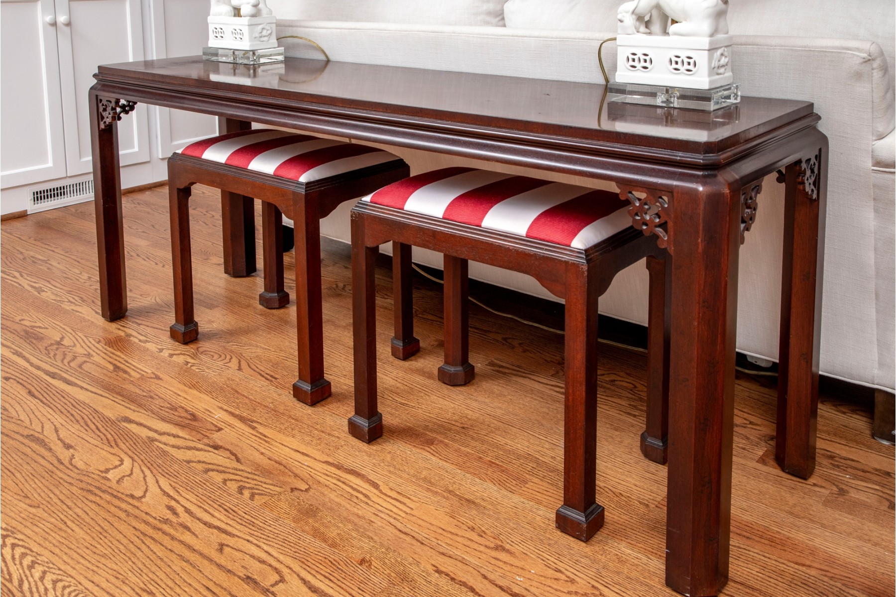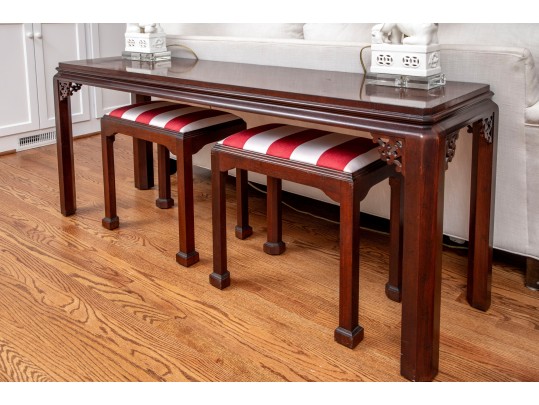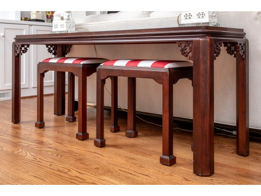 A beautiful ensemble of furniture composed of a mahogany -- a Ming-inspired console with decorative corner brackets/corbels. Provided are two matching upholstered bench seats which fit seamlessly under the console.