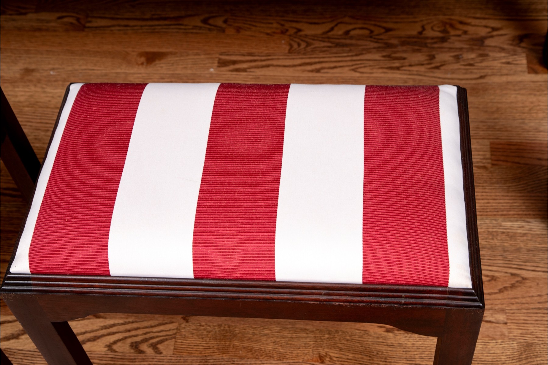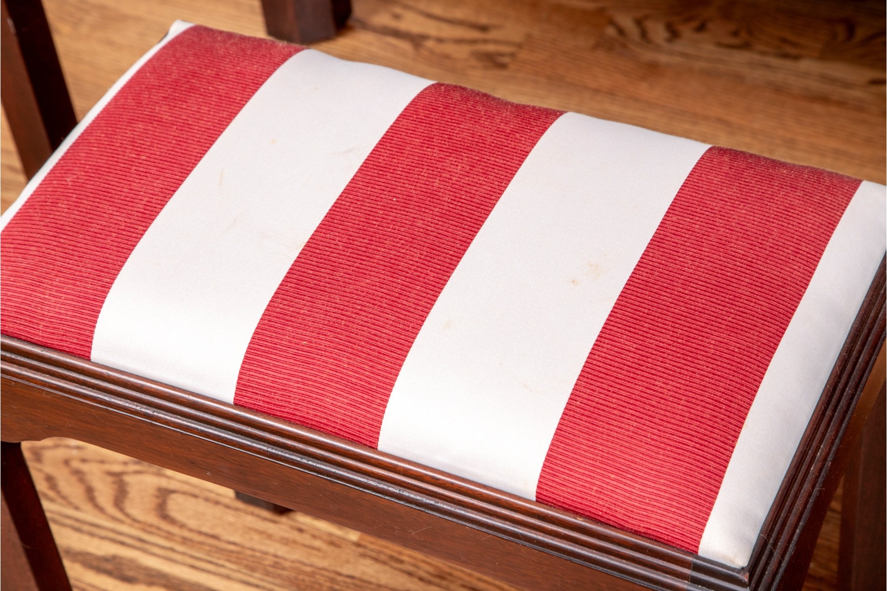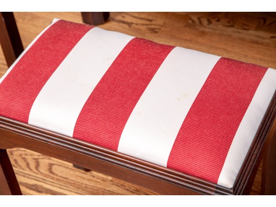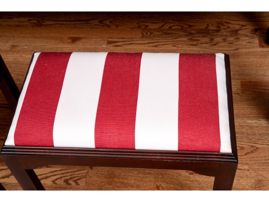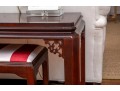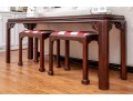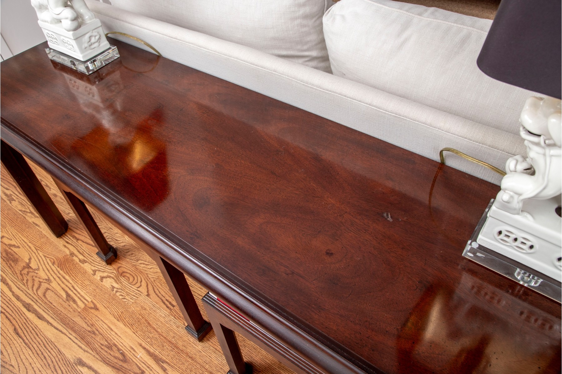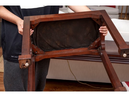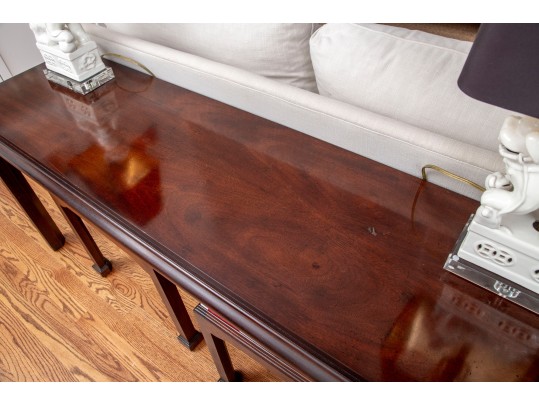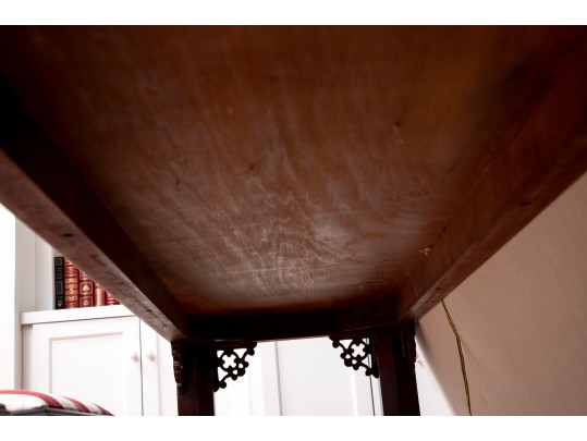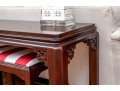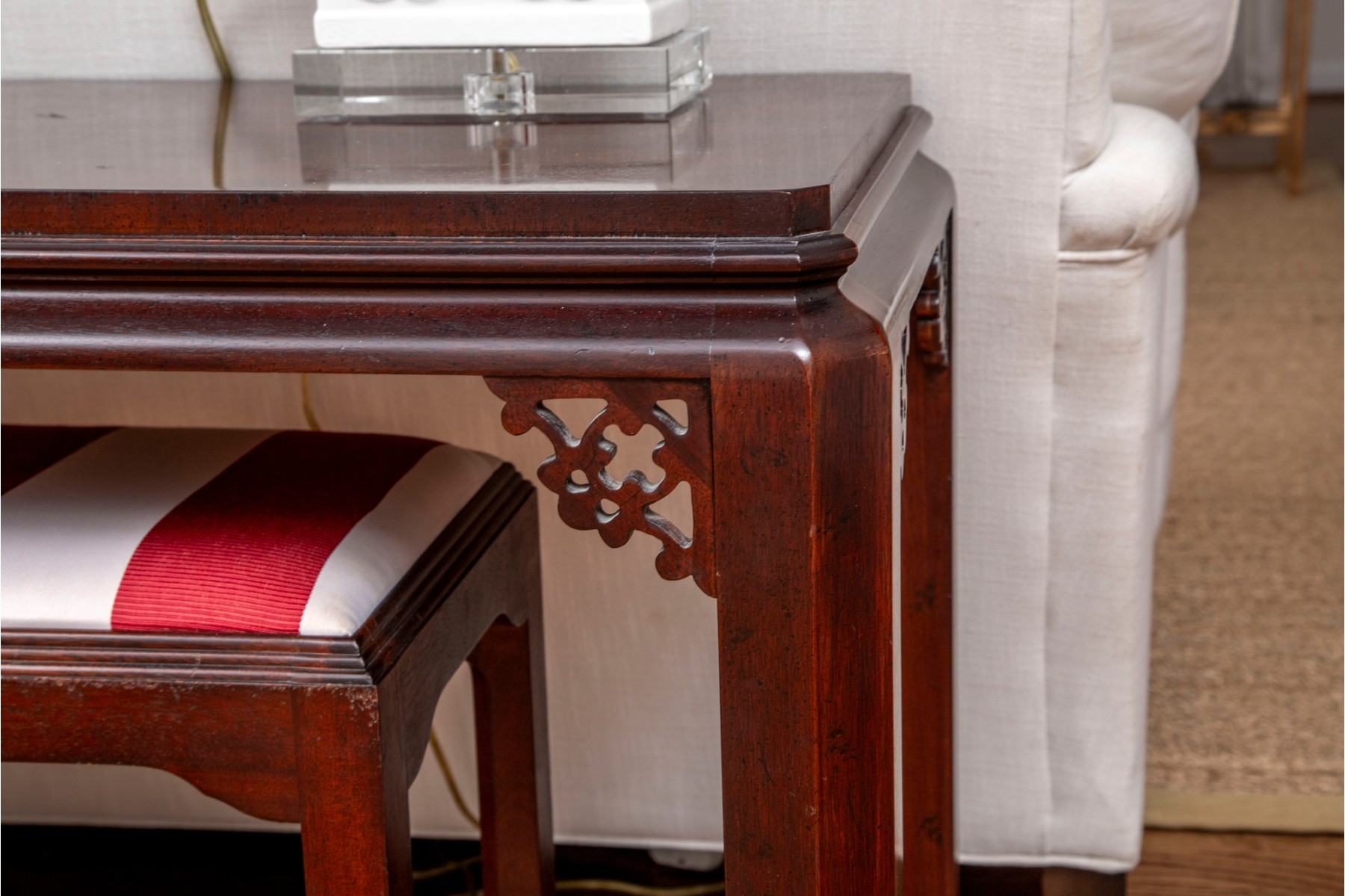 A beautiful ensemble of furniture composed of a mahogany -- a Ming-inspired console with decorative corner brackets/corbels. Provided are two matching upholstered bench seats which fit seamlessly under the console.