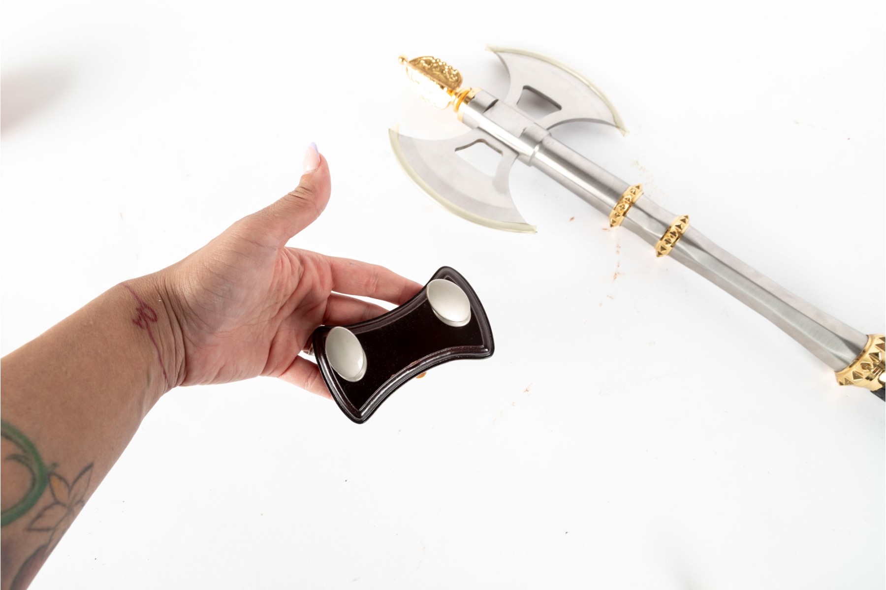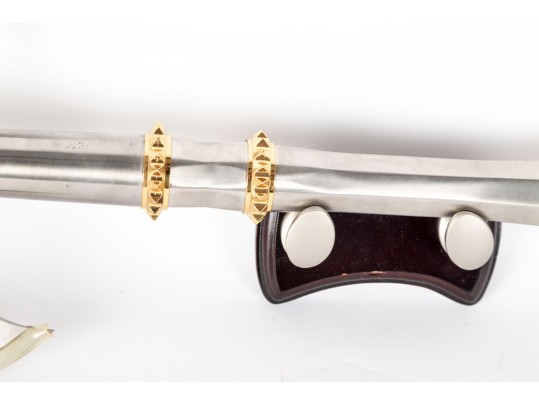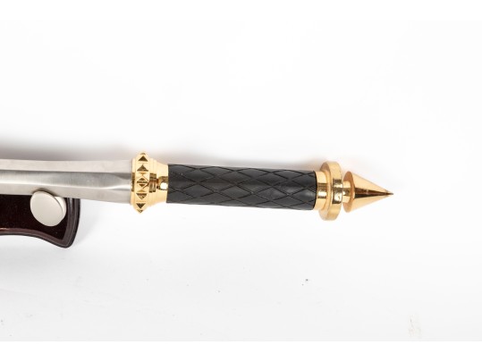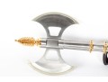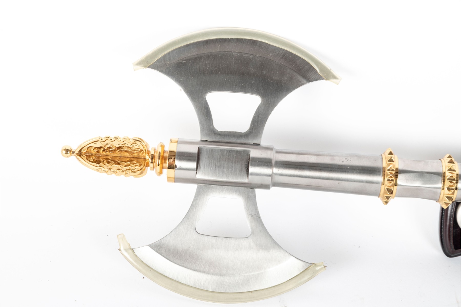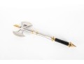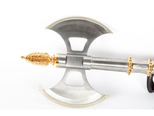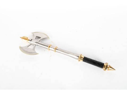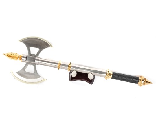 Crafted from 440 stainless steel, this one-handed battle axe reproduction is based on early Roman examples, complete with a contemporary two-tone finish. Warning; the blade is sharp. includes holder for display.