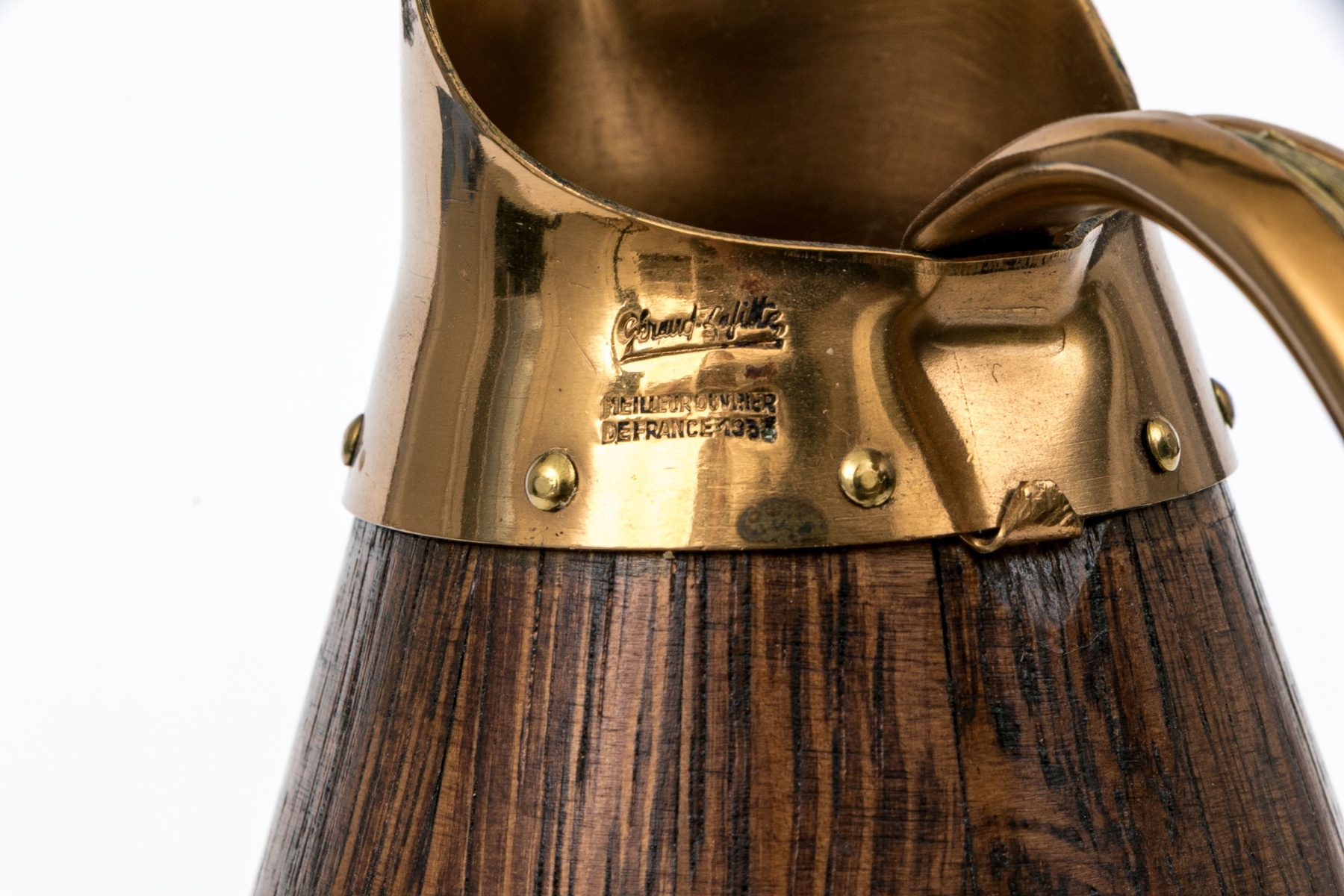 Brass bound wood. Of barrel form with brass handle and mounts.