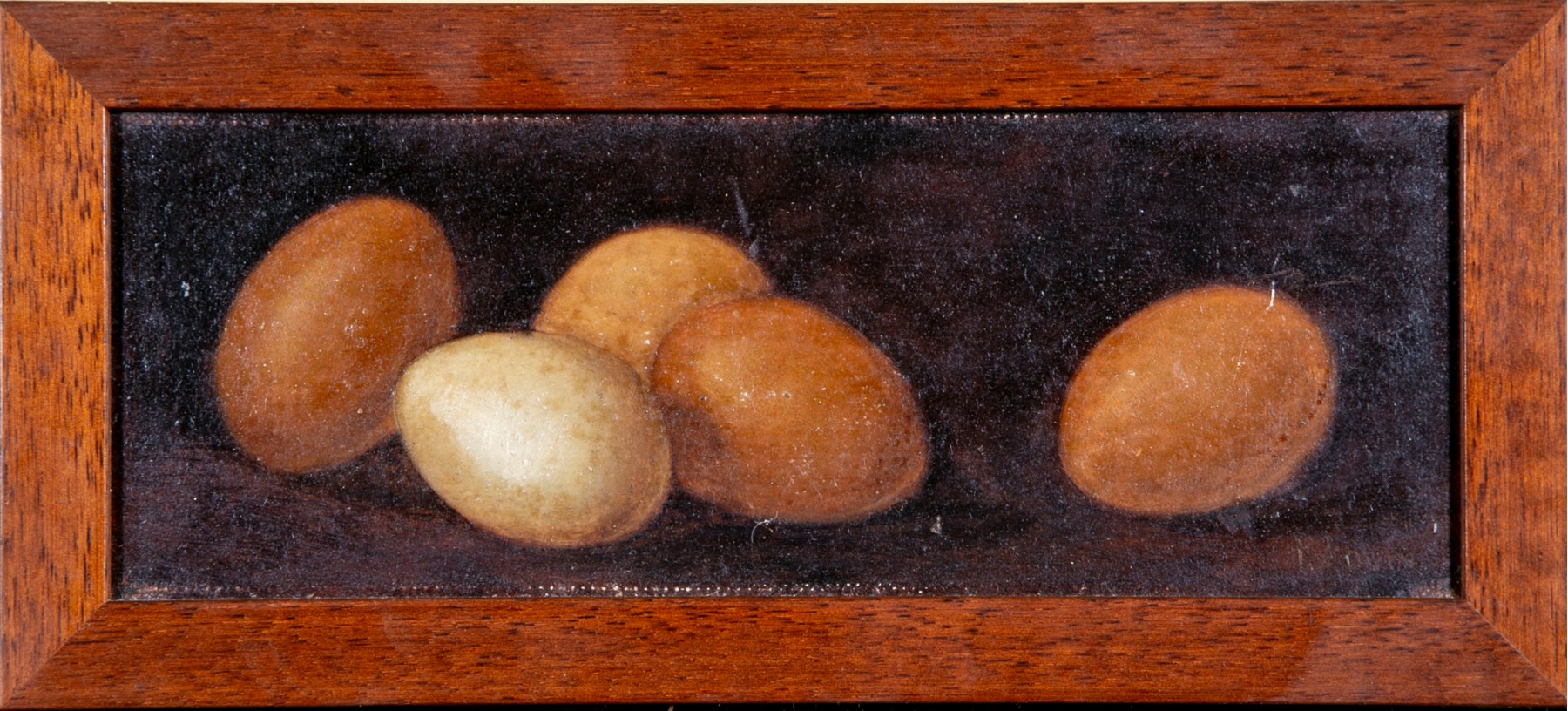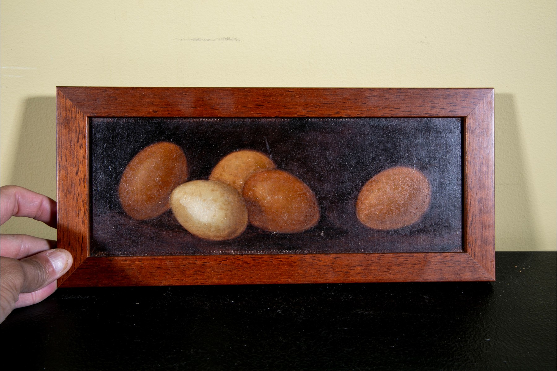 A small 11' x 5" oil on board still-life painting of five eggs. The painting is untitled and unsigned, presented in a simple wood frame, ready to hang.