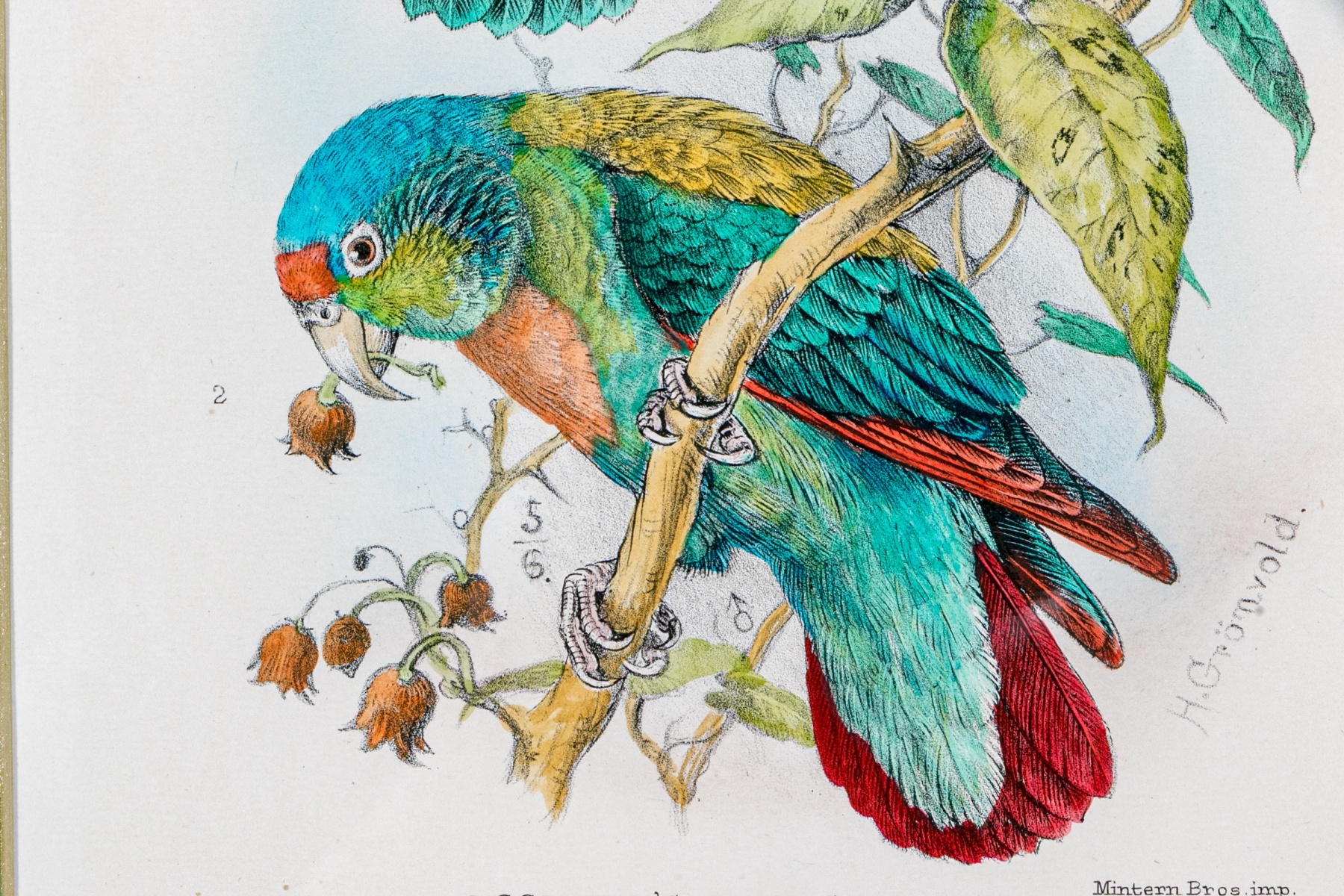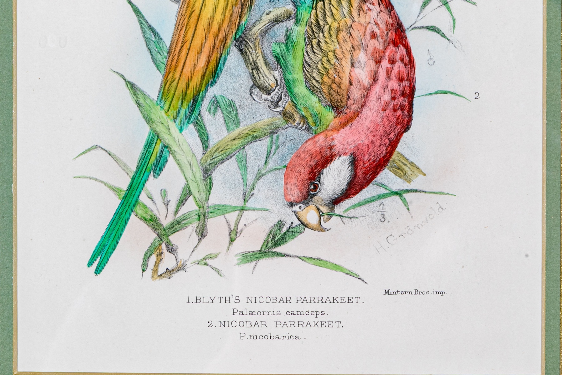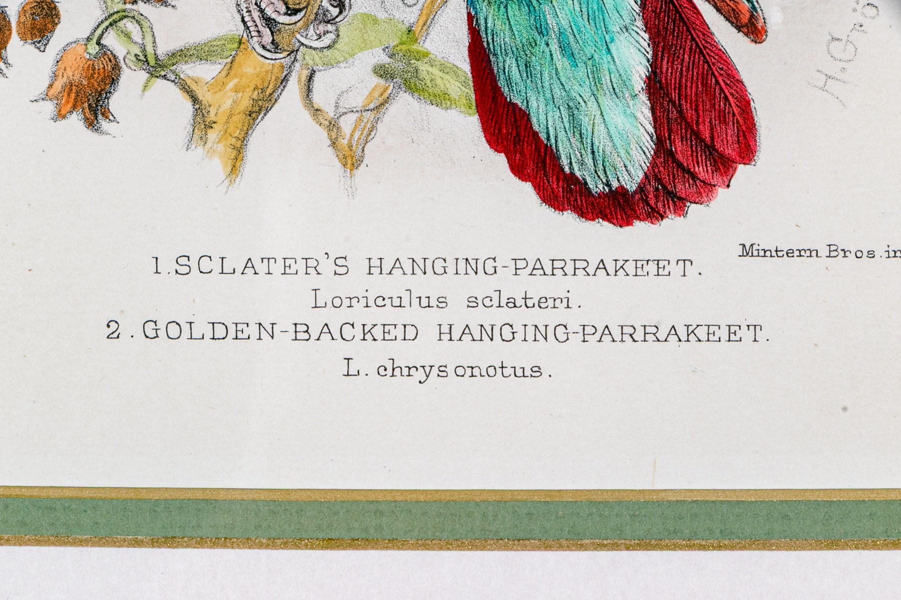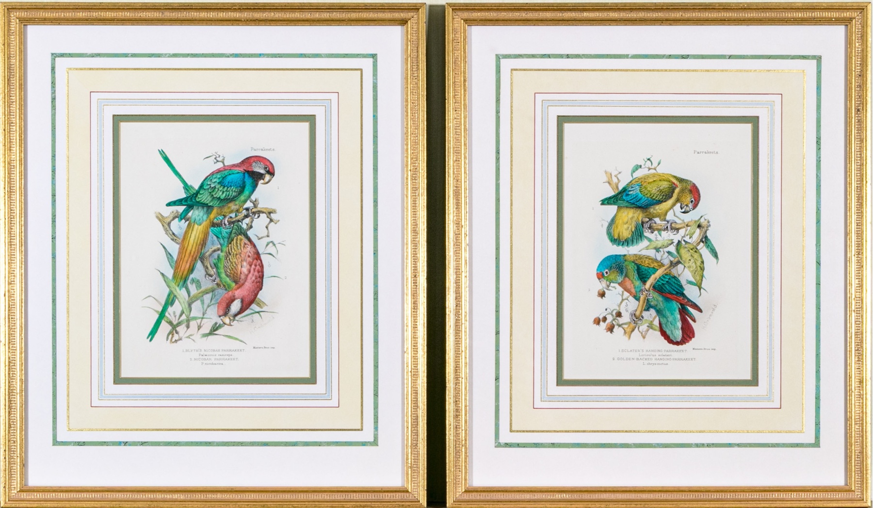 A gorgeous duo of Mintern Bros. after Henrik Gronvold (Danish, 1858-1940) prints depicting parakeets in vibrant color and rich detail including a Sclater's hanging parakeet, Golden-backed hanging parakeet, Blyth's Nicobar parakeet, and Nicobar parakeet.