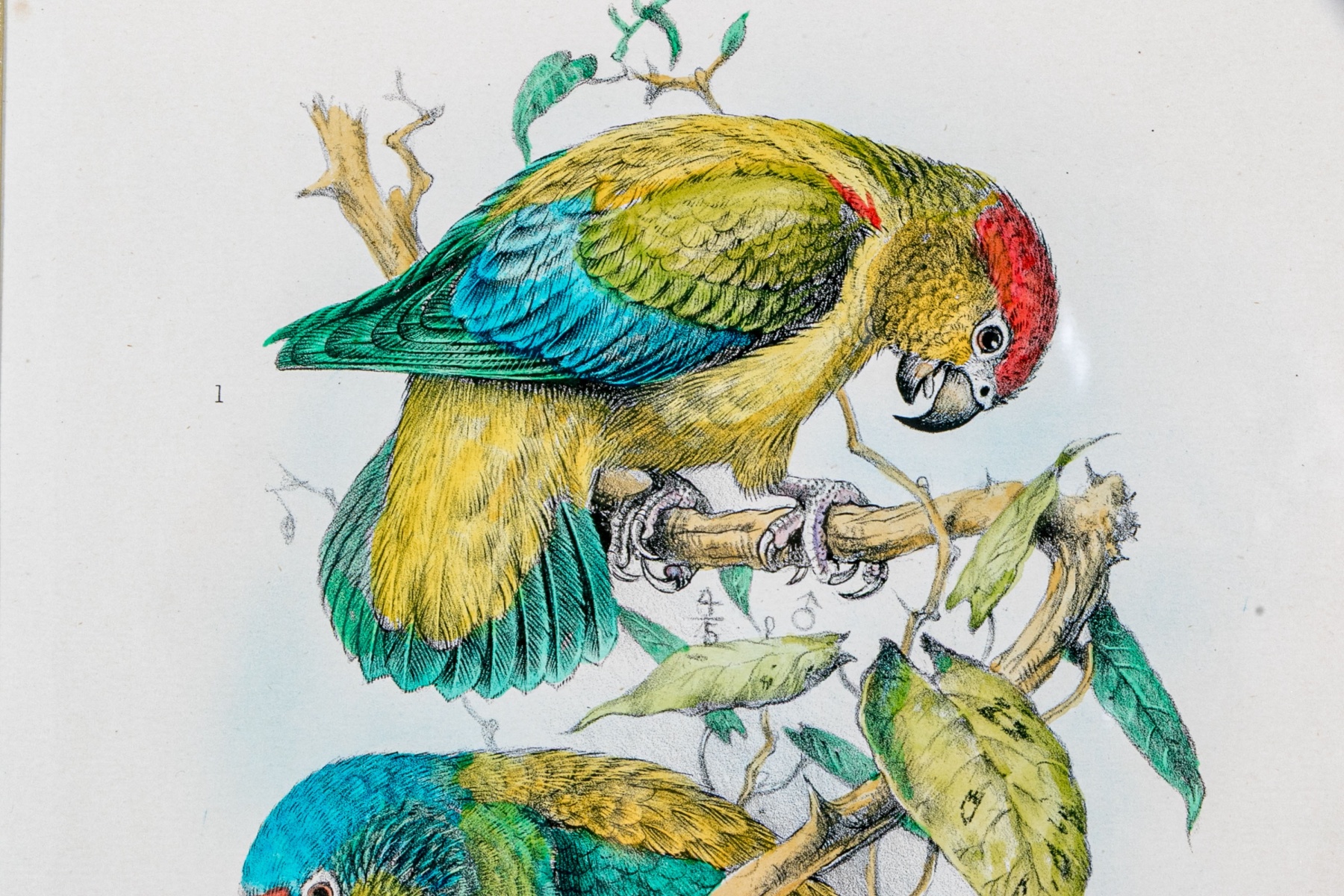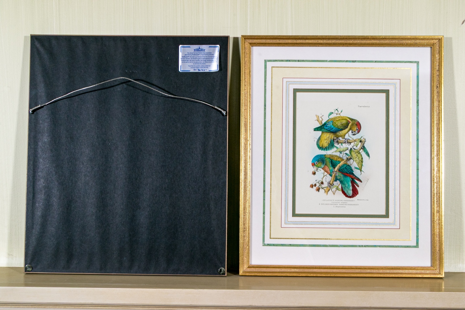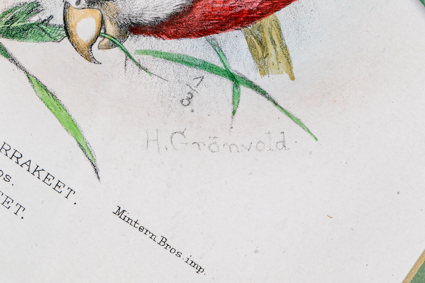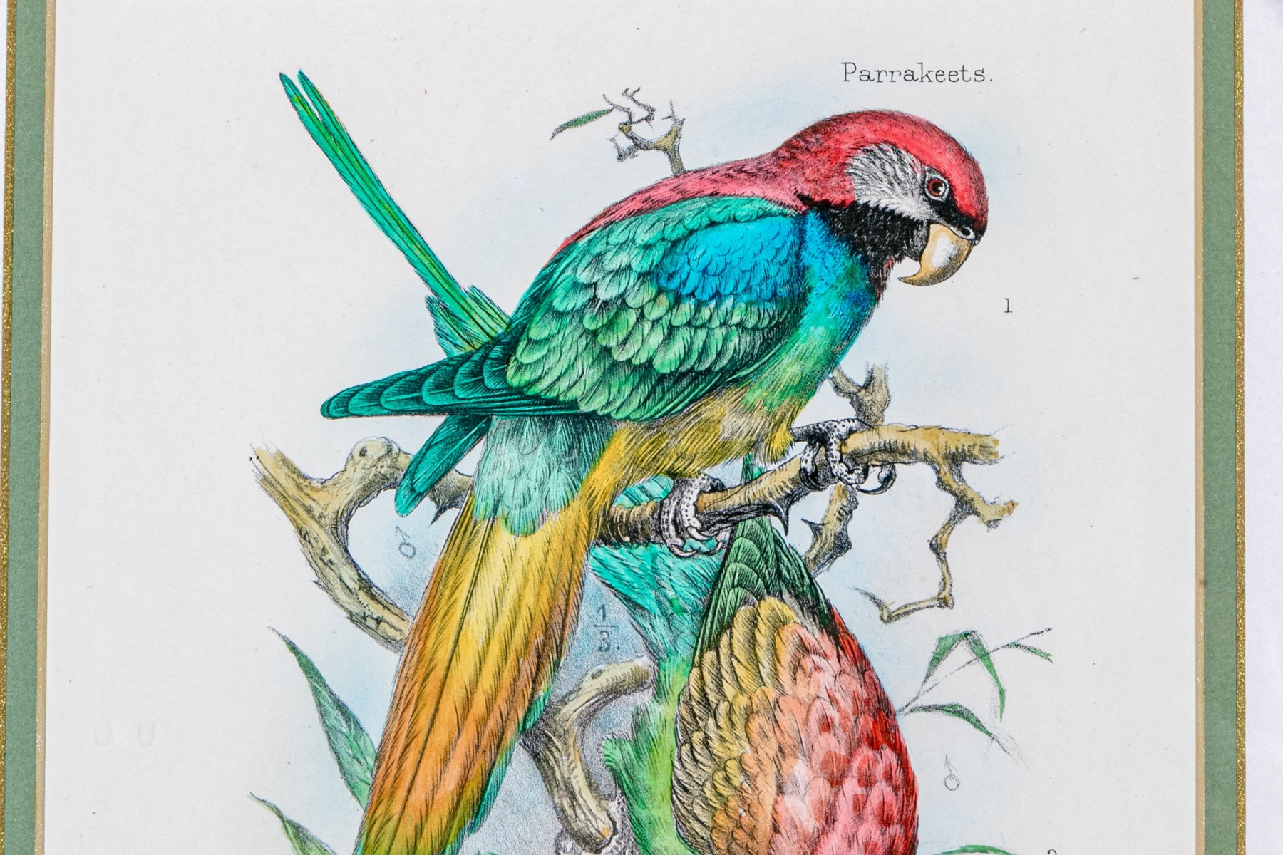 A gorgeous duo of Mintern Bros. after Henrik Gronvold (Danish, 1858-1940) prints depicting parakeets in vibrant color and rich detail including a Sclater's hanging parakeet, Golden-backed hanging parakeet, Blyth's Nicobar parakeet, and Nicobar parakeet.