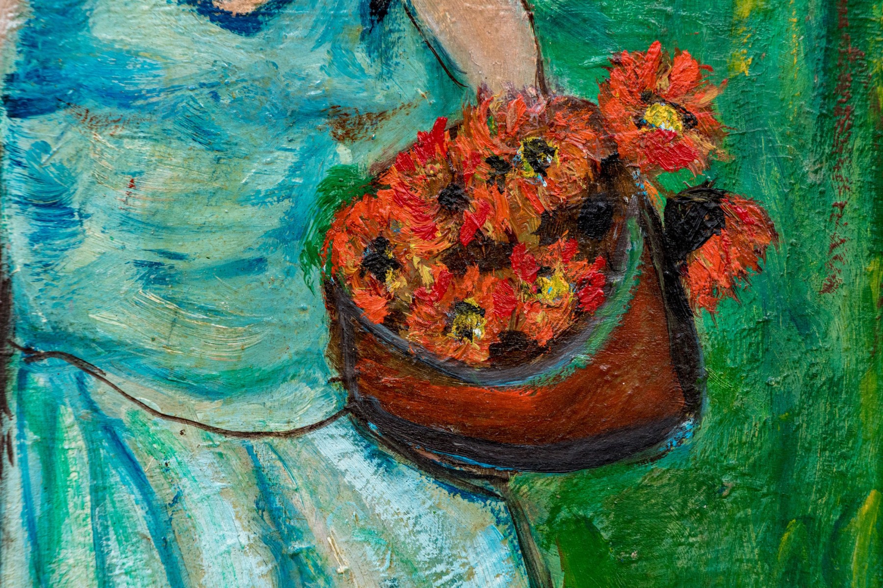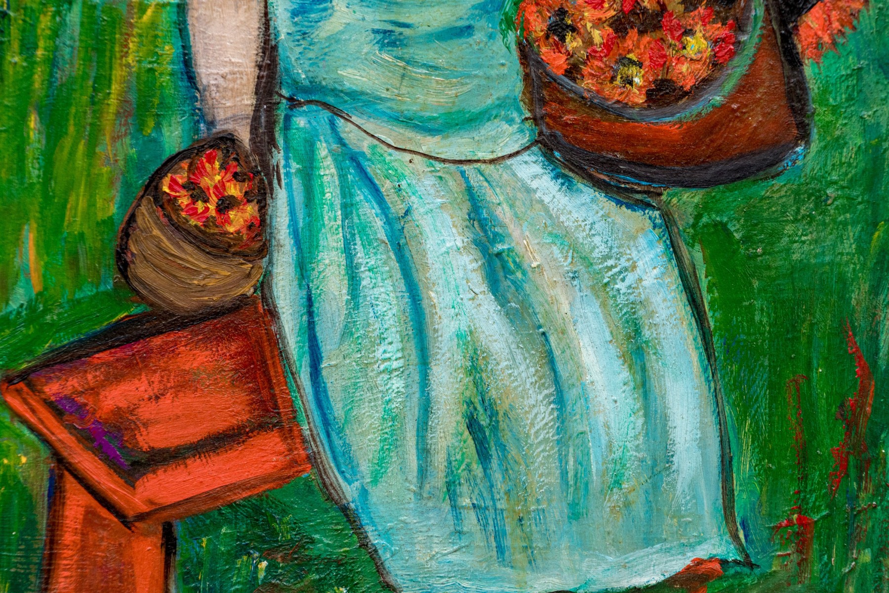Labeled on verso. A lady dressed in blue and seated in a landscape holds two baskets of orange flowers. Presented in a black frame.