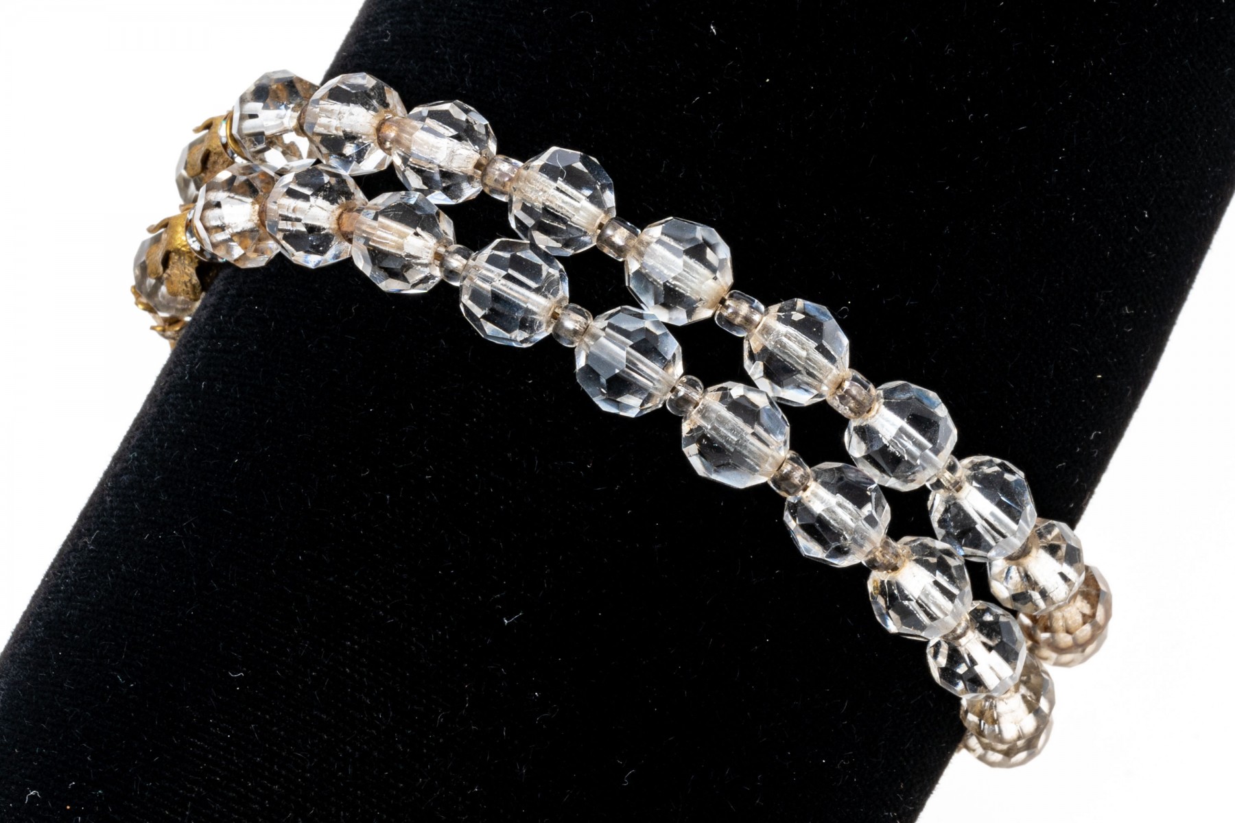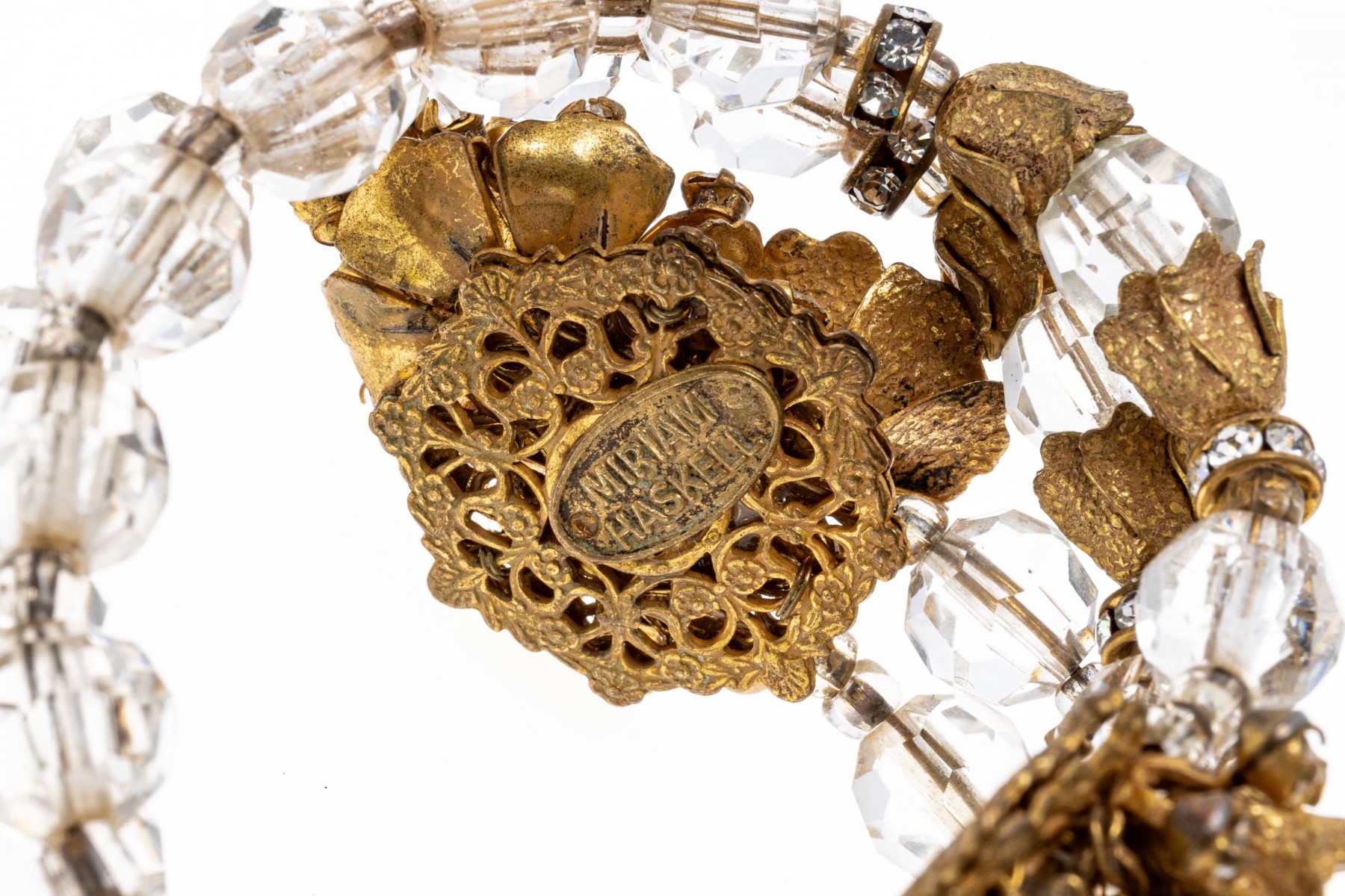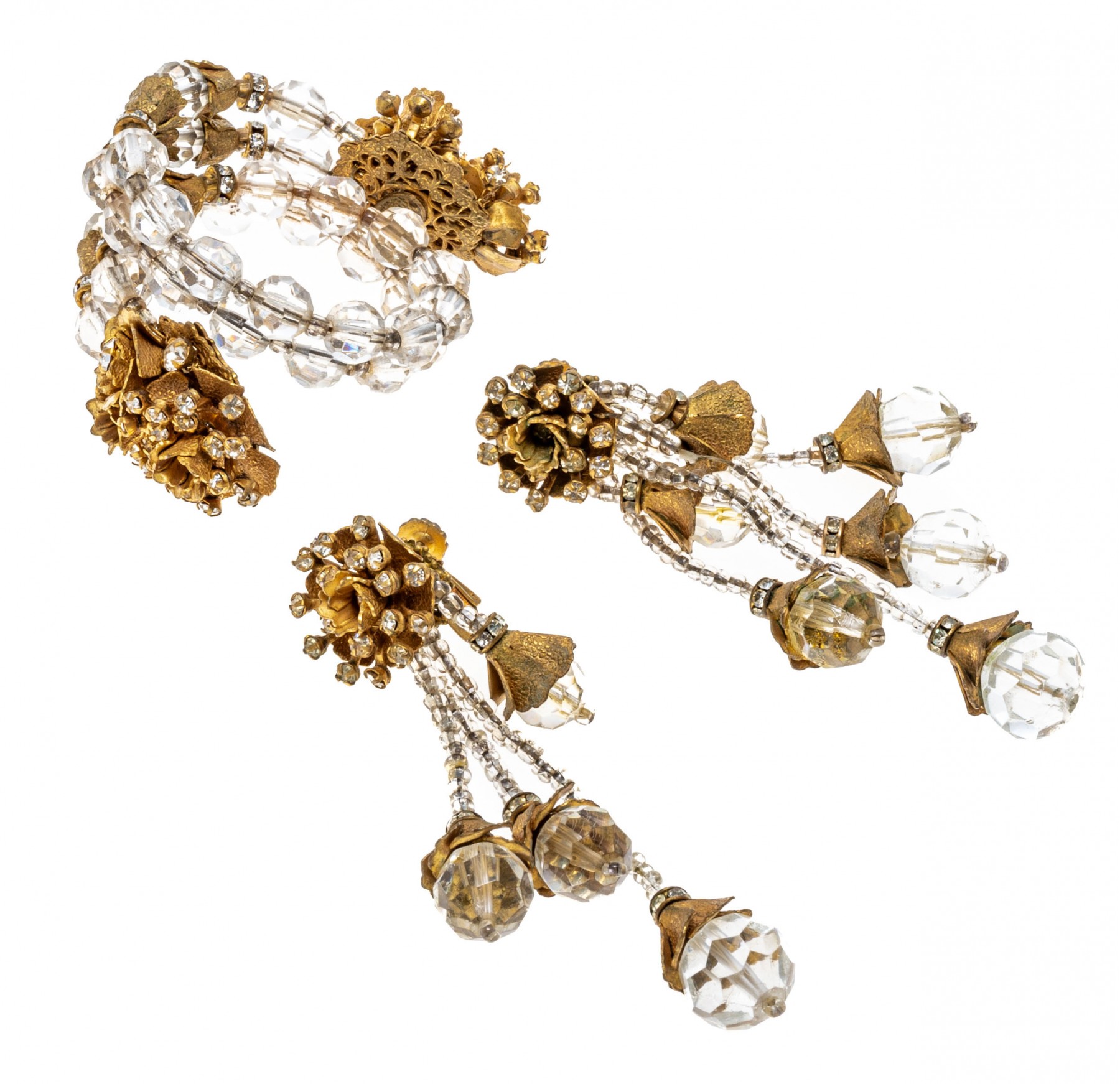Miriam Haskell stunning bracelet and earrings set. This wonderful vintage set by the esteemed Miriam Haskell features a double row wire crystal and rhinestone bead bracelet, finished with rhinestone set flower ends, paired with a pair of matching drop flower and beaded earrings