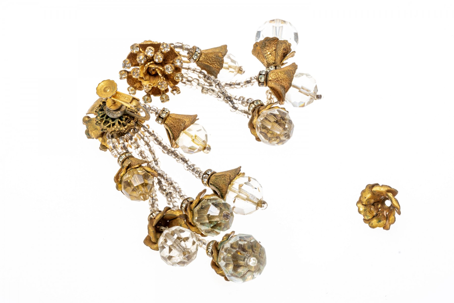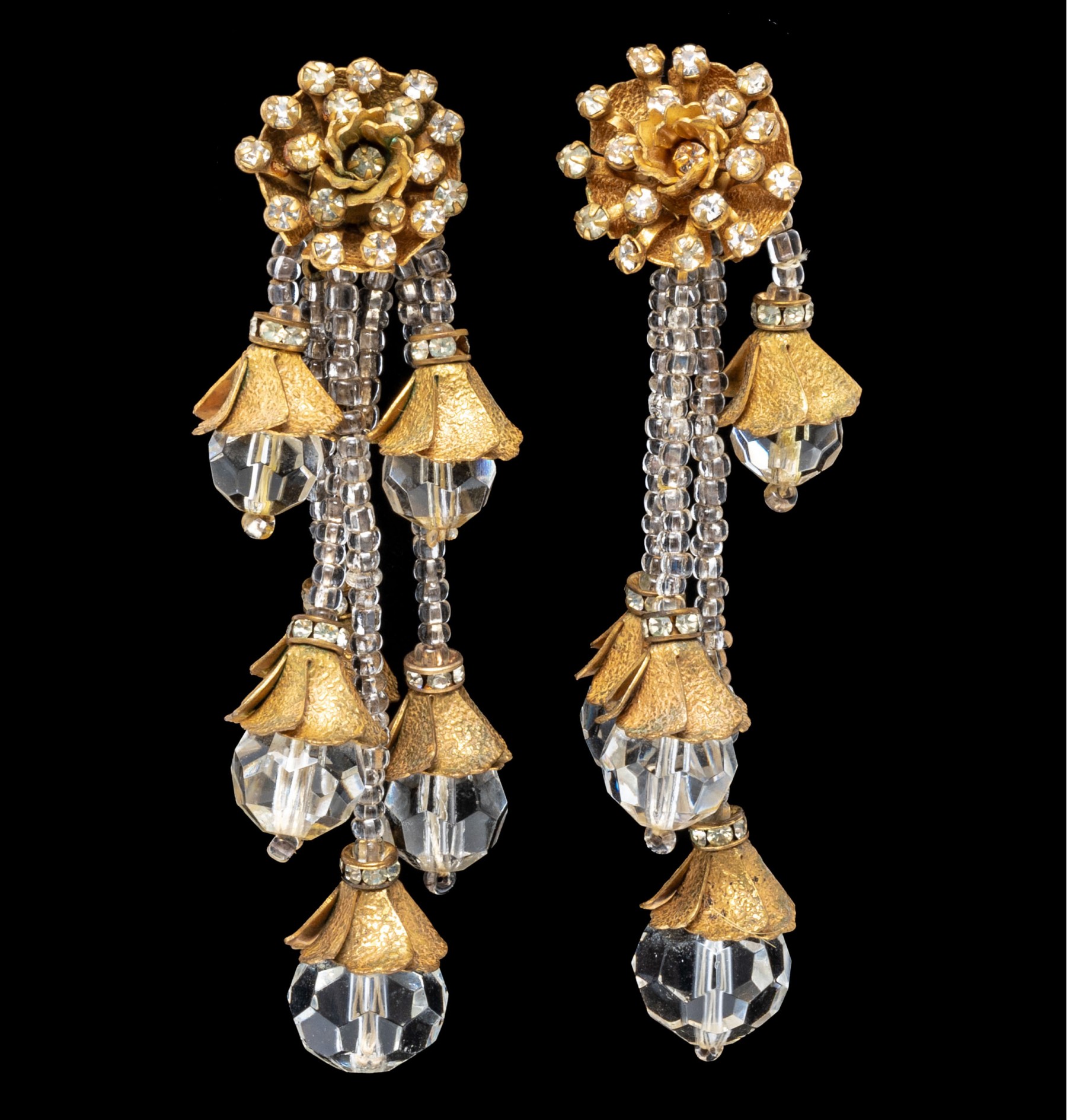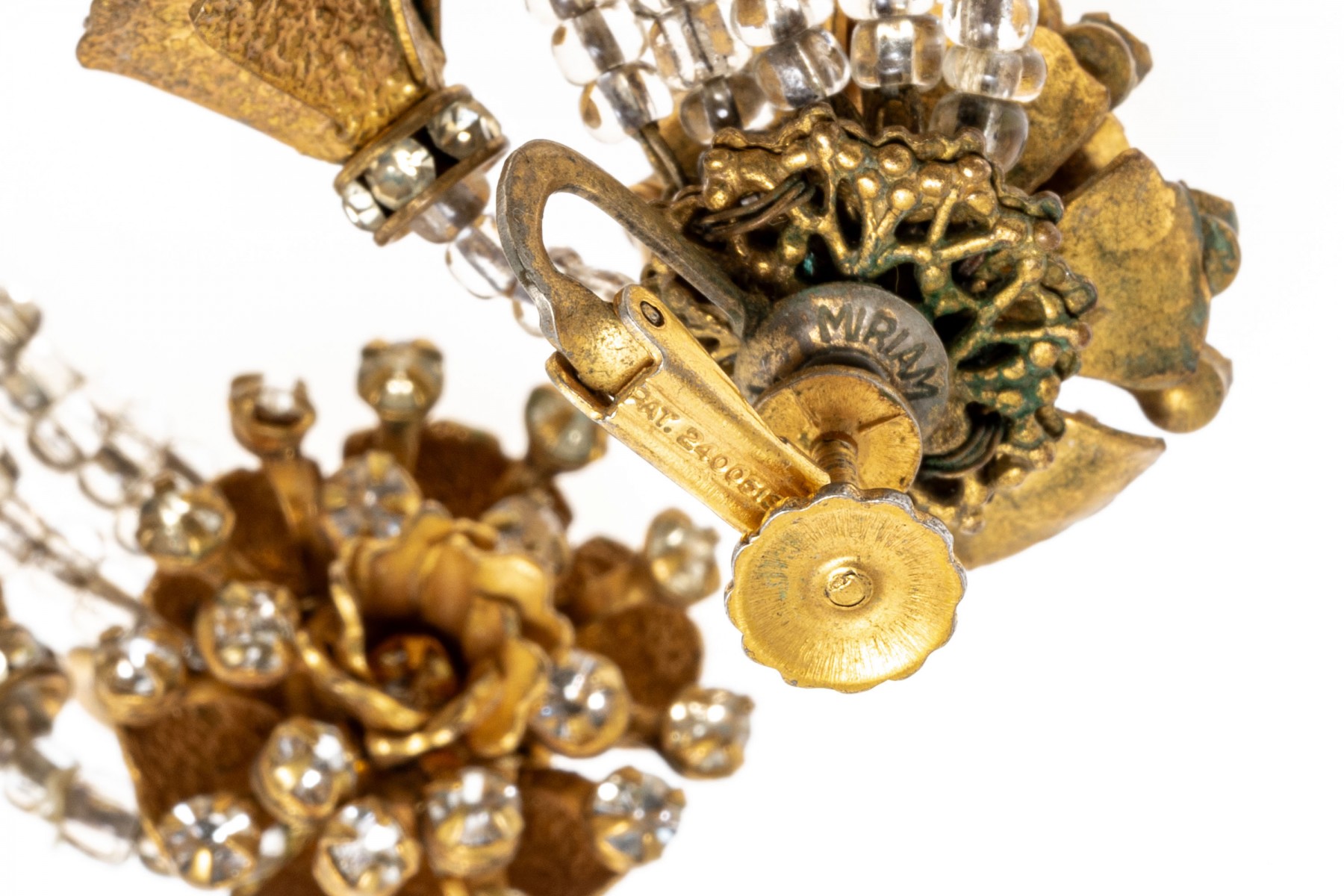 Miriam Haskell stunning bracelet and earrings set. This wonderful vintage set by the esteemed Miriam Haskell features a double row wire crystal and rhinestone bead bracelet, finished with rhinestone set flower ends, paired with a pair of matching drop flower and beaded earrings