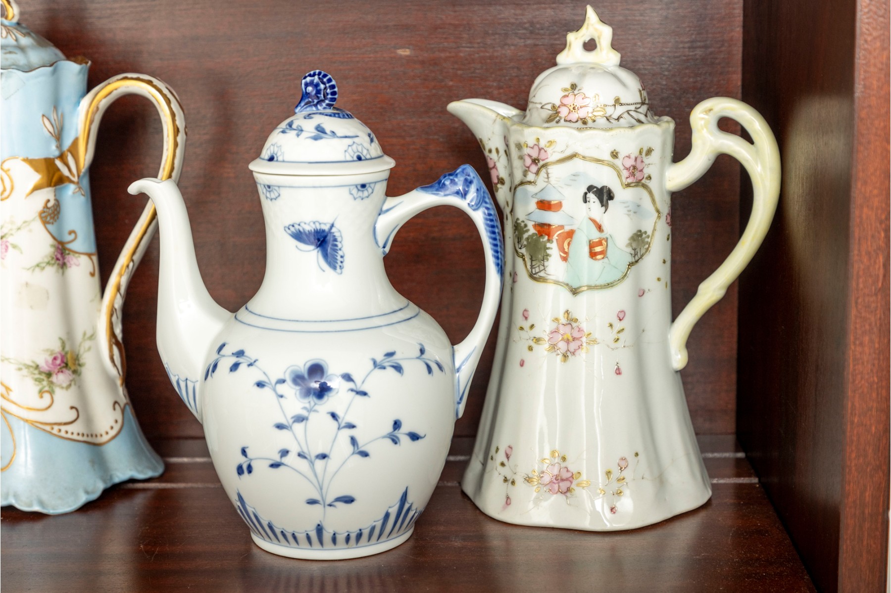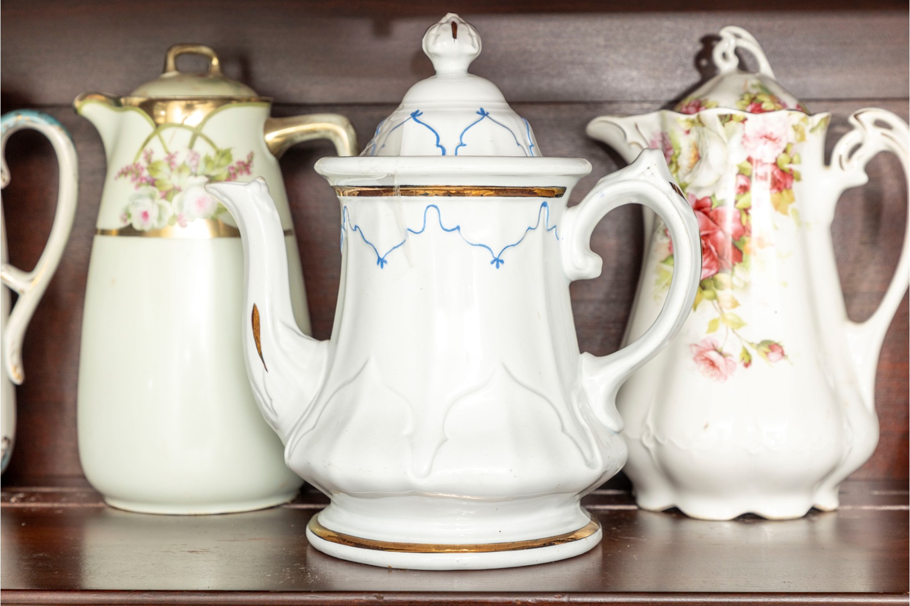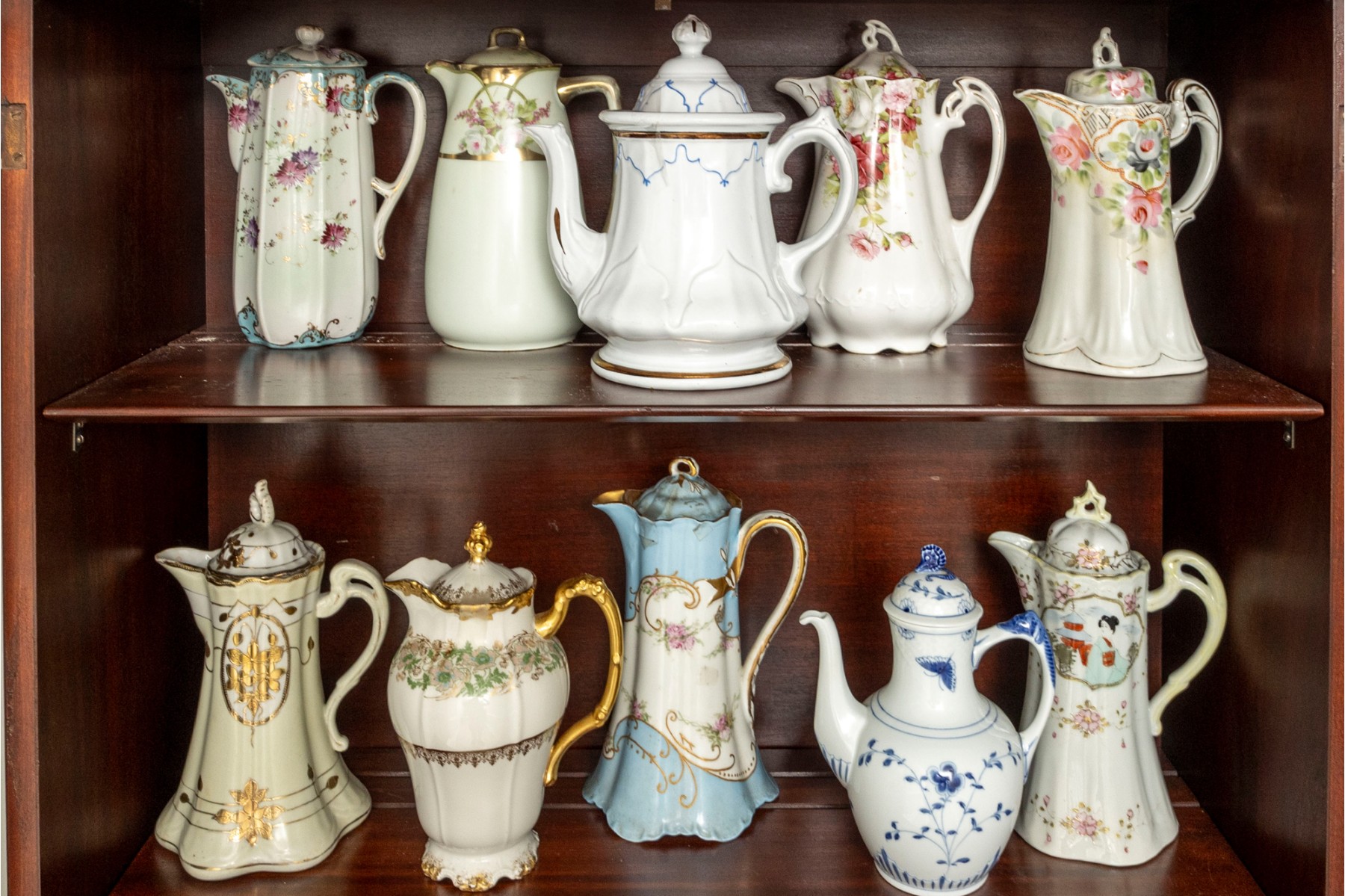 A collection of ten antique porcelain teapots. Varying makers. See photos for details.