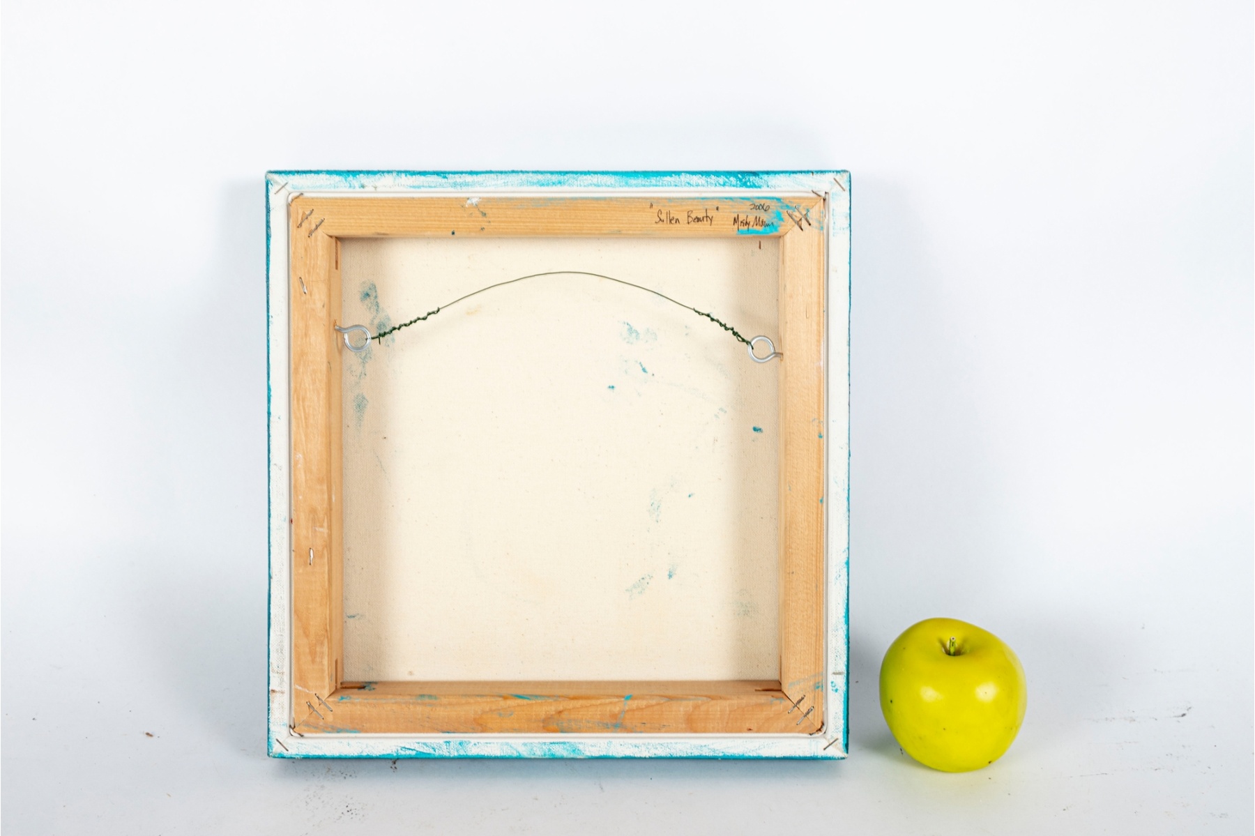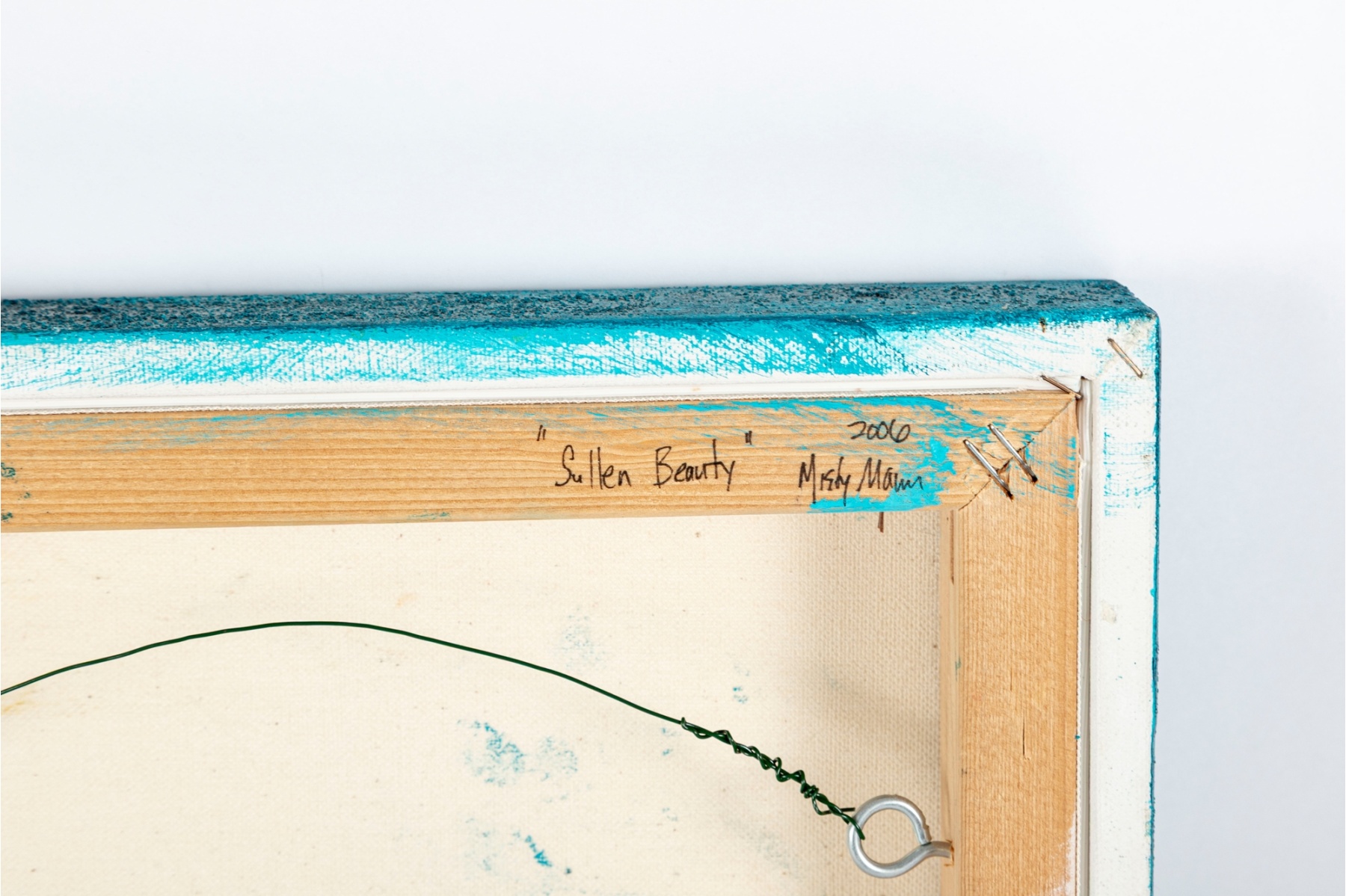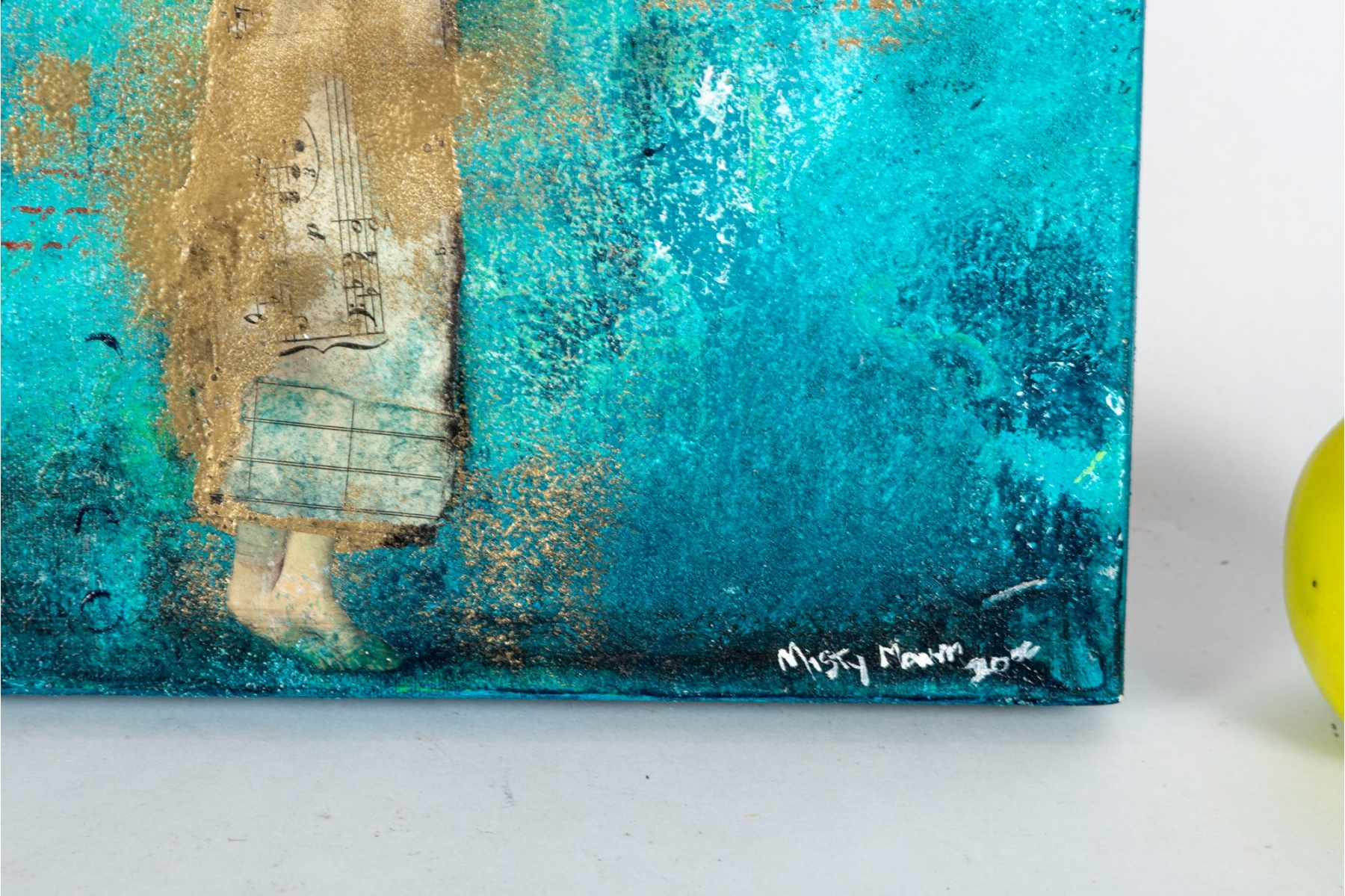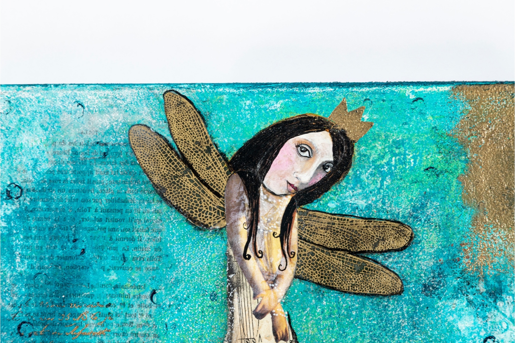 Whimsical mixed media painting by contemporary artist Misty Mawn, depicting a crowned, winged female figure against a textured teal and gold background. Characteristic of Mawn’s ethereal and expressive style, the work blends collage, paint, and metallic accents to create a dreamlike composition. Signed and dated “Misty Mawn 2006” lower right.