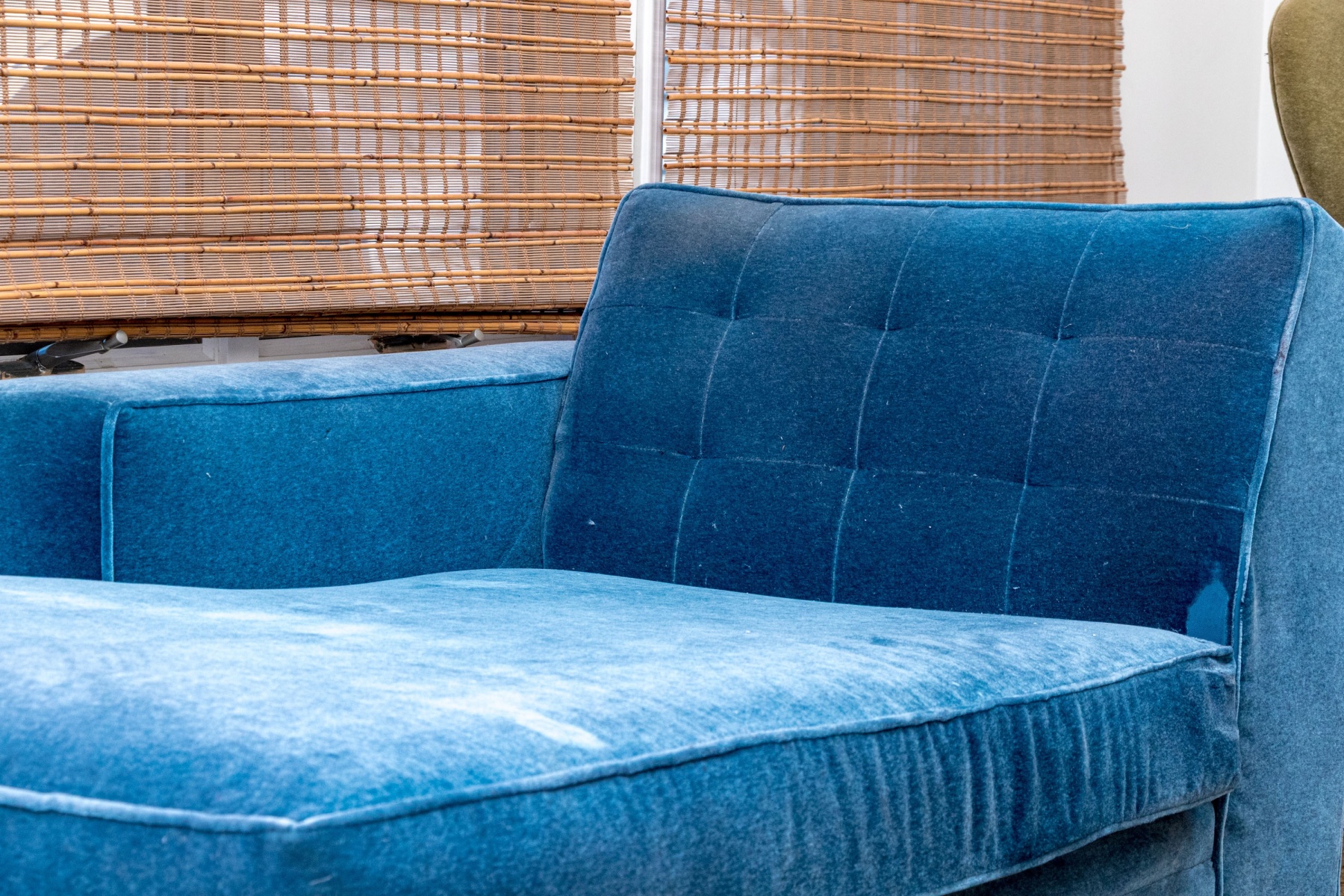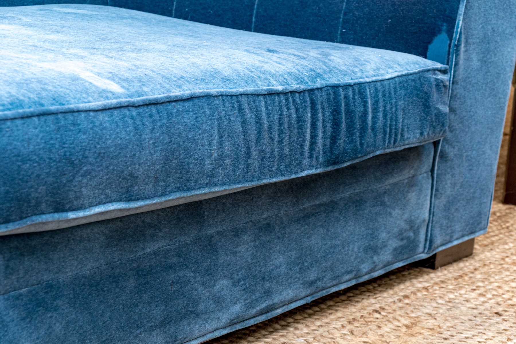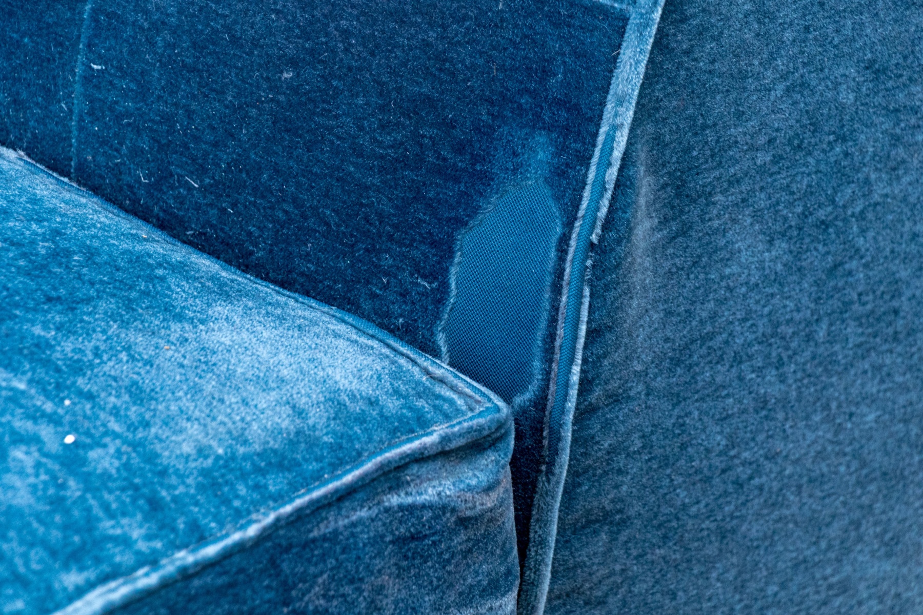 Worn upholstery with losses along the left lower trim of the seat back with an oval loss 4" L. Slightly sunned along the right arm trim. Overall still in good form and presents well.
